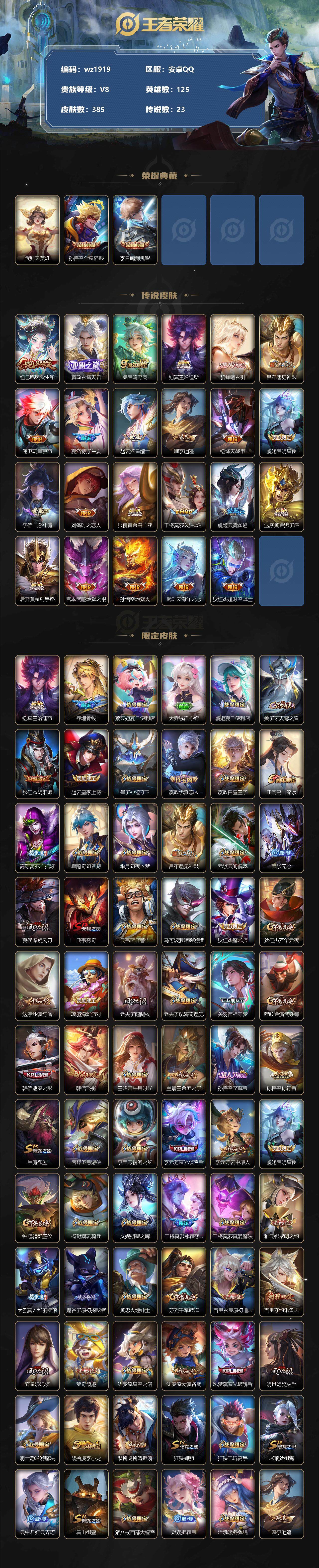 【账号佳】【王者荣耀】【编号:3339095】【可二次实名】【wz1919】安卓Q-V8-最强王者段位-125英雄-385皮肤-2典藏-0珍品无双-0无双-0珍品传说-23传说-115史诗 【英雄全皮】:嬴政全皮,刘禅全皮,沈梦溪全皮,狂铁全皮,蒙恬全皮,赵怀真全皮,戈娅全皮,空空儿全皮,影全皮 【荣耀典藏】:武则天英雄,孙悟空全息碎影,李白鸣剑曳影 【传说皮肤】:妲己愿照众生和,嬴政玄雷天君,桑启鸣野蒿,铠冥王哈迪斯,貂蝉曦玄引,吕布遇见神鼓,澜电玩雷克斯,夏洛特浮生妄,赵云淬星耀世,曜李逍遥 ,铠绛天战甲,虞姬启明星使,李信一念神魔,刘备时之恋人,张良黄金白羊座,干将莫邪久胜战神,虞姬云霓雀翎,达摩黄金狮子座,后羿黄金射手座,宫本武藏地狱之眼,孙悟空地狱火,武则天海洋之心,狄仁杰超时空战士 【限定皮肤】:铠冥王哈迪斯,暃埋骨钱,蔡文姬夏日便利店,大乔绒语心约,虞姬夏日便利店,姜子牙天穹之誓,狄仁杰阴阳师,赵云皇家上将,墨子神迹守卫,嬴政优雅恋人,嬴政白昼王子,庄周高山流水,高渐离死亡摇滚,扁鹊奇幻香踪,芈月幻夜卜梦,吕布遇见神鼓,元歌云间偶戏,元歌无心,夏侯惇朔风刀,典韦穷奇,典韦蓝屏警告,马可波罗暗影游猎,狄仁杰魔术师,狄仁杰万华元夜,达摩沙漠行僧,项羽海滩派对,老夫子醍醐杖,老夫子航海奇遇记,关羽百相守梦,程咬金演武夺筹,韩信逐梦之影,韩信飞衡,王昭君午后时光,兰陵王金庭之子,孙悟空至尊宝,孙悟空孙行者,牛魔御旌,后羿圣弓游侠,李元芳银河之约,李元芳匿光侦查者,李元芳云中旅人,虞姬启明星使,钟馗驱傩正仪,杨戬潮玩骑兵,女娲朔望之晖,干将莫邪冰霜恋舞曲,干将莫邪真爱魔法,雅典娜黎明之约,太乙真人华丽摇滚,鬼谷子原初探秘者,黄忠火炮绅士,苏烈千军破阵,百里玄策原初追逐者,百里守约朱雀志,弈星混沌棋,梦奇顽趣,沈梦溪星空之诺,沈梦溪大漠名商,沈梦溪匿光破解者,明世隐疑决卦,明世隐吟游魔法,裴擒虎李小龙,裴擒虎擒涛扼浪,狂铁御狮,狂铁电玩高手,米莱狄御霄,云中君纤云弄巧,盾山御銮,猪八戒西部大镖客,嫦娥拒霜思,嫦娥暖冬兔眠,曜李逍遥 ,西施玲珑珍味,鲁班大师探海日志,桑启海盐诗旅,夏洛特浮生妄,暃星界游侠,戈娅驭风魔法,艾琳女武神,艾琳流音漫舞,赵怀真鹤归松栖,司空震地狱燃心,阿古朵江河有灵,张良古海寻踪,蒙犽百解令,蒙恬荣光圣徽,高渐离燃音魔法,妲己灵卜魔法,鬼谷子天穹祈灯,伽罗琥珀纪元,貂蝉曦玄引,沈梦溪龙舞盛年,鲁班七号蔬乡物语,李元芳蔬乡物语,刘邦剑破天穹,上官婉儿群星魔术团,程咬金群星魔术团,镜青焰无极,项羽苍威无极,刘备异域游侠,周瑜熔金海岸 【年限皮肤】:百里守约朱雀志,韩信飞衡 【赛季限定】:夏侯惇朔风刀,典韦穷奇,狄仁杰万华元夜,达摩沙漠行僧,老夫子醍醐杖,程咬金演武夺筹,兰陵王金庭之子,张良古海寻踪,牛魔御旌,李元芳云中旅人,钟馗驱傩正仪,雅典娜黎明之约,鬼谷子原初探秘者,苏烈千军破阵,百里玄策原初追逐者,弈星混沌棋,梦奇顽趣,沈梦溪大漠名商,明世隐疑决卦,裴擒虎擒涛扼浪,狂铁御狮,米莱狄御霄,盾山御銮,鲁班大师探海日志,桑启海盐诗旅,鬼谷子天穹祈灯,蒙恬荣光圣徽,刘邦剑破天穹,姜子牙天穹之誓 【战令限定】:墨子神迹守卫,蔡文姬夏日便利店,虞姬夏日便利店,嬴政白昼王子,扁鹊奇幻香踪,芈月幻夜卜梦,元歌云间偶戏,典韦蓝屏警告,马可波罗暗影游猎,老夫子航海奇遇记,王昭君午后时光,艾琳流音漫舞,后羿圣弓游侠,李元芳银河之约,杨戬潮玩骑兵,女娲朔望之晖,干将莫邪真爱魔法,黄忠火炮绅士,沈梦溪星空之诺,明世隐吟游魔法,狂铁电玩高手,猪八戒西部大镖客,嫦娥暖冬兔眠,西施玲珑珍味,司空震地狱燃心,暃星界游侠,戈娅驭风魔法,高渐离燃音魔法,妲己灵卜魔法,鲁班七号蔬乡物语,李元芳蔬乡物语,镜青焰无极,项羽苍威无极 【史诗皮肤】:鲁班七号电玩小子,项羽苍穹之光,露娜紫霞仙子,阿轲暗夜猫娘,赵云皇家上将,赵云未来纪元,貂蝉圣诞恋歌,甄姬冰雪圆舞曲,王昭君偶像歌手,狄仁杰魔术师,廉颇地狱岩魂,宫本武藏鬼剑武藏,孙尚香水果甜心,嬴政优雅恋人,嬴政暗夜贵公子,嬴政摇滚巨星,妲己魅力维加斯,妲己女仆咖啡,墨子龙骑士,墨子金属风暴,吕布圣诞狂欢,刘禅绅士熊喵,曹操幽灵船长,李白千年之狐,吕布末日机甲,张飞乱世虎臣,韩信白龙吟,孙悟空至尊宝,花木兰水晶猎龙者,刘邦德古拉伯爵,韩信逐梦之影,夏侯惇乘风破浪,小乔缤纷独角兽,兰陵王暗隐猎兽者,诸葛亮黄金分割率,亚瑟心灵战警,雅典娜冰冠公主,安琪拉心灵骇客,百里守约特工魅影,铠曙光守护者,蔡文姬舞动绿茵,刘禅天才门将,李元芳逐浪之夏,程咬金功夫厨神,白起星夜王子,阿轲节奏热浪,嬴政白昼王子,孙策猫狗日记,大乔猫狗日记,百里守约朱雀志,干将莫邪冰霜恋舞曲,典韦蓝屏警告,伽罗箭羽风息,狄仁杰鹰眼统帅,李元芳银河之约,韩信飞衡,大乔白蛇,小乔青蛇,不知火舞魅