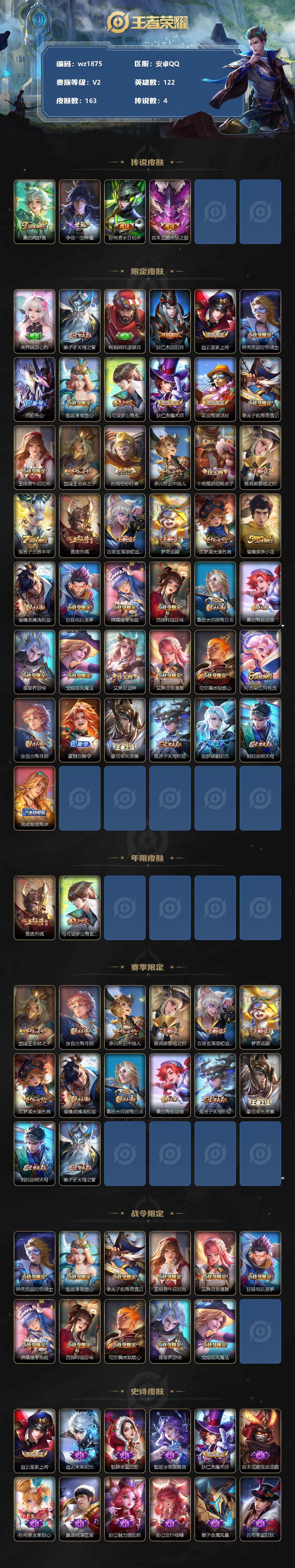 【账号佳】【王者荣耀】【编号:3339136】【可二次实名】【wz1875】安卓Q-V2-至尊星耀I段位-122英雄-163皮肤-0典藏-0珍品无双-0无双-0珍品传说-4传说-49史诗 【传说皮肤】:桑启鸣野蒿,李信一念神魔,孙尚香末日机甲,宫本武藏地狱之眼 【限定皮肤】:大乔绒语心约,姜子牙天穹之誓,杨戬破阵退雄兵,狄仁杰阴阳师,赵云皇家上将,钟无艳超时空战士,元歌无心,甄姬落雪兰心,马可波罗山海玄木吟,狄仁杰魔术师,项羽海滩派对,老夫子航海奇遇记,王昭君午后时光,兰陵王金庭之子,孙悟空孙行者,李元芳云中旅人,干将莫邪胡桃夹子,雅典娜黎明之约,鬼谷子五谷丰年,黄忠烈魂,百里玄策原初追逐者,梦奇顽趣,沈梦溪大漠名商,裴擒虎李小龙,裴擒虎擒涛扼浪,狂铁电玩高手,嫦娥暖冬兔眠,西施玲珑珍味,鲁班大师探海日志,桑启海盐诗旅,暃星界游侠,戈娅驭风魔法,艾琳女武神,艾琳流音漫舞,司空震地狱燃心,阿古朵江河有灵,张良古海寻踪,蒙犽百解令,蒙恬荣光圣徽,鬼谷子天穹祈灯,伽罗琥珀纪元,刘邦剑破天穹,周瑜熔金海岸 【年限皮肤】:黄忠烈魂,马可波罗山海玄木吟 【赛季限定】:兰陵王金庭之子,张良古海寻踪,李元芳云中旅人,雅典娜黎明之约,百里玄策原初追逐者,梦奇顽趣,沈梦溪大漠名商,裴擒虎擒涛扼浪,鲁班大师探海日志,桑启海盐诗旅,鬼谷子天穹祈灯,蒙恬荣光圣徽,刘邦剑破天穹,姜子牙天穹之誓 【战令限定】:钟无艳超时空战士,甄姬落雪兰心,老夫子航海奇遇记,王昭君午后时光,艾琳流音漫舞,狂铁电玩高手,嫦娥暖冬兔眠,西施玲珑珍味,司空震地狱燃心,暃星界游侠,戈娅驭风魔法 【史诗皮肤】:赵云皇家上将,赵云未来纪元,貂蝉圣诞恋歌,甄姬冰雪圆舞曲,狄仁杰魔术师,宫本武藏鬼剑武藏,孙尚香水果甜心,嬴政摇滚巨星,妲己魅力维加斯,妲己女仆咖啡,墨子金属风暴,吕布圣诞狂欢,曹操幽灵船长,花木兰水晶猎龙者,刘邦德古拉伯爵,夏侯惇乘风破浪,兰陵王暗隐猎兽者,亚瑟心灵战警,安琪拉心灵骇客,百里守约特工魅影,蔡文姬舞动绿茵,李元芳逐浪之夏,程咬金功夫厨神,阿轲节奏热浪,大乔猫狗日记,狄仁杰鹰眼统帅,娜可露露晚萤,橘右京修罗,黄忠烈魂,百里玄策原初追逐者,裴擒虎李小龙,老夫子航海奇遇记,孙悟空孙行者,雅典娜黎明之约,狂铁电玩高手,钟无艳超时空战士,鬼谷子五谷丰年,元歌无心,梦奇顽趣,暃星界游侠,马可波罗山海玄木吟,刘禅电玩爆裂旋风,戈娅驭风魔法,司空震地狱燃心,阿古朵江河有灵,蒙犽百解令,蒙恬荣光圣徽,伽罗琥珀纪元,牛魔星界战将 【其他皮肤】:项羽海滩派对,韩信街头霸王,阿轲爱心护理,赵云忍炎影,芈月红桃皇后,艾琳女武神,白起白色死神,扁鹊化身博士,姜子牙时尚教父,典韦黄金武士,亚瑟死亡骑士,达摩拳王,花木兰兔女郎,张飞五福同心,甄姬花好人间,刘备万事如意,狄仁杰阴阳师,墨子进击墨子号,李白敏锐之力,苏烈坚韧之力,明世隐虹云星官,小乔丁香结,吕布野性能量,孙膑归虚梦演,姜子牙炽热元素使,盾山圆桌骑士,狂铁特工战影,鲁班大师乓乓大师,干将莫邪胡桃夹子,兰陵王金庭之子,刘禅唤灵魔甲,王昭君午后时光,沈梦溪大漠名商,蒙犽胡桃狂想曲,蒙恬蔚蓝守将,甄姬落雪兰心,李元芳云中旅人,戈娅危途狂花,刘备潮玩造梦师,桑启海盐诗旅,嫦娥暖冬兔眠,海月幻泉雾影,猪八戒潮玩探月行,牛魔牛运亨通,裴擒虎擒涛扼浪,太乙真人劲辣红锅,莱西奥西部游侠,鲁班大师探海日志,西施玲珑珍味,李元芳妄想特派,艾琳流音漫舞,张良古海寻踪,钟无艳聚星闪耀,海月王牌新星,亚连破局者,兰陵王幻夜行动,后羿完美运算,鬼谷子天穹祈灯,海诺时空谍影,刘邦剑破天穹,杨戬破阵退雄兵,姜子牙天穹之誓,周瑜熔金海岸,大乔绒语心约,东皇太一噬灭天穹,西施雪境奇遇,钟馗虚灵犬护,张良灵野札记,露娜命运加冕,白起死霸装,高渐离金属狂潮,露娜绯红之刃,老夫子潮流仙人,王昭君精灵公主,狄仁杰锦衣卫,曹操超能战警,李白范海辛,钟馗地府判官,李元芳特种部队,虞姬加勒比小姐,蔡文姬蔷薇王座,马可波罗激情绿茵,苍维京掠夺者,诸葛亮星航指挥官,东皇太一东海龙王,干将莫邪第七人偶,铠龙域领主,百里守约绝影神枪,百里玄策威尼斯狂欢,公孙离花间舞,杨玉环霓裳曲,裴擒虎街头旋风,米莱狄精准探案法,孙策海之征途,司马懿魇语军师,盾山极冰防御线,沈梦溪棒球奇才,李信灼热之刃,上官婉儿修竹墨客,盘古创世神祝,云中君荷鲁斯之眼,曜归虚梦演,马超幸存者,鲁班大师归虚梦演,镜冰刃幻境,阿古朵熊喵少女,澜孤猎,司空震启蛰,云缨赤焰之缨,金蝉前尘 【内测皮肤】:艾琳女武神,狂铁特工战影,干将莫邪胡桃夹子 【营地ID】:1827792510