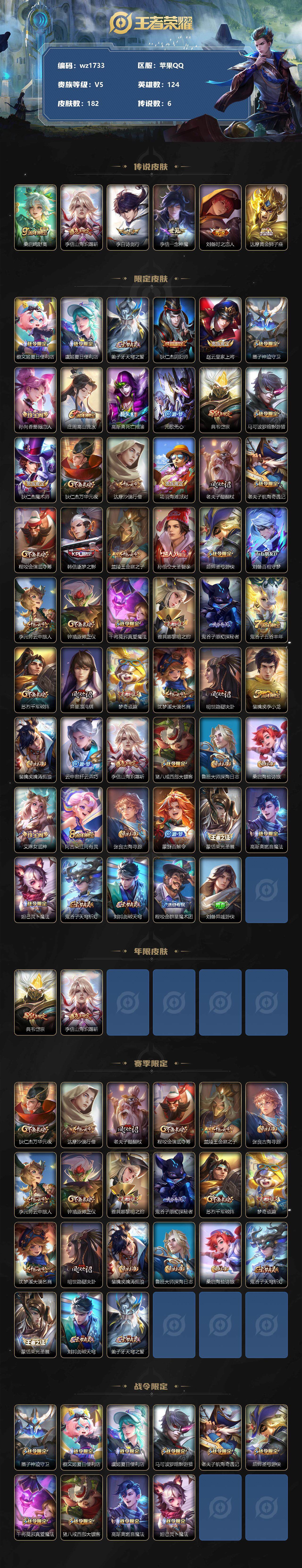 【账号佳】【王者荣耀】【编号:3339268】【可二次实名】【wz1733】【商品标题】:苹果Q-V5-尊贵铂金II段位-124英雄-182皮肤-0典藏-0珍品无双-0无双-0珍品传说-6传说-43史诗 【英雄全皮】:李信全皮 【传说皮肤】:桑启鸣野蒿,李信山海炽霜斩,李白诗剑行,李信一念神魔,刘备时之恋人,达摩黄金狮子座 【限定皮肤】:蔡文姬夏日便利店,虞姬夏日便利店,姜子牙天穹之誓,狄仁杰阴阳师,赵云皇家上将,墨子神迹守卫,孙尚香蔷薇恋人,庄周高山流水,高渐离死亡摇滚,元歌无心,典韦岱宗,马可波罗暗影游猎,狄仁杰魔术师,狄仁杰万华元夜,达摩沙漠行僧,项羽海滩派对,老夫子醍醐杖,老夫子航海奇遇记,程咬金演武夺筹,韩信逐梦之影,兰陵王金庭之子,孙悟空大圣娶亲,后羿圣弓游侠,刘备百相守梦,李元芳云中旅人,钟馗驱傩正仪,干将莫邪真爱魔法,雅典娜黎明之约,鬼谷子原初探秘者,鬼谷子五谷丰年,苏烈千军破阵,弈星混沌棋,梦奇顽趣,沈梦溪大漠名商,明世隐疑决卦,裴擒虎李小龙,裴擒虎擒涛扼浪,云中君纤云弄巧,李信山海炽霜斩,猪八戒西部大镖客,鲁班大师探海日志,桑启海盐诗旅,艾琳女武神,阿古朵江河有灵,张良古海寻踪,蒙犽百解令,蒙恬荣光圣徽,高渐离燃音魔法,妲己灵卜魔法,鬼谷子天穹祈灯,刘邦剑破天穹,程咬金群星魔术团,刘备异域游侠 【年限皮肤】:典韦岱宗,李信山海炽霜斩 【赛季限定】:狄仁杰万华元夜,达摩沙漠行僧,老夫子醍醐杖,程咬金演武夺筹,兰陵王金庭之子,张良古海寻踪,李元芳云中旅人,钟馗驱傩正仪,雅典娜黎明之约,鬼谷子原初探秘者,苏烈千军破阵,弈星混沌棋,梦奇顽趣,沈梦溪大漠名商,明世隐疑决卦,裴擒虎擒涛扼浪,鲁班大师探海日志,桑启海盐诗旅,鬼谷子天穹祈灯,蒙恬荣光圣徽,刘邦剑破天穹,姜子牙天穹之誓 【战令限定】:墨子神迹守卫,蔡文姬夏日便利店,虞姬夏日便利店,马可波罗暗影游猎,老夫子航海奇遇记,后羿圣弓游侠,干将莫邪真爱魔法,猪八戒西部大镖客,高渐离燃音魔法,妲己灵卜魔法 【史诗皮肤】:露娜紫霞仙子,赵云皇家上将,赵云未来纪元,貂蝉圣诞恋歌,甄姬冰雪圆舞曲,狄仁杰魔术师,宫本武藏鬼剑武藏,孙尚香蔷薇恋人,孙尚香水果甜心,妲己魅力维加斯,墨子金属风暴,李白千年之狐,吕布末日机甲,韩信白龙吟,花木兰水晶猎龙者,韩信逐梦之影,夏侯惇乘风破浪,兰陵王暗隐猎兽者,亚瑟心灵战警,百里守约特工魅影,刘禅天才门将,李元芳逐浪之夏,孙悟空大圣娶亲,狄仁杰鹰眼统帅,典韦岱宗,橘右京修罗,马可波罗暗影游猎,裴擒虎李小龙,云中君纤云弄巧,老夫子航海奇遇记,干将莫邪真爱魔法,庄周高山流水,雅典娜黎明之约,鬼谷子五谷丰年,元歌无心,梦奇顽趣,刘备百相守梦,刘禅电玩爆裂旋风,阿古朵江河有灵,蒙犽百解令,妲己灵卜魔法,高渐离燃音魔法,蒙恬荣光圣徽,蔡文姬夏日便利店 【其他皮肤】:项羽海滩派对,韩信教廷特使,韩信街头霸王,阿轲爱心护理,达摩大发明家,赵云白执事,赵云忍炎影,芈月红桃皇后,艾琳女武神,白起白色死神,牛魔西部大镖客,扁鹊救世之瞳,宫本武藏未来纪元,安琪拉玩偶对对碰,孙膑天使之翼,姜子牙时尚教父,典韦黄金武士,亚瑟死亡骑士,花木兰兔女郎,张飞五福同心,甄姬花好人间,刘备万事如意,宫本武藏万象初新,后羿阿尔法小队,狄仁杰阴阳师,刘备纽约教父,高渐离死亡摇滚,刘备汉昭烈帝,关羽龙腾万里,钟无艳海滩丽影,狂铁命运角斗场,老夫子功夫老勺,孙尚香沉稳之力,李白敏锐之力,鬼谷子幻乐之宴,苏烈坚韧之力,大乔守护之力,明世隐虹云星官,庄周奇妙博物学,小乔丁香结,吕布野性能量,沈梦溪鲨炮海盗猫,姜子牙炽热元素使,弈星混沌棋,哪吒次元突破,明世隐疑决卦,老夫子醍醐杖,猪八戒西部大镖客,狂铁特工战影,鬼谷子原初探秘者,狄仁杰万华元夜,刘禅秘密基地,杨戬次元傲视,露娜瓷语鉴心,程咬金演武夺筹,张良缤纷绘卷,钟馗驱傩正仪,墨子神迹守卫,鲁班大师乓乓大师,苏烈千军破阵,后羿圣弓游侠,马可波罗潮玩牛仔,达摩沙漠行僧,程咬金无双福将,刘邦虎啸剑宗,兰陵王金庭之子,米莱狄契约魔法,沈梦溪大漠名商,蒙恬蔚蓝守将,李元芳云中旅人,戈娅危途狂花,刘备潮玩造梦师,桑启海盐诗旅,海月幻泉雾影,猪八戒潮玩探月行,白起乐园追猎者,赵怀真太极少年,裴擒虎擒涛扼浪,莱西奥西部游侠,鲁班大师探海日志,李元芳妄想特派,张良古海寻踪,亚连破局者,曹操决胜大满贯,后羿完美运算,鬼谷子天穹祈灯,妲己灵卜魔法,朵莉亚金色潮汐,廉颇功夫炙烤,刘邦剑破天穹,程咬金群星魔术团,大司命暗都幽影,刘备异域游侠,姜子牙天穹之誓,虞姬夏日便利店,东皇太一噬灭天穹,姜子牙星梦巡礼,钟馗虚灵犬护,露娜命运加冕,雅典娜潮玩士官长,老夫子潮流仙人,王昭君精灵公主,狄仁杰锦衣卫,曹操超能战警,孙悟空西部大镖客,周瑜海军大将,后羿精灵王,刘禅英喵野望,兰陵王隐刃,李白范海辛,钟馗地府判官,李元芳特种部队