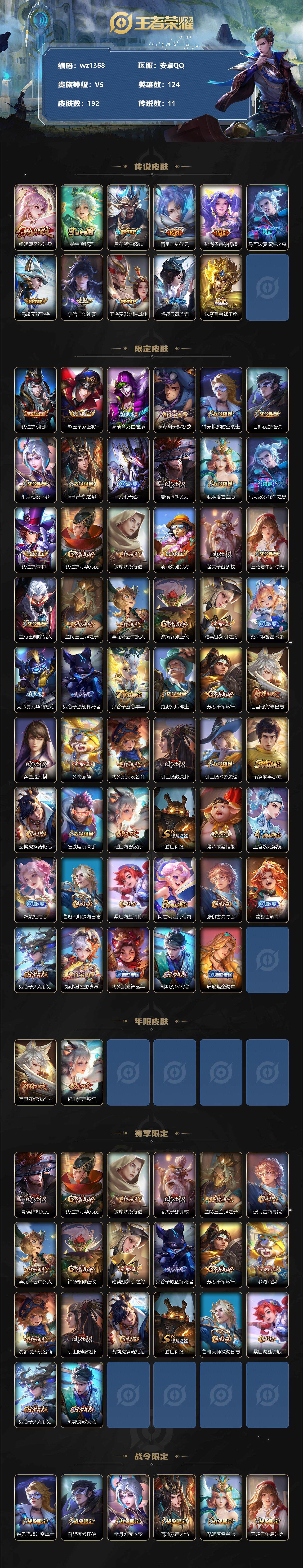 【账号佳】【王者荣耀】【编号:3339548】【可二次实名】【wz1368】【商品标题】:安卓Q-V5-永恒钻石V段位-124英雄-192皮肤-0典藏-0珍品无双-0无双-0珍品传说-11传说-56史诗 【传说皮肤】:虞姬愿照岁时盈,桑启鸣野蒿,吕布怒海麟威,百里守约碎云,孙尚香音你闪耀,马可波罗深海之息,马超无双飞将,李信一念神魔,干将莫邪久胜战神,虞姬云霓雀翎,达摩黄金狮子座 【限定皮肤】:狄仁杰阴阳师,赵云皇家上将,高渐离死亡摇滚,高渐离玩趣恶龙,钟无艳超时空战士,白起夜都怪侠,芈月幻夜卜梦,周瑜赤莲之焰,元歌无心,夏侯惇朔风刀,甄姬落雪兰心,马可波罗深海之息,狄仁杰魔术师,狄仁杰万华元夜,达摩沙漠行僧,项羽海滩派对,老夫子醍醐杖,王昭君午后时光,兰陵王驯魔猎人,兰陵王金庭之子,李元芳云中旅人,钟馗驱傩正仪,雅典娜黎明之约,蔡文姬繁星吟游,太乙真人华丽摇滚,鬼谷子原初探秘者,鬼谷子五谷丰年,黄忠火炮绅士,苏烈千军破阵,百里守约朱雀志,弈星混沌棋,梦奇顽趣,沈梦溪大漠名商,明世隐疑决卦,明世隐吟游魔法,裴擒虎李小龙,裴擒虎擒涛扼浪,狂铁电玩高手,瑶山海碧波行,盾山御銮,猪八戒猪悟能,上官婉儿梁祝,嫦娥拒霜思,鲁班大师探海日志,桑启海盐诗旅,阿古朵江河有灵,张良古海寻踪,蒙犽百解令,鬼谷子天穹祈灯,姬小满妄想食味,沈梦溪龙舞盛年,刘邦剑破天穹,周瑜熔金海岸 【年限皮肤】:百里守约朱雀志,瑶山海碧波行 【赛季限定】:夏侯惇朔风刀,狄仁杰万华元夜,达摩沙漠行僧,老夫子醍醐杖,兰陵王金庭之子,张良古海寻踪,李元芳云中旅人,钟馗驱傩正仪,雅典娜黎明之约,鬼谷子原初探秘者,苏烈千军破阵,弈星混沌棋,梦奇顽趣,沈梦溪大漠名商,明世隐疑决卦,裴擒虎擒涛扼浪,盾山御銮,鲁班大师探海日志,桑启海盐诗旅,鬼谷子天穹祈灯,刘邦剑破天穹 【战令限定】:钟无艳超时空战士,白起夜都怪侠,芈月幻夜卜梦,周瑜赤莲之焰,甄姬落雪兰心,王昭君午后时光,兰陵王驯魔猎人,黄忠火炮绅士,明世隐吟游魔法,狂铁电玩高手 【史诗皮肤】:露娜紫霞仙子,赵云皇家上将,赵云未来纪元,王昭君偶像歌手,狄仁杰魔术师,宫本武藏鬼剑武藏,孙尚香水果甜心,妲己魅力维加斯,墨子金属风暴,刘禅绅士熊喵,曹操幽灵船长,李白千年之狐,吕布末日机甲,花木兰水晶猎龙者,刘邦德古拉伯爵,夏侯惇乘风破浪,小乔缤纷独角兽,兰陵王暗隐猎兽者,亚瑟心灵战警,雅典娜冰冠公主,百里守约特工魅影,铠曙光守护者,李元芳逐浪之夏,白起星夜王子,阿轲节奏热浪,孙策猫狗日记,百里守约朱雀志,狄仁杰鹰眼统帅,公孙离无限星赏官,兰陵王驯魔猎人,上官婉儿梁祝,蔡文姬繁星吟游,不知火舞魅语,橘右京修罗,裴擒虎李小龙,猪八戒猪悟能,嫦娥拒霜思,黄忠火炮绅士,雅典娜黎明之约,夏洛特永昼,明世隐吟游魔法,貂蝉唤灵魅影,狂铁电玩高手,钟无艳超时空战士,鬼谷子五谷丰年,元歌无心,梦奇顽趣,瑶山海碧波行,阿古朵江河有灵,蒙犽百解令,周瑜雪夜绮愿,姬小满妄想食味,孙膑茶境仙,阿轲化蝶舞,狂铁龙之律动,黄忠百相守梦 【其他皮肤】:项羽海滩派对,韩信街头霸王,露娜哥特玫瑰,达摩大发明家,赵云忍炎影,扁鹊化身博士,孙膑天使之翼,姜子牙时尚教父,典韦黄金武士,亚瑟死亡骑士,达摩拳王,花木兰兔女郎,张飞五福同心,甄姬花好人间,刘备万事如意,后羿阿尔法小队,狄仁杰阴阳师,高渐离死亡摇滚,关羽龙腾万里,钟无艳海滩丽影,王昭君幻想奇妙夜,狂铁命运角斗场,孙尚香沉稳之力,鬼谷子幻乐之宴,太乙真人华丽摇滚,苏烈坚韧之力,吕布野性能量,盾山御銮,高渐离玩趣恶龙,姜子牙炽热元素使,夏侯惇朔风刀,周瑜赤莲之焰,弈星混沌棋,哪吒次元突破,鲁班七号黑桃队长,明世隐疑决卦,老夫子醍醐杖,狂铁特工战影,鬼谷子原初探秘者,狄仁杰万华元夜,张良缤纷绘卷,钟馗驱傩正仪,苏烈千军破阵,典韦铁甲之心,马可波罗潮玩牛仔,达摩沙漠行僧,芈月幻夜卜梦,刘邦虎啸剑宗,白起夜都怪侠,兰陵王金庭之子,刘禅唤灵魔甲,王昭君午后时光,沈梦溪大漠名商,蒙恬蔚蓝守将,甄姬落雪兰心,李元芳云中旅人,戈娅危途狂花,桑启海盐诗旅,赵怀真太极少年,裴擒虎擒涛扼浪,太乙真人劲辣红锅,莱西奥西部游侠,鲁班大师探海日志,姬小满零食大作战,李元芳妄想特派,张良古海寻踪,海月王牌新星,后羿完美运算,鬼谷子天穹祈灯,海诺时空谍影,朵莉亚金色潮汐,亚瑟鸿运当头,沈梦溪龙舞盛年,钟无艳春野之旅,刘邦剑破天穹,周瑜熔金海岸,东皇太一噬灭天穹,苍苍林狼骑,太乙真人谧流熔炉,典韦铁骨偃魂,马超访茗客,西施雪境奇遇,姜子牙星梦巡礼,明世隐景韶洛都,戈娅玫蓝誓约,刘备浪漫序章,钟馗虚灵犬护,苏烈春野闲踪,张良灵野札记,阿古朵布丁狗之约,露娜命运加冕,甄姬逆浪荇歌,莱西奥踏浪烽翎,貂蝉异域舞娘,狄仁杰锦衣卫,孙膑未来旅行,刘禅英喵野望,钟馗地府判官,虞姬加勒比小姐,马可波罗激情绿茵,苍维京掠夺者,