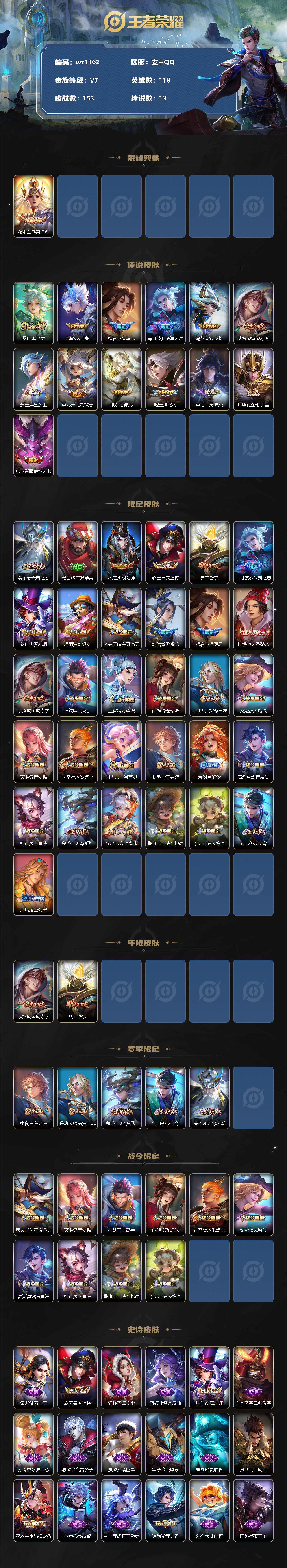 【账号佳】【王者荣耀】【编号:3339549】【可二次实名】【wz1362】【商品标题】:安卓Q-V7-至尊星耀IV段位-118英雄-153皮肤-1典藏-0珍品无双-0无双-0珍品传说-13传说-42史诗 【荣耀典藏】:花木兰九霄神辉 【传说皮肤】:桑启鸣野蒿,澜逐花归海,橘右京枫霜尽,马可波罗深海之息,马超无双飞将,裴擒虎寅虎赤拳,赵云淬星耀世,李元芳飞鸢探春,镜炽阳神光,曜云鹰飞将,李信一念神魔,后羿黄金射手座,宫本武藏地狱之眼 【限定皮肤】:姜子牙天穹之誓,杨戬破阵退雄兵,狄仁杰阴阳师,赵云皇家上将,典韦岱宗,马可波罗深海之息,狄仁杰魔术师,项羽海滩派对,老夫子航海奇遇记,韩信傲雪梅枪,橘右京枫霜尽,孙悟空大圣娶亲,裴擒虎寅虎赤拳,狂铁电玩高手,上官婉儿梁祝,西施玲珑珍味,鲁班大师探海日志,戈娅驭风魔法,艾琳流音漫舞,司空震地狱燃心,阿古朵江河有灵,张良古海寻踪,蒙犽百解令,高渐离燃音魔法,妲己灵卜魔法,鬼谷子天穹祈灯,姬小满妄想食味,鲁班七号蔬乡物语,李元芳蔬乡物语,刘邦剑破天穹,周瑜熔金海岸 【年限皮肤】:裴擒虎寅虎赤拳,典韦岱宗 【赛季限定】:张良古海寻踪,鲁班大师探海日志,鬼谷子天穹祈灯,刘邦剑破天穹,姜子牙天穹之誓 【战令限定】:老夫子航海奇遇记,艾琳流音漫舞,狂铁电玩高手,西施玲珑珍味,司空震地狱燃心,戈娅驭风魔法,高渐离燃音魔法,妲己灵卜魔法,鲁班七号蔬乡物语,李元芳蔬乡物语 【史诗皮肤】:露娜紫霞仙子,赵云皇家上将,貂蝉圣诞恋歌,甄姬冰雪圆舞曲,狄仁杰魔术师,宫本武藏鬼剑武藏,孙尚香水果甜心,嬴政暗夜贵公子,嬴政摇滚巨星,墨子金属风暴,曹操幽灵船长,张飞乱世虎臣,花木兰水晶猎龙者,亚瑟心灵战警,百里守约特工魅影,铠曙光守护者,刘禅天才门将,白起星夜王子,阿轲节奏热浪,孙策猫狗日记,孙悟空大圣娶亲,伽罗箭羽风息,狄仁杰鹰眼统帅,上官婉儿梁祝,典韦岱宗,橘右京修罗,老夫子航海奇遇记,司马懿暗渊魔法,韩信傲雪梅枪,夏洛特永昼,澜赏金猎手,狂铁电玩高手,戈娅驭风魔法,司空震地狱燃心,阿古朵江河有灵,蒙犽百解令,妲己灵卜魔法,高渐离燃音魔法,姬小满妄想食味,鲁班七号蔬乡物语,阿轲化蝶舞,狂铁龙之律动,黄忠百相守梦 【其他皮肤】:项羽海滩派对,赵云忍炎影,白起白色死神,牛魔西部大镖客,武则天东方不败,宫本武藏未来纪元,安琪拉玩偶对对碰,姜子牙时尚教父,妲己少女阿狸,典韦黄金武士,花木兰兔女郎,张飞五福同心,甄姬花好人间,宫本武藏万象初新,狄仁杰阴阳师,刘备汉昭烈帝,关羽龙腾万里,钟无艳海滩丽影,王昭君幻想奇妙夜,老夫子功夫老勺,孙尚香沉稳之力,诸葛亮掌控之力,苏烈坚韧之力,沈梦溪鲨炮海盗猫,姜子牙炽热元素使,哪吒次元突破,狂铁特工战影,鲁班大师乓乓大师,蒙恬蔚蓝守将,猪八戒潮玩探月行,赵怀真太极少年,太乙真人劲辣红锅,莱西奥西部游侠,鲁班大师探海日志,西施玲珑珍味,李元芳妄想特派,艾琳流音漫舞,张良古海寻踪,钟无艳聚星闪耀,亚连破局者,后羿完美运算,鬼谷子天穹祈灯,妲己灵卜魔法,朵莉亚金色潮汐,亚瑟鸿运当头,李元芳蔬乡物语,刘邦剑破天穹,大司命暗都幽影,杨戬破阵退雄兵,姜子牙天穹之誓,周瑜熔金海岸,盘古敬我三分,东皇太一噬灭天穹,干将莫邪雾都夜雨,苍苍林狼骑,太乙真人谧流熔炉,西施雪境奇遇,戈娅玫蓝誓约,刘备浪漫序章,钟馗虚灵犬护,苏烈春野闲踪,张良灵野札记,阿古朵布丁狗之约,露娜命运加冕,姬小满小满鸭,白起死霸装,甄姬逆浪荇歌,莱西奥踏浪烽翎,项羽帝国元帅,貂蝉异域舞娘,花木兰剑舞者,孙悟空西部大镖客,钟馗地府判官,虞姬加勒比小姐,关羽天启骑士,马可波罗激情绿茵,诸葛亮星航指挥官,鬼谷子阿摩司公爵,铠龙域领主,百里守约绝影神枪,百里玄策威尼斯狂欢,苏烈爱与和平,女娲尼罗河女神,公孙离花间舞,杨玉环霓裳曲,元歌午夜歌剧院,司马懿魇语军师,李信灼热之刃,上官婉儿修竹墨客,盘古创世神祝,曜归虚梦演,蒙恬秩序猎龙将,澜孤猎,司空震启蛰,云缨赤焰之缨,暃碧珀绯影,桑启画中游 【内测皮肤】:狂铁特工战影 【营地ID】:1738027562
