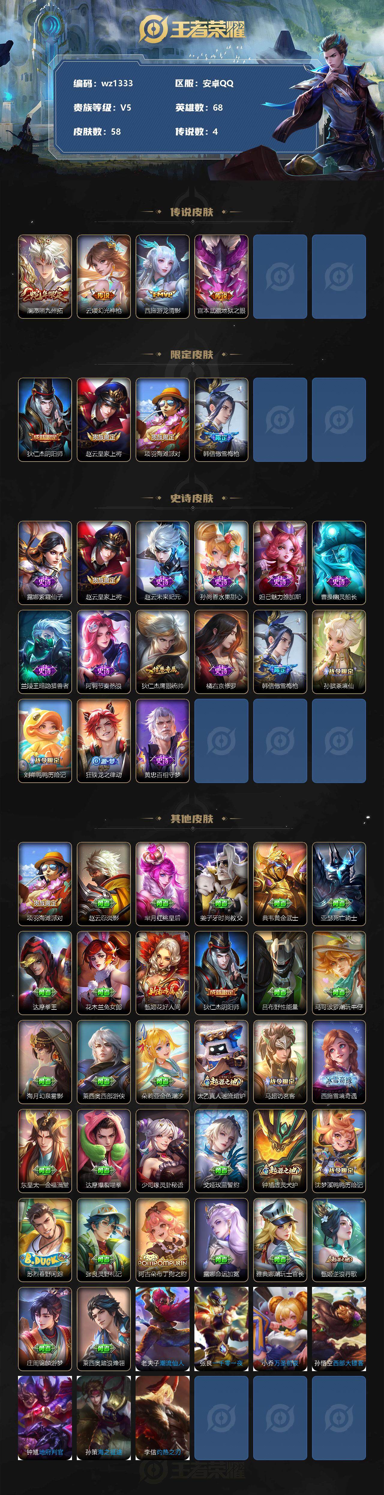 【账号佳】【王者荣耀】【编号:3339576】【可二次实名】【wz1333】【商品标题】:安卓Q-V5-至尊星耀IV段位-68英雄-58皮肤-0典藏-0珍品无双-0无双-0珍品传说-4传说-15史诗 【传说皮肤】:澜愿照九州拓,云缨幻光神枪,西施游龙清影,宫本武藏地狱之眼 【限定皮肤】:狄仁杰阴阳师,赵云皇家上将,项羽海滩派对,韩信傲雪梅枪 【史诗皮肤】:露娜紫霞仙子,赵云皇家上将,赵云未来纪元,孙尚香水果甜心,妲己魅力维加斯,曹操幽灵船长,兰陵王暗隐猎兽者,阿轲节奏热浪,狄仁杰鹰眼统帅,橘右京修罗,韩信傲雪梅枪,孙膑茶境仙,刘禅鸭鸭历险记,狂铁龙之律动,黄忠百相守梦 【其他皮肤】:项羽海滩派对,赵云忍炎影,芈月红桃皇后,姜子牙时尚教父,典韦黄金武士,亚瑟死亡骑士,达摩拳王,花木兰兔女郎,甄姬花好人间,狄仁杰阴阳师,吕布野性能量,马可波罗潮玩牛仔,海月幻泉雾影,莱西奥西部游侠,朵莉亚金色潮汐,太乙真人谧流熔炉,马超访茗客,西施雪境奇遇,东皇太一金福满堂,达摩爆裂喵拳,少司缘灵卦秘语,戈娅玫蓝誓约,钟馗虚灵犬护,沈梦溪鸭鸭历险记,苏烈春野闲踪,张良灵野札记,阿古朵布丁狗之约,露娜命运加冕,雅典娜潮玩士官长,甄姬逆浪荇歌,庄周锦麟游梦,莱西奥踏浪烽翎,老夫子潮流仙人,张良一千零一夜,小乔万圣前夜,孙悟空西部大镖客,钟馗地府判官,孙策海之征途,李信灼热之刃 【营地ID】:1622749129