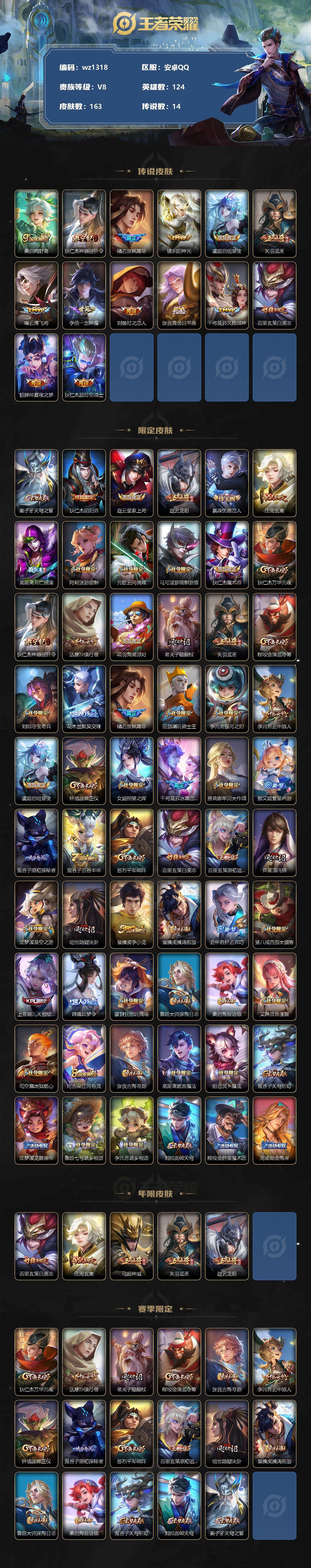 【账号佳】【王者荣耀】【编号:3339590】【可二次实名】【wz1318】【商品标题】:安卓Q-V8-尊贵铂金I段位-124英雄-163皮肤-0典藏-0珍品无双-0无双-0珍品传说-14传说-49史诗 【传说皮肤】:桑启鸣野蒿,狄仁杰神器狴犴令,橘右京枫霜尽,镜炽阳神光,虞姬启明星使,关羽武圣,曜云鹰飞将,李信一念神魔,刘备时之恋人,张良黄金白羊座,干将莫邪久胜战神,百里玄策白虎志,貂蝉仲夏夜之梦,狄仁杰超时空战士 【限定皮肤】:姜子牙天穹之誓,狄仁杰阴阳师,赵云皇家上将,赵云龙胆,嬴政优雅恋人,庄周玄嵩,高渐离死亡摇滚,阿轲迷踪丽影,元歌云间偶戏,马可波罗暗影游猎,狄仁杰魔术师,狄仁杰万华元夜,狄仁杰神器狴犴令,达摩沙漠行僧,项羽海滩派对,老夫子醍醐杖,关羽武圣,程咬金演武夺筹,刘邦夺宝奇兵,花木兰默契交锋,橘右京枫霜尽,亚瑟潮玩骑士王,李元芳银河之约,李元芳云中旅人,虞姬启明星使,钟馗驱傩正仪,女娲朔望之晖,干将莫邪冰霜恋舞曲,雅典娜单词大作战,蔡文姬繁星吟游,鬼谷子原初探秘者,鬼谷子五谷丰年,苏烈千军破阵,百里玄策白虎志,百里玄策原初追逐者,弈星混沌棋,沈梦溪星空之诺,明世隐疑决卦,裴擒虎李小龙,裴擒虎擒涛扼浪,云中君纤云弄巧,猪八戒西部大镖客,上官婉儿天狼绘梦者,嫦娥如梦令,蒙犽狂想玩偶喵,鲁班大师探海日志,桑启海盐诗旅,艾琳流音漫舞,司空震地狱燃心,阿古朵江河有灵,张良古海寻踪,高渐离燃音魔法,妲己灵卜魔法,鬼谷子天穹祈灯,沈梦溪龙舞盛年,鲁班七号蔬乡物语,李元芳蔬乡物语,刘邦剑破天穹,程咬金群星魔术团,周瑜熔金海岸 【年限皮肤】:百里玄策白虎志,庄周玄嵩,马超神威,关羽武圣,赵云龙胆 【赛季限定】:狄仁杰万华元夜,达摩沙漠行僧,老夫子醍醐杖,程咬金演武夺筹,张良古海寻踪,李元芳云中旅人,钟馗驱傩正仪,鬼谷子原初探秘者,苏烈千军破阵,百里玄策原初追逐者,弈星混沌棋,明世隐疑决卦,裴擒虎擒涛扼浪,鲁班大师探海日志,桑启海盐诗旅,鬼谷子天穹祈灯,刘邦剑破天穹,姜子牙天穹之誓 【战令限定】:阿轲迷踪丽影,元歌云间偶戏,马可波罗暗影游猎,刘邦夺宝奇兵,艾琳流音漫舞,亚瑟潮玩骑士王,李元芳银河之约,女娲朔望之晖,雅典娜单词大作战,沈梦溪星空之诺,猪八戒西部大镖客,蒙犽狂想玩偶喵,司空震地狱燃心,高渐离燃音魔法,妲己灵卜魔法,鲁班七号蔬乡物语,李元芳蔬乡物语 【史诗皮肤】:露娜紫霞仙子,赵云皇家上将,甄姬冰雪圆舞曲,狄仁杰魔术师,廉颇地狱岩魂,宫本武藏鬼剑武藏,孙尚香水果甜心,嬴政优雅恋人,嬴政暗夜贵公子,嬴政摇滚巨星,妲己女仆咖啡,吕布圣诞狂欢,曹操幽灵船长,吕布末日机甲,花木兰水晶猎龙者,刘邦德古拉伯爵,兰陵王暗隐猎兽者,亚瑟心灵战警,铠曙光守护者,李元芳逐浪之夏,阿轲节奏热浪,干将莫邪冰霜恋舞曲,狄仁杰鹰眼统帅,公孙离无限星赏官,蔡文姬繁星吟游,李元芳银河之约,娜可露露晚萤,庄周玄嵩,嫦娥如梦令,阿轲迷踪丽影,橘右京修罗,瑶遇见神鹿,马超神威,赵云龙胆,孙尚香时之恋人,上官婉儿天狼绘梦者,马可波罗暗影游猎,蒙犽狂想玩偶喵,百里玄策原初追逐者,裴擒虎李小龙,云中君纤云弄巧,元歌云间偶戏,花木兰默契交锋,鬼谷子五谷丰年,司空震地狱燃心,阿古朵江河有灵,妲己灵卜魔法,高渐离燃音魔法,鲁班七号蔬乡物语,黄忠百相守梦 【其他皮肤】:项羽海滩派对,韩信街头霸王,露娜哥特玫瑰,赵云忍炎影,芈月红桃皇后,程咬金爱与正义,白起白色死神,宫本武藏未来纪元,姜子牙时尚教父,典韦黄金武士,花木兰兔女郎,张飞五福同心,刘备万事如意,宫本武藏万象初新,后羿阿尔法小队,狄仁杰阴阳师,刘备纽约教父,高渐离死亡摇滚,狂铁命运角斗场,孙尚香沉稳之力,李白敏锐之力,苏烈坚韧之力,明世隐虹云星官,女娲朔望之晖,小乔丁香结,吕布野性能量,孙膑归虚梦演,沈梦溪鲨炮海盗猫,沈梦溪星空之诺,弈星混沌棋,明世隐疑决卦,刘邦夺宝奇兵,盾山圆桌骑士,老夫子醍醐杖,猪八戒西部大镖客,狂铁特工战影,廉颇无尽征程,鬼谷子原初探秘者,雅典娜单词大作战,狄仁杰万华元夜,亚瑟潮玩骑士王,杨戬次元傲视,程咬金演武夺筹,张良缤纷绘卷,钟馗驱傩正仪,鲁班大师乓乓大师,苏烈千军破阵,达摩沙漠行僧,蒙恬蔚蓝守将,李元芳云中旅人,戈娅危途狂花,桑启海盐诗旅,赵怀真太极少年,裴擒虎擒涛扼浪,鲁班大师探海日志,姬小满零食大作战,艾琳流音漫舞,张良古海寻踪,亚连破局者,后羿完美运算,鬼谷子天穹祈灯,妲己灵卜魔法,嫦娥漠中幻影,沈梦溪龙舞盛年,李元芳蔬乡物语,刘邦剑破天穹,程咬金群星魔术团,姜子牙天穹之誓,周瑜熔金海岸,姜子牙星梦巡礼,露娜绯红之刃,孙膑未来旅行,后羿精灵王,李白范海辛,钟馗地府判官,刘邦圣殿之光,关羽天启骑士,雅典娜战争女神,苍维京掠夺者,太乙真人圆桌骑士,黄忠芝加哥教父,大乔伊势巫女,干将莫邪第七人偶,百里守约绝影神枪,女娲尼罗河女神,公孙