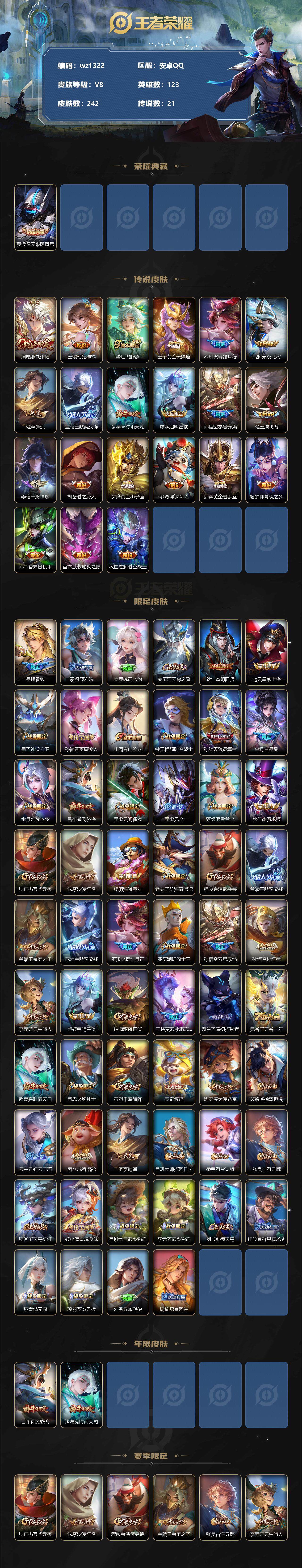 【账号佳】【王者荣耀】【编号:3339596】【可二次实名】【wz1322】【商品标题】:安卓Q-V8-至尊星耀V段位-123英雄-242皮肤-1典藏-0珍品无双-0无双-0珍品传说-21传说-69史诗 【荣耀典藏】:夏侯惇无限飓风号 【传说皮肤】:澜愿照九州拓,云缨幻光神枪,桑启鸣野蒿,墨子黄金天蝎座,不知火舞绯月行,马超无双飞将,曜李逍遥 ,兰陵王默契交锋,诸葛亮时雨天司,虞姬启明星使,孙悟空零号赤焰,曜云鹰飞将,李信一念神魔,刘备时之恋人,达摩黄金狮子座,梦奇胖达荣荣,后羿黄金射手座,貂蝉仲夏夜之梦,孙尚香末日机甲,宫本武藏地狱之眼,狄仁杰超时空战士 【限定皮肤】:暃埋骨钱,蒙犽顽岩魄,大乔绒语心约,姜子牙天穹之誓,狄仁杰阴阳师,赵云皇家上将,墨子神迹守卫,孙尚香蔷薇恋人,庄周高山流水,钟无艳超时空战士,孙膑天狼运算者,芈月白晶晶,芈月幻夜卜梦,吕布御风骁将,元歌云间偶戏,元歌无心,甄姬落雪兰心,狄仁杰魔术师,狄仁杰万华元夜,达摩沙漠行僧,项羽海滩派对,老夫子航海奇遇记,程咬金演武夺筹,兰陵王默契交锋,兰陵王金庭之子,花木兰默契交锋,不知火舞绯月行,亚瑟潮玩骑士王,孙悟空零号赤焰,孙悟空孙行者,李元芳云中旅人,虞姬启明星使,钟馗驱傩正仪,干将莫邪冰霜恋舞曲,鬼谷子原初探秘者,鬼谷子五谷丰年,诸葛亮时雨天司,黄忠火炮绅士,苏烈千军破阵,梦奇顽趣,沈梦溪大漠名商,裴擒虎擒涛扼浪,云中君纤云弄巧,猪八戒猪悟能,曜李逍遥 ,鲁班大师探海日志,桑启海盐诗旅,张良古海寻踪,鬼谷子天穹祈灯,姬小满妄想食味,鲁班七号蔬乡物语,李元芳蔬乡物语,刘邦剑破天穹,程咬金群星魔术团,镜青焰无极,项羽苍威无极,刘备异域游侠,周瑜熔金海岸 【年限皮肤】:吕布御风骁将,诸葛亮时雨天司 【赛季限定】:狄仁杰万华元夜,达摩沙漠行僧,程咬金演武夺筹,兰陵王金庭之子,张良古海寻踪,李元芳云中旅人,钟馗驱傩正仪,鬼谷子原初探秘者,苏烈千军破阵,梦奇顽趣,沈梦溪大漠名商,裴擒虎擒涛扼浪,鲁班大师探海日志,桑启海盐诗旅,鬼谷子天穹祈灯,刘邦剑破天穹,姜子牙天穹之誓 【战令限定】:墨子神迹守卫,钟无艳超时空战士,芈月幻夜卜梦,元歌云间偶戏,甄姬落雪兰心,老夫子航海奇遇记,亚瑟潮玩骑士王,黄忠火炮绅士,鲁班七号蔬乡物语,李元芳蔬乡物语,镜青焰无极,项羽苍威无极 【史诗皮肤】:鲁班七号电玩小子,露娜紫霞仙子,阿轲暗夜猫娘,赵云皇家上将,赵云未来纪元,貂蝉圣诞恋歌,甄姬冰雪圆舞曲,王昭君偶像歌手,狄仁杰魔术师,廉颇地狱岩魂,宫本武藏鬼剑武藏,孙尚香蔷薇恋人,孙尚香水果甜心,嬴政摇滚巨星,妲己魅力维加斯,妲己女仆咖啡,墨子金属风暴,吕布圣诞狂欢,刘禅绅士熊喵,曹操幽灵船长,李白千年之狐,韩信白龙吟,花木兰水晶猎龙者,刘邦德古拉伯爵,夏侯惇乘风破浪,小乔缤纷独角兽,兰陵王暗隐猎兽者,诸葛亮黄金分割率,亚瑟心灵战警,安琪拉心灵骇客,百里守约特工魅影,铠曙光守护者,刘禅天才门将,李元芳逐浪之夏,程咬金功夫厨神,孙策猫狗日记,大乔猫狗日记,干将莫邪冰霜恋舞曲,伽罗箭羽风息,狄仁杰鹰眼统帅,娜可露露晚萤,橘右京修罗,孙尚香时之恋人,云中君纤云弄巧,孙膑天狼运算者,元歌云间偶戏,芈月白晶晶,吕布御风骁将,花木兰默契交锋,老夫子航海奇遇记,杨戬天秀启明,孙悟空孙行者,猪八戒猪悟能,庄周高山流水,黄忠火炮绅士,澜赏金猎手,艾琳奇遇舞章,钟无艳超时空战士,鬼谷子五谷丰年,元歌无心,梦奇顽趣,姬小满妄想食味,鲁班七号蔬乡物语,镜青焰无极,黄忠怒海争锋,蒙犽顽岩魄,暃埋骨钱,阿轲化蝶舞,狂铁龙之律动 【其他皮肤】:项羽海滩派对,韩信教廷特使,韩信街头霸王,露娜哥特玫瑰,达摩大发明家,赵云白执事,赵云忍炎影,白起白色死神,牛魔西部大镖客,武则天东方不败,扁鹊化身博士,扁鹊救世之瞳,宫本武藏未来纪元,安琪拉玩偶对对碰,孙膑天使之翼,妲己少女阿狸,典韦黄金武士,亚瑟死亡骑士,达摩拳王,花木兰兔女郎,张飞五福同心,甄姬花好人间,刘备万事如意,宫本武藏万象初新,狄仁杰阴阳师,刘备纽约教父,刘备汉昭烈帝,关羽龙腾万里,钟无艳海滩丽影,狂铁命运角斗场,老夫子功夫老勺,孙尚香沉稳之力,李白敏锐之力,鬼谷子幻乐之宴,苏烈坚韧之力,大乔守护之力,明世隐虹云星官,张良幽兰居士,小乔丁香结,吕布野性能量,孙膑归虚梦演,沈梦溪鲨炮海盗猫,姜子牙炽热元素使,哪吒次元突破,狂铁特工战影,鬼谷子原初探秘者,狄仁杰万华元夜,亚瑟潮玩骑士王,刘禅秘密基地,杨戬次元傲视,露娜瓷语鉴心,程咬金演武夺筹,张良缤纷绘卷,钟馗驱傩正仪,墨子神迹守卫,鲁班大师乓乓大师,苏烈千军破阵,典韦铁甲之心,达摩沙漠行僧,芈月幻夜卜梦,程咬金无双福将,兰陵王金庭之子,刘禅唤灵魔甲,沈梦溪大漠名商,蒙恬蔚蓝守将,甄姬落雪兰心,李元芳云中旅人,刘备潮玩造梦师,桑启海盐诗旅,猪八戒潮玩探月行,白起乐园追猎者,裴擒虎擒