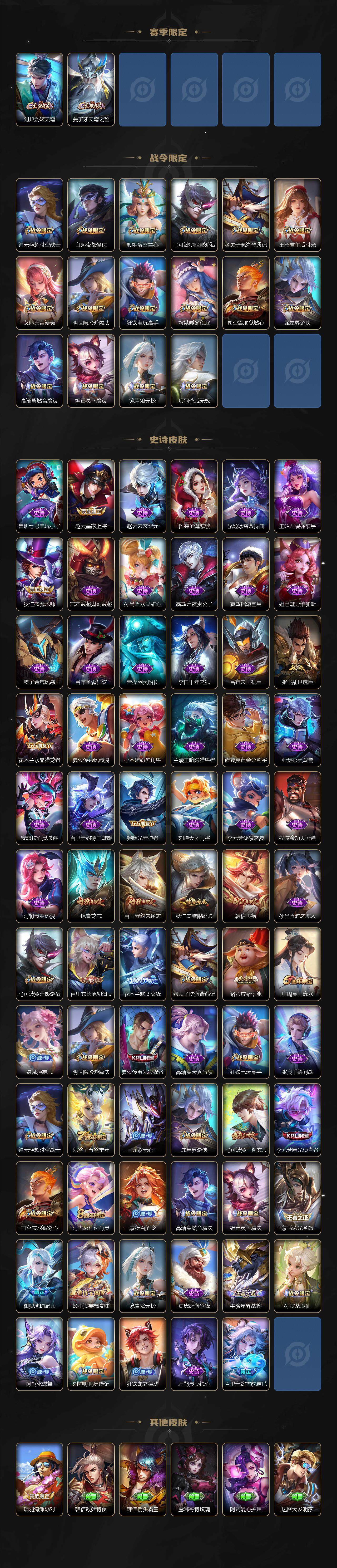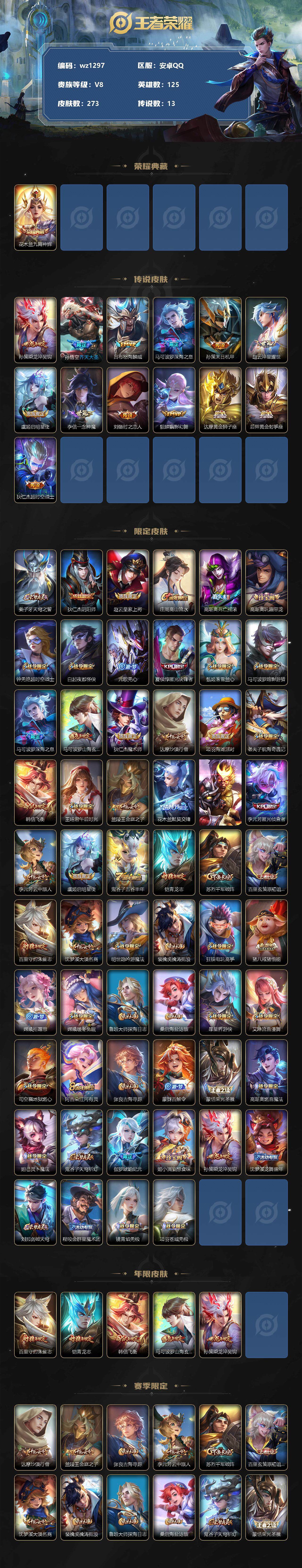【账号佳】【王者荣耀】【编号:3339601】【可二次实名】【wz1297】【商品标题】:安卓Q-V8-至尊星耀III段位-125英雄-273皮肤-1典藏-0珍品无双-0无双-0珍品传说-13传说-70史诗 【荣耀典藏】:花木兰九霄神辉 【传说皮肤】:孙策乘龙淬吴钩,孙悟空齐天大圣,吕布怒海麟威,马可波罗深海之息,孙策末日机甲,赵云淬星耀世,虞姬启明星使,李信一念神魔,刘备时之恋人,貂蝉猫影幻舞,达摩黄金狮子座,后羿黄金射手座,狄仁杰超时空战士 【限定皮肤】:姜子牙天穹之誓,狄仁杰阴阳师,赵云皇家上将,庄周高山流水,高渐离死亡摇滚,高渐离玩趣恶龙,钟无艳超时空战士,白起夜都怪侠,元歌无心,夏侯惇匿光决锋者,甄姬落雪兰心,马可波罗暗影游猎,马可波罗深海之息,马可波罗山海玄木吟,狄仁杰魔术师,达摩沙漠行僧,项羽海滩派对,老夫子航海奇遇记,韩信飞衡,王昭君午后时光,兰陵王金庭之子,花木兰默契交锋,孙悟空齐天大圣,李元芳匿光侦查者,李元芳云中旅人,虞姬启明星使,鬼谷子五谷丰年,铠青龙志,苏烈千军破阵,百里玄策原初追逐者,百里守约朱雀志,沈梦溪大漠名商,明世隐吟游魔法,裴擒虎擒涛扼浪,狂铁电玩高手,猪八戒猪悟能,嫦娥拒霜思,嫦娥暖冬兔眠,鲁班大师探海日志,桑启海盐诗旅,暃星界游侠,艾琳流音漫舞,司空震地狱燃心,阿古朵江河有灵,张良古海寻踪,蒙犽百解令,蒙恬荣光圣徽,高渐离燃音魔法,妲己灵卜魔法,鬼谷子天穹祈灯,伽罗琥珀纪元,姬小满妄想食味,孙策乘龙淬吴钩,沈梦溪龙舞盛年,刘邦剑破天穹,程咬金群星魔术团,镜青焰无极,项羽苍威无极 【年限皮肤】:百里守约朱雀志,铠青龙志,韩信飞衡,马可波罗山海玄木吟,孙策乘龙淬吴钩 【赛季限定】:达摩沙漠行僧,兰陵王金庭之子,张良古海寻踪,李元芳云中旅人,苏烈千军破阵,百里玄策原初追逐者,沈梦溪大漠名商,裴擒虎擒涛扼浪,鲁班大师探海日志,桑启海盐诗旅,鬼谷子天穹祈灯,蒙恬荣光圣徽,刘邦剑破天穹,姜子牙天穹之誓 【战令限定】:钟无艳超时空战士,白起夜都怪侠,甄姬落雪兰心,马可波罗暗影游猎,老夫子航海奇遇记,王昭君午后时光,艾琳流音漫舞,明世隐吟游魔法,狂铁电玩高手,嫦娥暖冬兔眠,司空震地狱燃心,暃星界游侠,高渐离燃音魔法,妲己灵卜魔法,镜青焰无极,项羽苍威无极 【史诗皮肤】:鲁班七号电玩小子,赵云皇家上将,赵云未来纪元,貂蝉圣诞恋歌,甄姬冰雪圆舞曲,王昭君偶像歌手,狄仁杰魔术师,宫本武藏鬼剑武藏,孙尚香水果甜心,嬴政暗夜贵公子,嬴政摇滚巨星,妲己魅力维加斯,墨子金属风暴,吕布圣诞狂欢,曹操幽灵船长,李白千年之狐,吕布末日机甲,张飞乱世虎臣,花木兰水晶猎龙者,夏侯惇乘风破浪,小乔缤纷独角兽,兰陵王暗隐猎兽者,诸葛亮黄金分割率,亚瑟心灵战警,安琪拉心灵骇客,百里守约特工魅影,铠曙光守护者,刘禅天才门将,李元芳逐浪之夏,程咬金功夫厨神,阿轲节奏热浪,铠青龙志,百里守约朱雀志,狄仁杰鹰眼统帅,韩信飞衡,孙尚香时之恋人,马可波罗暗影游猎,百里玄策原初追逐者,花木兰默契交锋,老夫子航海奇遇记,猪八戒猪悟能,庄周高山流水,嫦娥拒霜思,明世隐吟游魔法,夏侯惇匿光决锋者,高渐离天秀音浪,狂铁电玩高手,张良千筹问战,钟无艳超时空战士,鬼谷子五谷丰年,元歌无心,暃星界游侠,马可波罗山海玄木吟,李元芳匿光侦查者,司空震地狱燃心,阿古朵江河有灵,蒙犽百解令,妲己灵卜魔法,高渐离燃音魔法,蒙恬荣光圣徽,伽罗琥珀纪元,姬小满妄想食味,镜青焰无极,黄忠怒海争锋,牛魔星界战将,孙膑茶境仙,阿轲化蝶舞,刘禅鸭鸭历险记,狂铁龙之律动,扁鹊灵蛊蚀心,百里守约雪豹霜爪 【其他皮肤】:项羽海滩派对,韩信教廷特使,韩信街头霸王,露娜哥特玫瑰,阿轲爱心护理,达摩大发明家,赵云白执事,赵云忍炎影,芈月红桃皇后,程咬金星际陆战队,程咬金爱与正义,白起白色死神,牛魔西部大镖客,扁鹊化身博士,扁鹊救世之瞳,宫本武藏未来纪元,安琪拉玩偶对对碰,孙膑天使之翼,姜子牙时尚教父,妲己少女阿狸,典韦黄金武士,亚瑟死亡骑士,花木兰兔女郎,张飞五福同心,甄姬花好人间,刘备万事如意,宫本武藏万象初新,后羿阿尔法小队,狄仁杰阴阳师,刘备纽约教父,高渐离死亡摇滚,刘备汉昭烈帝,关羽龙腾万里,钟无艳海滩丽影,王昭君幻想奇妙夜,狂铁命运角斗场,老夫子功夫老勺,孙尚香沉稳之力,诸葛亮掌控之力,李白敏锐之力,鬼谷子幻乐之宴,大乔守护之力,明世隐虹云星官,张良幽兰居士,小乔丁香结,吕布野性能量,孙膑归虚梦演,高渐离玩趣恶龙,沈梦溪鲨炮海盗猫,姜子牙炽热元素使,哪吒次元突破,盾山圆桌骑士,狂铁特工战影,刘禅秘密基地,露娜瓷语鉴心,鲁班大师乓乓大师,苏烈千军破阵,达摩沙漠行僧,程咬金无双福将,刘邦虎啸剑宗,白起夜都怪侠,兰陵王金庭之子,刘禅唤灵魔甲,米莱狄契约魔法,王昭君午后时光,沈梦溪大漠名商,蒙犽胡桃狂想曲,蒙恬蔚蓝守将,甄姬落雪兰心,李元芳云中旅