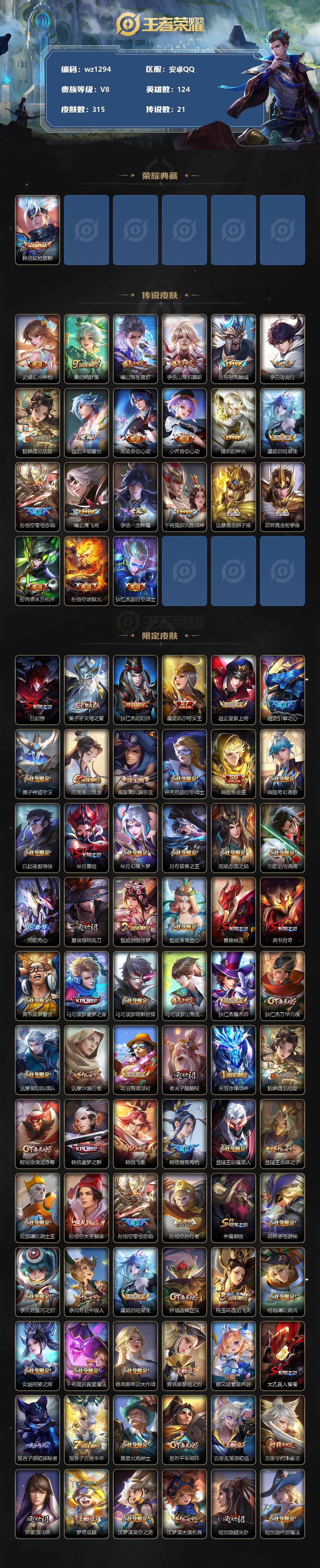 【账号佳】【王者荣耀】【编号:3339602】【可二次实名】【wz1294】【商品标题】:安卓Q-V8-最强王者段位-124英雄-315皮肤-1典藏-0珍品无双-0无双-0珍品传说-21传说-94史诗 【荣耀典藏】:韩信弑枪猎影 【传说皮肤】:云缨幻光神枪,桑启鸣野蒿,曜山海苍雷引,李信山海炽霜斩,吕布怒海麟威,李白诗剑行,貂蝉遇见胡旋,赵云淬星耀世,周瑜音你心动,小乔音你心动,镜炽阳神光,虞姬启明星使,孙悟空零号赤焰,曜云鹰飞将,李信一念神魔,干将莫邪久胜战神,达摩黄金狮子座,后羿黄金射手座,孙尚香末日机甲,孙悟空地狱火,狄仁杰超时空战士 【限定皮肤】:白起狰,姜子牙天穹之誓,狄仁杰阴阳师,虞姬凯尔特女王,赵云皇家上将,赵云引擎之心,墨子神迹守卫,庄周高山流水,高渐离玩趣恶龙,钟无艳超时空战士,扁鹊炼金王,扁鹊奇幻香踪,白起夜都怪侠,芈月重明,芈月幻夜卜梦,吕布猎兽之王,周瑜赤莲之焰,元歌云间偶戏,元歌无心,夏侯惇朔风刀,甄姬游园惊梦,甄姬落雪兰心,曹操烛龙,典韦穷奇,典韦蓝屏警告,马可波罗逐梦之星,马可波罗暗影游猎,马可波罗山海玄木吟,狄仁杰魔术师,狄仁杰万华元夜,达摩星际陆战队,达摩沙漠行僧,项羽海滩派对,老夫子醍醐杖,关羽冰锋战神,貂蝉遇见胡旋,程咬金演武夺筹,韩信逐梦之影,韩信飞衡,韩信傲雪梅枪,兰陵王驯魔猎人,兰陵王金庭之子,亚瑟潮玩骑士王,孙悟空大圣娶亲,孙悟空零号赤焰,孙悟空孙行者,牛魔御旌,后羿圣弓游侠,李元芳银河之约,李元芳云中旅人,虞姬启明星使,钟馗驱傩正仪,杨玉环遇见飞天,杨戬潮玩骑兵,女娲朔望之晖,干将莫邪真爱魔法,雅典娜单词大作战,雅典娜黎明之约,蔡文姬繁星吟游,太乙真人饕餮,鬼谷子原初探秘者,鬼谷子五谷丰年,黄忠火炮绅士,苏烈千军破阵,百里玄策原初追逐者,百里守约朱雀志,弈星混沌棋,梦奇顽趣,沈梦溪星空之诺,沈梦溪大漠名商,明世隐疑决卦,明世隐吟游魔法,裴擒虎天狼狩猎者,裴擒虎李小龙,裴擒虎擒涛扼浪,狂铁御狮,米莱狄御霄,米莱狄胡桃异想国,云中君纤云弄巧,李信山海炽霜斩,盾山御銮,猪八戒西部大镖客,猪八戒猪悟能,上官婉儿梁祝,嫦娥拒霜思,嫦娥暖冬兔眠,曜山海苍雷引,蒙犽狂想玩偶喵,鲁班大师探海日志,镜匿光追影者,桑启海盐诗旅,暃星界游侠,阿古朵江河有灵,张良古海寻踪,蒙恬荣光圣徽,高渐离燃音魔法,妲己灵卜魔法,鬼谷子天穹祈灯,姬小满妄想食味,鲁班七号蔬乡物语,李元芳蔬乡物语,刘邦剑破天穹,程咬金群星魔术团,周瑜熔金海岸 【年限皮肤】:百里守约朱雀志,韩信飞衡,马超神威,马可波罗山海玄木吟,李信山海炽霜斩,曜山海苍雷引 【赛季限定】:扁鹊炼金王,白起狰,芈月重明,夏侯惇朔风刀,曹操烛龙,典韦穷奇,狄仁杰万华元夜,达摩沙漠行僧,老夫子醍醐杖,程咬金演武夺筹,兰陵王金庭之子,张良古海寻踪,牛魔御旌,李元芳云中旅人,虞姬凯尔特女王,钟馗驱傩正仪,雅典娜黎明之约,太乙真人饕餮,鬼谷子原初探秘者,苏烈千军破阵,百里玄策原初追逐者,弈星混沌棋,梦奇顽趣,沈梦溪大漠名商,明世隐疑决卦,裴擒虎擒涛扼浪,狂铁御狮,米莱狄御霄,盾山御銮,鲁班大师探海日志,桑启海盐诗旅,鬼谷子天穹祈灯,蒙恬荣光圣徽,刘邦剑破天穹,姜子牙天穹之誓 【战令限定】:墨子神迹守卫,钟无艳超时空战士,扁鹊奇幻香踪,白起夜都怪侠,芈月幻夜卜梦,吕布猎兽之王,周瑜赤莲之焰,元歌云间偶戏,甄姬落雪兰心,典韦蓝屏警告,马可波罗暗影游猎,达摩星际陆战队,兰陵王驯魔猎人,亚瑟潮玩骑士王,后羿圣弓游侠,李元芳银河之约,杨戬潮玩骑兵,女娲朔望之晖,干将莫邪真爱魔法,雅典娜单词大作战,黄忠火炮绅士,沈梦溪星空之诺,明世隐吟游魔法,米莱狄胡桃异想国,猪八戒西部大镖客,嫦娥暖冬兔眠,蒙犽狂想玩偶喵,暃星界游侠,高渐离燃音魔法,妲己灵卜魔法,鲁班七号蔬乡物语,李元芳蔬乡物语 【史诗皮肤】:鲁班七号电玩小子,露娜紫霞仙子,赵云皇家上将,赵云未来纪元,貂蝉圣诞恋歌,甄姬冰雪圆舞曲,狄仁杰魔术师,廉颇地狱岩魂,宫本武藏鬼剑武藏,孙尚香水果甜心,嬴政暗夜贵公子,嬴政摇滚巨星,妲己魅力维加斯,妲己女仆咖啡,墨子龙骑士,墨子金属风暴,吕布圣诞狂欢,曹操幽灵船长,李白千年之狐,吕布末日机甲,张飞乱世虎臣,关羽冰锋战神,赵云引擎之心,花木兰水晶猎龙者,刘邦德古拉伯爵,韩信逐梦之影,夏侯惇乘风破浪,小乔缤纷独角兽,兰陵王暗隐猎兽者,诸葛亮黄金分割率,甄姬游园惊梦,马可波罗逐梦之星,亚瑟心灵战警,安琪拉心灵骇客,百里守约特工魅影,铠曙光守护者,蔡文姬舞动绿茵,刘禅天才门将,李元芳逐浪之夏,程咬金功夫厨神,白起星夜王子,阿轲节奏热浪,杨玉环遇见飞天,孙策猫狗日记,百里守约朱雀志,孙悟空大圣娶亲,典韦蓝屏警告,伽罗箭羽风息,裴擒虎天狼狩猎者,狄仁杰鹰眼统帅,公孙离无限星赏官,兰陵王驯魔猎人,上官婉儿梁祝,蔡文姬繁星吟游,李元芳银河之约,韩信飞衡,不