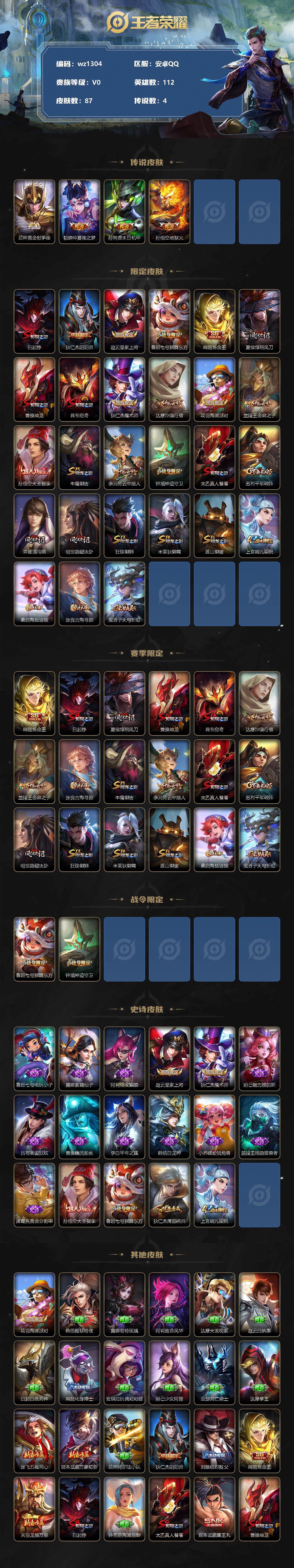 【账号佳】【王者荣耀】【编号:3339604】【可二次实名】【wz1304】【商品标题】:安卓Q-V0-永恒钻石V段位-112英雄-87皮肤-0典藏-0珍品无双-0无双-0珍品传说-4传说-17史诗 【传说皮肤】:后羿黄金射手座,貂蝉仲夏夜之梦,孙尚香末日机甲,孙悟空地狱火 【限定皮肤】:白起狰,狄仁杰阴阳师,赵云皇家上将,鲁班七号狮舞东方,扁鹊炼金王,夏侯惇朔风刀,曹操烛龙,典韦穷奇,狄仁杰魔术师,达摩沙漠行僧,项羽海滩派对,兰陵王金庭之子,孙悟空大圣娶亲,牛魔御旌,李元芳云中旅人,钟馗神迹守卫,太乙真人饕餮,苏烈千军破阵,弈星混沌棋,明世隐疑决卦,狂铁御狮,米莱狄御霄,盾山御銮,上官婉儿梁祝,桑启海盐诗旅,张良古海寻踪,鬼谷子天穹祈灯 【赛季限定】:扁鹊炼金王,白起狰,夏侯惇朔风刀,曹操烛龙,典韦穷奇,达摩沙漠行僧,兰陵王金庭之子,张良古海寻踪,牛魔御旌,李元芳云中旅人,太乙真人饕餮,苏烈千军破阵,弈星混沌棋,明世隐疑决卦,狂铁御狮,米莱狄御霄,盾山御銮,桑启海盐诗旅,鬼谷子天穹祈灯 【战令限定】:鲁班七号狮舞东方,钟馗神迹守卫 【史诗皮肤】:鲁班七号电玩小子,露娜紫霞仙子,阿轲暗夜猫娘,赵云皇家上将,狄仁杰魔术师,妲己魅力维加斯,吕布圣诞狂欢,曹操幽灵船长,李白千年之狐,韩信白龙吟,小乔缤纷独角兽,兰陵王暗隐猎兽者,诸葛亮黄金分割率,孙悟空大圣娶亲,鲁班七号狮舞东方,狄仁杰鹰眼统帅,上官婉儿梁祝 【其他皮肤】:项羽海滩派对,韩信教廷特使,露娜哥特玫瑰,阿轲致命风华,达摩大发明家,赵云白执事,白起白色死神,扁鹊化身博士,安琪拉玩偶对对碰,妲己少女阿狸,亚瑟死亡骑士,达摩拳王,张飞五福同心,宫本武藏万象初新,后羿阿尔法小队,狄仁杰阴阳师,刘备纽约教父,扁鹊炼金王,关羽龙腾万里,白起狰,钟无艳海滩丽影,太乙真人饕餮,宫本武藏霸王丸,曹操烛龙,老夫子功夫老勺,典韦穷奇,李白敏锐之力,鬼谷子幻乐之宴,狂铁御狮,米莱狄御霄,明世隐虹云星官,牛魔御旌,吕布野性能量,钟馗神迹守卫,盾山御銮,夏侯惇朔风刀,弈星混沌棋,明世隐疑决卦,苏烈千军破阵,达摩沙漠行僧,兰陵王金庭之子,李元芳云中旅人,桑启海盐诗旅,张良古海寻踪,后羿完美运算,鬼谷子天穹祈灯,鲁班七号福禄兄弟,钟无艳生化警戒,孙悟空西部大镖客,李白范海辛,李元芳特种部队,蔡文姬蔷薇王座,夏侯惇战争骑士,马可波罗激情绿茵,杨戬埃及法老,百里守约绝影神枪,百里玄策威尼斯狂欢,苏烈爱与和平,公孙离花间舞,弈星踏雪寻梅,元歌午夜歌剧院,李信灼热之刃,猪八戒年年有余,盘古创世神祝,瑶森,马超幸存者 【营地ID】:374472968