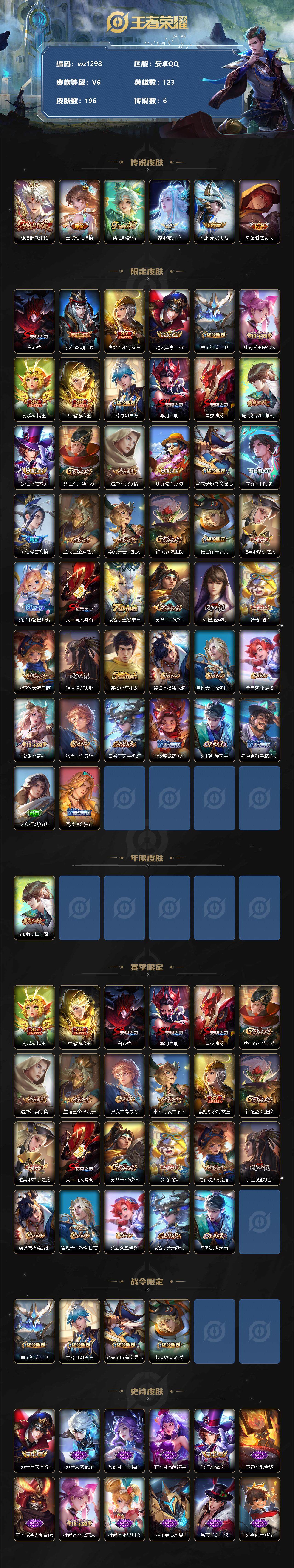 【账号佳】【王者荣耀】【编号:3339605】【可二次实名】【wz1298】【商品标题】:安卓Q-V6-最强王者段位-123英雄-196皮肤-0典藏-0珍品无双-0无双-0珍品传说-6传说-43史诗 【传说皮肤】:澜愿照九州拓,云缨幻光神枪,桑启鸣野蒿,露娜霜月吟,马超无双飞将,刘备时之恋人 【限定皮肤】:白起狰,狄仁杰阴阳师,虞姬凯尔特女王,赵云皇家上将,墨子神迹守卫,孙尚香蔷薇恋人,孙膑妖精王,扁鹊炼金王,扁鹊奇幻香踪,芈月重明,曹操烛龙,马可波罗山海玄木吟,狄仁杰魔术师,狄仁杰万华元夜,达摩沙漠行僧,项羽海滩派对,老夫子航海奇遇记,关羽百相守梦,韩信傲雪梅枪,兰陵王金庭之子,李元芳云中旅人,钟馗驱傩正仪,杨戬潮玩骑兵,雅典娜黎明之约,蔡文姬繁星吟游,太乙真人饕餮,鬼谷子五谷丰年,苏烈千军破阵,弈星混沌棋,梦奇顽趣,沈梦溪大漠名商,明世隐疑决卦,裴擒虎李小龙,裴擒虎擒涛扼浪,鲁班大师探海日志,桑启海盐诗旅,艾琳女武神,张良古海寻踪,鬼谷子天穹祈灯,沈梦溪龙舞盛年,刘邦剑破天穹,程咬金群星魔术团,刘备异域游侠,周瑜熔金海岸 【年限皮肤】:马可波罗山海玄木吟 【赛季限定】:孙膑妖精王,扁鹊炼金王,白起狰,芈月重明,曹操烛龙,狄仁杰万华元夜,达摩沙漠行僧,兰陵王金庭之子,张良古海寻踪,李元芳云中旅人,虞姬凯尔特女王,钟馗驱傩正仪,雅典娜黎明之约,太乙真人饕餮,苏烈千军破阵,弈星混沌棋,梦奇顽趣,沈梦溪大漠名商,明世隐疑决卦,裴擒虎擒涛扼浪,鲁班大师探海日志,桑启海盐诗旅,鬼谷子天穹祈灯,刘邦剑破天穹 【战令限定】:墨子神迹守卫,扁鹊奇幻香踪,老夫子航海奇遇记,杨戬潮玩骑兵 【史诗皮肤】:赵云皇家上将,赵云未来纪元,甄姬冰雪圆舞曲,王昭君偶像歌手,狄仁杰魔术师,廉颇地狱岩魂,宫本武藏鬼剑武藏,孙尚香蔷薇恋人,孙尚香水果甜心,墨子金属风暴,吕布圣诞狂欢,刘禅绅士熊喵,曹操幽灵船长,花木兰水晶猎龙者,夏侯惇乘风破浪,兰陵王暗隐猎兽者,诸葛亮黄金分割率,安琪拉心灵骇客,百里守约特工魅影,铠曙光守护者,程咬金功夫厨神,狄仁杰鹰眼统帅,蔡文姬繁星吟游,橘右京修罗,孙尚香时之恋人,裴擒虎李小龙,老夫子航海奇遇记,钟馗乐园奇幻夜,雅典娜黎明之约,韩信傲雪梅枪,貂蝉唤灵魅影,鬼谷子五谷丰年,梦奇顽趣,马可波罗山海玄木吟,扁鹊奇幻香踪,关羽百相守梦,牛魔星界战将,阿轲化蝶舞,刘禅鸭鸭历险记,狂铁龙之律动,百里守约雪豹霜爪,周瑜百相守梦,黄忠百相守梦 【其他皮肤】:项羽海滩派对,韩信教廷特使,韩信街头霸王,露娜哥特玫瑰,阿轲致命风华,达摩大发明家,赵云白执事,赵云忍炎影,艾琳女武神,白起白色死神,牛魔西部大镖客,扁鹊化身博士,扁鹊救世之瞳,安琪拉玩偶对对碰,妲己少女阿狸,典韦黄金武士,亚瑟死亡骑士,花木兰兔女郎,甄姬花好人间,刘备万事如意,宫本武藏万象初新,后羿阿尔法小队,狄仁杰阴阳师,刘备纽约教父,孙膑妖精王,刘备汉昭烈帝,扁鹊炼金王,关羽龙腾万里,虞姬凯尔特女王,墨子进击墨子号,白起狰,钟无艳海滩丽影,太乙真人饕餮,宫本武藏霸王丸,曹操烛龙,王昭君幻想奇妙夜,芈月重明,老夫子功夫老勺,孙尚香沉稳之力,诸葛亮掌控之力,李白敏锐之力,鬼谷子幻乐之宴,大乔守护之力,项羽科学大爆炸,明世隐虹云星官,小乔丁香结,吕布野性能量,沈梦溪鲨炮海盗猫,姜子牙炽热元素使,弈星混沌棋,哪吒次元突破,明世隐疑决卦,狂铁特工战影,狄仁杰万华元夜,刘禅秘密基地,钟馗驱傩正仪,墨子神迹守卫,鲁班大师乓乓大师,苏烈千军破阵,典韦铁甲之心,达摩沙漠行僧,程咬金无双福将,刘邦虎啸剑宗,兰陵王金庭之子,米莱狄契约魔法,沈梦溪大漠名商,李元芳云中旅人,戈娅危途狂花,桑启海盐诗旅,猪八戒潮玩探月行,赵怀真太极少年,裴擒虎擒涛扼浪,杨戬潮玩骑兵,鲁班大师探海日志,张良古海寻踪,钟无艳聚星闪耀,亚连破局者,鬼谷子天穹祈灯,廉颇功夫炙烤,沈梦溪龙舞盛年,刘邦剑破天穹,程咬金群星魔术团,刘备异域游侠,貂蝉长夏之忆,周瑜熔金海岸,东皇太一噬灭天穹,干将莫邪雾都夜雨,苍苍林狼骑,太乙真人谧流熔炉,典韦铁骨偃魂,西施雪境奇遇,姜子牙星梦巡礼,明世隐景韶洛都,戈娅玫蓝誓约,刘备浪漫序章,钟馗虚灵犬护,沈梦溪鸭鸭历险记,苏烈春野闲踪,张良灵野札记,阿古朵布丁狗之约,露娜命运加冕,雅典娜潮玩士官长,姬小满小满鸭,白起死霸装,甄姬逆浪荇歌,孙策百相守梦,庄周锦麟游梦,空空儿戏梦巡演,鲁班七号木偶奇遇记,露娜绯红之刃,貂蝉异域舞娘,老夫子潮流仙人,狄仁杰锦衣卫,孙悟空西部大镖客,周瑜海军大将,后羿精灵王,李白范海辛,钟馗地府判官,李元芳特种部队,关羽天启骑士,马可波罗激情绿茵,苍维京掠夺者,哪吒三太子,诸葛亮星航指挥官,黄忠芝加哥教父,东皇太一东海龙王,干将莫邪第七人偶,铠龙域领主,百里守约绝影神枪,百里玄策威尼斯狂欢,梦奇美梦成真,公孙离花间舞,弈星踏雪寻梅,元歌
