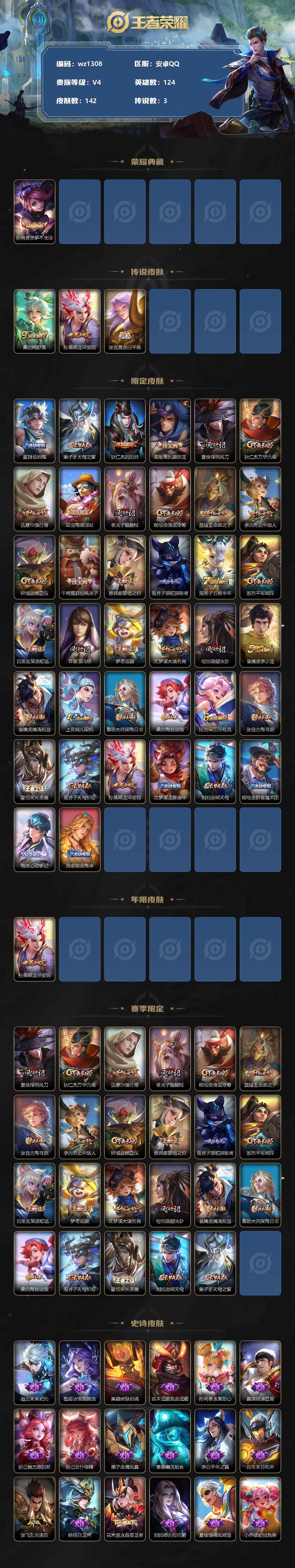 【账号佳】【王者荣耀】【编号:3339610】【可二次实名】【wz1308】【商品标题】:安卓Q-V4-最强王者段位-124英雄-142皮肤-1典藏-0珍品无双-0无双-0珍品传说-3传说-42史诗 【荣耀典藏】:孙尚香杀手不太冷 【传说皮肤】:桑启鸣野蒿,孙策乘龙淬吴钩,张良黄金白羊座 【限定皮肤】:蒙犽顽岩魄,姜子牙天穹之誓,狄仁杰阴阳师,高渐离玩趣恶龙,夏侯惇朔风刀,狄仁杰万华元夜,达摩沙漠行僧,项羽海滩派对,老夫子醍醐杖,程咬金演武夺筹,兰陵王金庭之子,李元芳云中旅人,钟馗驱傩正仪,干将莫邪胡桃夹子,雅典娜黎明之约,鬼谷子原初探秘者,鬼谷子五谷丰年,苏烈千军破阵,百里玄策原初追逐者,弈星混沌棋,梦奇顽趣,沈梦溪大漠名商,明世隐疑决卦,裴擒虎李小龙,裴擒虎擒涛扼浪,上官婉儿梁祝,鲁班大师探海日志,桑启海盐诗旅,阿古朵江河有灵,张良古海寻踪,蒙恬荣光圣徽,鬼谷子天穹祈灯,孙策乘龙淬吴钩,沈梦溪龙舞盛年,刘邦剑破天穹,程咬金群星魔术团,海诺心动手记,周瑜熔金海岸 【年限皮肤】:孙策乘龙淬吴钩 【赛季限定】:夏侯惇朔风刀,狄仁杰万华元夜,达摩沙漠行僧,老夫子醍醐杖,程咬金演武夺筹,兰陵王金庭之子,张良古海寻踪,李元芳云中旅人,钟馗驱傩正仪,雅典娜黎明之约,鬼谷子原初探秘者,苏烈千军破阵,百里玄策原初追逐者,弈星混沌棋,梦奇顽趣,沈梦溪大漠名商,明世隐疑决卦,裴擒虎擒涛扼浪,鲁班大师探海日志,桑启海盐诗旅,鬼谷子天穹祈灯,蒙恬荣光圣徽,刘邦剑破天穹,姜子牙天穹之誓 【史诗皮肤】:赵云未来纪元,甄姬冰雪圆舞曲,廉颇地狱岩魂,宫本武藏鬼剑武藏,孙尚香水果甜心,嬴政摇滚巨星,妲己魅力维加斯,妲己女仆咖啡,墨子金属风暴,曹操幽灵船长,李白千年之狐,吕布末日机甲,张飞乱世虎臣,韩信白龙吟,花木兰水晶猎龙者,刘邦德古拉伯爵,夏侯惇乘风破浪,小乔缤纷独角兽,兰陵王暗隐猎兽者,亚瑟心灵战警,百里守约特工魅影,铠曙光守护者,李元芳逐浪之夏,白起星夜王子,阿轲节奏热浪,孙策猫狗日记,狄仁杰鹰眼统帅,上官婉儿梁祝,橘右京修罗,百里玄策原初追逐者,裴擒虎李小龙,雅典娜黎明之约,鬼谷子五谷丰年,梦奇顽趣,刘禅电玩爆裂旋风,阿古朵江河有灵,周瑜雪夜绮愿,蒙恬荣光圣徽,海诺心动手记,蒙犽顽岩魄,弈星万物之道,黄忠百相守梦 【其他皮肤】:项羽海滩派对,韩信街头霸王,赵云忍炎影,牛魔西部大镖客,武则天东方不败,扁鹊救世之瞳,宫本武藏未来纪元,孙膑天使之翼,典韦黄金武士,亚瑟死亡骑士,花木兰兔女郎,张飞五福同心,甄姬花好人间,狄仁杰阴阳师,刘备纽约教父,关羽龙腾万里,王昭君幻想奇妙夜,老夫子功夫老勺,诸葛亮掌控之力,李白敏锐之力,鬼谷子幻乐之宴,苏烈坚韧之力,大乔守护之力,明世隐虹云星官,吕布野性能量,孙膑归虚梦演,高渐离玩趣恶龙,姜子牙炽热元素使,夏侯惇朔风刀,弈星混沌棋,哪吒次元突破,明世隐疑决卦,老夫子醍醐杖,狂铁特工战影,鬼谷子原初探秘者,狄仁杰万华元夜,程咬金演武夺筹,张良缤纷绘卷,钟馗驱傩正仪,鲁班大师乓乓大师,苏烈千军破阵,干将莫邪胡桃夹子,达摩沙漠行僧,兰陵王金庭之子,沈梦溪大漠名商,蒙恬蔚蓝守将,李元芳云中旅人,桑启海盐诗旅,猪八戒潮玩探月行,裴擒虎擒涛扼浪,太乙真人劲辣红锅,莱西奥西部游侠,鲁班大师探海日志,李元芳妄想特派,哪吒热血海滩,张良古海寻踪,后羿完美运算,鬼谷子天穹祈灯,沈梦溪龙舞盛年,刘邦剑破天穹,程咬金群星魔术团,姜子牙天穹之誓,周瑜熔金海岸,盘古敬我三分,东皇太一噬灭天穹,苍苍林狼骑,太乙真人谧流熔炉,典韦铁骨偃魂,西施雪境奇遇,姜子牙星梦巡礼,少司缘灵卦秘语,阿古朵布丁狗之约,甄姬逆浪荇歌,庄周锦麟游梦,项羽帝国元帅,钟无艳生化警戒,花木兰剑舞者,张良一千零一夜,孙膑未来旅行,李白范海辛,雅典娜战争女神,马可波罗激情绿茵,苍维京掠夺者,太乙真人圆桌骑士,黄忠芝加哥教父,鬼谷子阿摩司公爵,铠龙域领主,百里守约绝影神枪,百里玄策威尼斯狂欢,弈星踏雪寻梅,元歌午夜歌剧院,伽罗花见巫女,曜归虚梦演,蒙恬秩序猎龙将,云缨赤焰之缨,桑启画中游 【内测皮肤】:高渐离玩趣恶龙,狂铁特工战影,干将莫邪胡桃夹子 【营地ID】:1721954723
