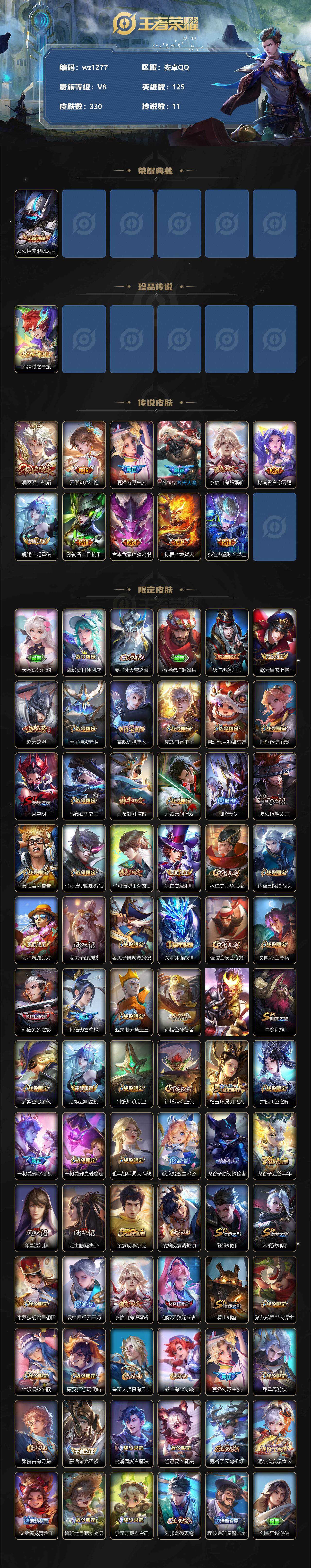 【账号佳】【王者荣耀】【编号:3339615】【可二次实名】【wz1277】【商品标题】:安卓Q-V8-至尊星耀III段位-125英雄-330皮肤-1典藏-0珍品无双-0无双-1珍品传说-11传说-88史诗 【荣耀典藏】:夏侯惇无限飓风号 【珍品传说】:孙策时之奇旅 【传说皮肤】:澜愿照九州拓,云缨幻光神枪,夏洛特浮生妄,孙悟空齐天大圣,李信山海炽霜斩,孙尚香音你闪耀,虞姬启明星使,孙尚香末日机甲,宫本武藏地狱之眼,孙悟空地狱火,狄仁杰超时空战士 【限定皮肤】:大乔绒语心约,虞姬夏日便利店,姜子牙天穹之誓,杨戬破阵退雄兵,狄仁杰阴阳师,赵云皇家上将,赵云龙胆,墨子神迹守卫,嬴政优雅恋人,嬴政白昼王子,鲁班七号狮舞东方,阿轲迷踪丽影,芈月重明,吕布猎兽之王,吕布御风骁将,元歌云间偶戏,元歌无心,夏侯惇朔风刀,典韦蓝屏警告,马可波罗暗影游猎,马可波罗山海玄木吟,狄仁杰魔术师,狄仁杰万华元夜,达摩星际陆战队,项羽海滩派对,老夫子醍醐杖,老夫子航海奇遇记,关羽冰锋战神,程咬金演武夺筹,刘邦夺宝奇兵,韩信逐梦之影,韩信傲雪梅枪,亚瑟潮玩骑士王,孙悟空孙行者,孙悟空齐天大圣,牛魔御旌,后羿圣弓游侠,虞姬启明星使,钟馗神迹守卫,钟馗驱傩正仪,杨玉环遇见飞天,女娲朔望之晖,干将莫邪冰霜恋舞曲,干将莫邪真爱魔法,雅典娜单词大作战,蔡文姬繁星吟游,鬼谷子原初探秘者,鬼谷子五谷丰年,弈星混沌棋,明世隐疑决卦,裴擒虎李小龙,裴擒虎擒涛扼浪,狂铁御狮,米莱狄御霄,米莱狄胡桃异想国,云中君纤云弄巧,李信山海炽霜斩,伽罗天狼溯光者,盾山御銮,猪八戒西部大镖客,嫦娥暖冬兔眠,蒙犽狂想玩偶喵,鲁班大师探海日志,桑启海盐诗旅,夏洛特浮生妄,暃星界游侠,张良古海寻踪,蒙恬荣光圣徽,高渐离燃音魔法,妲己灵卜魔法,鬼谷子天穹祈灯,姬小满妄想食味,沈梦溪龙舞盛年,鲁班七号蔬乡物语,李元芳蔬乡物语,刘邦剑破天穹,程咬金群星魔术团,刘备异域游侠,周瑜熔金海岸 【年限皮肤】:吕布御风骁将,赵云龙胆,马可波罗山海玄木吟,李信山海炽霜斩 【赛季限定】:芈月重明,夏侯惇朔风刀,狄仁杰万华元夜,老夫子醍醐杖,程咬金演武夺筹,张良古海寻踪,牛魔御旌,钟馗驱傩正仪,鬼谷子原初探秘者,弈星混沌棋,明世隐疑决卦,裴擒虎擒涛扼浪,狂铁御狮,米莱狄御霄,盾山御銮,鲁班大师探海日志,桑启海盐诗旅,鬼谷子天穹祈灯,蒙恬荣光圣徽,刘邦剑破天穹,姜子牙天穹之誓 【战令限定】:墨子神迹守卫,虞姬夏日便利店,嬴政白昼王子,鲁班七号狮舞东方,阿轲迷踪丽影,吕布猎兽之王,元歌云间偶戏,典韦蓝屏警告,马可波罗暗影游猎,达摩星际陆战队,老夫子航海奇遇记,刘邦夺宝奇兵,亚瑟潮玩骑士王,后羿圣弓游侠,钟馗神迹守卫,女娲朔望之晖,干将莫邪真爱魔法,雅典娜单词大作战,米莱狄胡桃异想国,猪八戒西部大镖客,嫦娥暖冬兔眠,蒙犽狂想玩偶喵,暃星界游侠,高渐离燃音魔法,妲己灵卜魔法,鲁班七号蔬乡物语,李元芳蔬乡物语 【史诗皮肤】:项羽苍穹之光,露娜紫霞仙子,赵云皇家上将,赵云未来纪元,貂蝉圣诞恋歌,甄姬冰雪圆舞曲,王昭君偶像歌手,狄仁杰魔术师,廉颇地狱岩魂,宫本武藏鬼剑武藏,孙尚香水果甜心,嬴政优雅恋人,嬴政暗夜贵公子,嬴政摇滚巨星,妲己魅力维加斯,妲己女仆咖啡,墨子金属风暴,吕布圣诞狂欢,刘禅绅士熊喵,曹操幽灵船长,张飞乱世虎臣,韩信白龙吟,关羽冰锋战神,刘邦德古拉伯爵,韩信逐梦之影,小乔缤纷独角兽,诸葛亮黄金分割率,亚瑟心灵战警,雅典娜冰冠公主,百里守约特工魅影,铠曙光守护者,蔡文姬舞动绿茵,李元芳逐浪之夏,程咬金功夫厨神,白起星夜王子,阿轲节奏热浪,杨玉环遇见飞天,嬴政白昼王子,孙策猫狗日记,干将莫邪冰霜恋舞曲,典韦蓝屏警告,鲁班七号狮舞东方,狄仁杰鹰眼统帅,公孙离无限星赏官,蔡文姬繁星吟游,娜可露露晚萤,小乔青蛇,不知火舞魅语,阿轲迷踪丽影,橘右京修罗,赵云龙胆,孙尚香时之恋人,马可波罗暗影游猎,蒙犽狂想玩偶喵,裴擒虎李小龙,云中君纤云弄巧,元歌云间偶戏,吕布御风骁将,米莱狄胡桃异想国,百里玄策热力回旋,老夫子航海奇遇记,伽罗天狼溯光者,杨戬天秀启明,干将莫邪真爱魔法,钟馗乐园奇幻夜,孙悟空孙行者,韩信傲雪梅枪,夏洛特永昼,鬼谷子五谷丰年,元歌无心,暃星界游侠,马可波罗山海玄木吟,妲己灵卜魔法,高渐离燃音魔法,蒙恬荣光圣徽,姬小满妄想食味,鲁班七号蔬乡物语,黄忠怒海争锋,百里守约百相守梦,牛魔星界战将,孙膑茶境仙,赵怀真器灵浮梦炉,阿轲化蝶舞,刘禅鸭鸭历险记,狂铁龙之律动,百里守约雪豹霜爪,后羿石田雨龙,周瑜百相守梦,黄忠百相守梦 【其他皮肤】:项羽海滩派对,韩信教廷特使,露娜哥特玫瑰,阿轲爱心护理,达摩大发明家,赵云忍炎影,芈月红桃皇后,白起白色死神,牛魔西部大镖客,扁鹊化身博士,安琪拉玩偶对对碰,孙膑天使之翼,姜子牙时尚教父,妲己少女阿狸,典韦黄金武士,亚瑟死亡骑士,达摩拳王