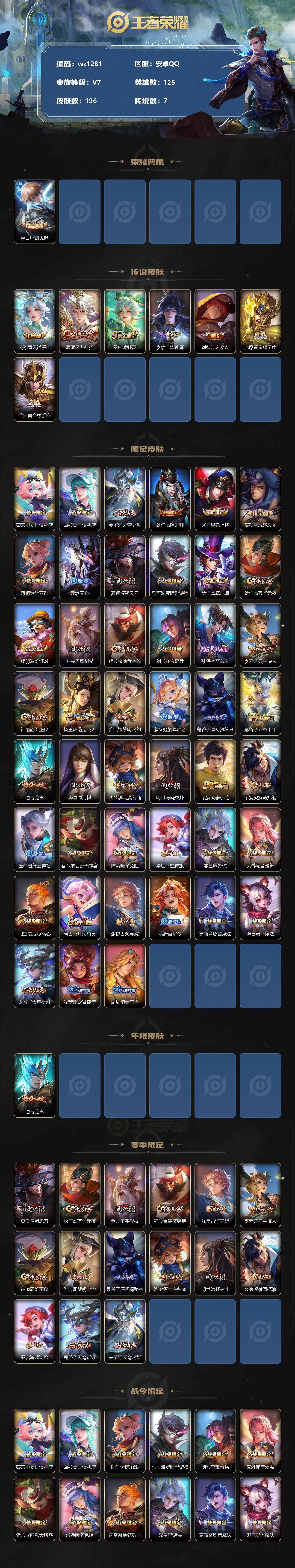 【账号佳】【王者荣耀】【编号:3339619】【可二次实名】【wz1281】【商品标题】:安卓Q-V7-至尊星耀II段位-125英雄-196皮肤-1典藏-0珍品无双-0无双-0珍品传说-7传说-60史诗 【荣耀典藏】:李白鸣剑曳影 【传说皮肤】:公孙离云诺千山,澜愿照九州拓,桑启鸣野蒿,李信一念神魔,刘备时之恋人,达摩黄金狮子座,后羿黄金射手座 【限定皮肤】:蔡文姬夏日便利店,虞姬夏日便利店,姜子牙天穹之誓,狄仁杰阴阳师,赵云皇家上将,高渐离玩趣恶龙,阿轲迷踪丽影,元歌无心,夏侯惇朔风刀,马可波罗暗影游猎,狄仁杰魔术师,狄仁杰万华元夜,项羽海滩派对,老夫子醍醐杖,程咬金演武夺筹,刘邦夺宝奇兵,孙悟空至尊宝,李元芳云中旅人,钟馗驱傩正仪,杨玉环遇见飞天,雅典娜黎明之约,蔡文姬繁星吟游,鬼谷子原初探秘者,鬼谷子五谷丰年,铠青龙志,弈星混沌棋,沈梦溪大漠名商,明世隐疑决卦,裴擒虎李小龙,裴擒虎擒涛扼浪,云中君纤云弄巧,猪八戒西部大镖客,嫦娥暖冬兔眠,桑启海盐诗旅,暃星界游侠,艾琳流音漫舞,司空震地狱燃心,阿古朵江河有灵,张良古海寻踪,蒙犽百解令,高渐离燃音魔法,妲己灵卜魔法,鬼谷子天穹祈灯,沈梦溪龙舞盛年,周瑜熔金海岸 【年限皮肤】:铠青龙志 【赛季限定】:夏侯惇朔风刀,狄仁杰万华元夜,老夫子醍醐杖,程咬金演武夺筹,张良古海寻踪,李元芳云中旅人,钟馗驱傩正仪,雅典娜黎明之约,鬼谷子原初探秘者,弈星混沌棋,沈梦溪大漠名商,明世隐疑决卦,裴擒虎擒涛扼浪,桑启海盐诗旅,鬼谷子天穹祈灯,姜子牙天穹之誓 【战令限定】:蔡文姬夏日便利店,虞姬夏日便利店,阿轲迷踪丽影,马可波罗暗影游猎,刘邦夺宝奇兵,艾琳流音漫舞,猪八戒西部大镖客,嫦娥暖冬兔眠,司空震地狱燃心,暃星界游侠,高渐离燃音魔法,妲己灵卜魔法 【史诗皮肤】:露娜紫霞仙子,赵云皇家上将,赵云未来纪元,甄姬冰雪圆舞曲,王昭君偶像歌手,狄仁杰魔术师,廉颇地狱岩魂,宫本武藏鬼剑武藏,孙尚香水果甜心,嬴政摇滚巨星,妲己魅力维加斯,妲己女仆咖啡,吕布圣诞狂欢,曹操幽灵船长,李白千年之狐,吕布末日机甲,张飞乱世虎臣,孙悟空至尊宝,花木兰水晶猎龙者,刘邦德古拉伯爵,夏侯惇乘风破浪,小乔缤纷独角兽,兰陵王暗隐猎兽者,亚瑟心灵战警,安琪拉心灵骇客,百里守约特工魅影,铠曙光守护者,刘禅天才门将,李元芳逐浪之夏,程咬金功夫厨神,白起星夜王子,杨玉环遇见飞天,孙策猫狗日记,铠青龙志,狄仁杰鹰眼统帅,蔡文姬繁星吟游,不知火舞魅语,阿轲迷踪丽影,橘右京修罗,瑶遇见神鹿,马可波罗暗影游猎,裴擒虎李小龙,云中君纤云弄巧,杨戬天秀启明,钟馗乐园奇幻夜,司马懿暗渊魔法,雅典娜黎明之约,鬼谷子五谷丰年,元歌无心,暃星界游侠,司空震地狱燃心,阿古朵江河有灵,蒙犽百解令,妲己灵卜魔法,高渐离燃音魔法,蔡文姬夏日便利店,百里守约百相守梦,弈星万物之道,赵怀真器灵浮梦炉,阿轲化蝶舞,狂铁龙之律动 【其他皮肤】:项羽海滩派对,韩信教廷特使,韩信街头霸王,赵云白执事,赵云忍炎影,芈月红桃皇后,程咬金星际陆战队,白起白色死神,武则天东方不败,扁鹊救世之瞳,宫本武藏未来纪元,孙膑天使之翼,妲己少女阿狸,典韦黄金武士,亚瑟死亡骑士,达摩拳王,花木兰兔女郎,甄姬花好人间,宫本武藏万象初新,狄仁杰阴阳师,刘备纽约教父,刘备汉昭烈帝,关羽龙腾万里,钟无艳海滩丽影,宫本武藏霸王丸,王昭君幻想奇妙夜,狂铁命运角斗场,老夫子功夫老勺,诸葛亮掌控之力,鬼谷子幻乐之宴,大乔守护之力,明世隐虹云星官,小乔丁香结,高渐离玩趣恶龙,沈梦溪鲨炮海盗猫,姜子牙炽热元素使,夏侯惇朔风刀,弈星混沌棋,哪吒次元突破,鲁班七号黑桃队长,明世隐疑决卦,刘邦夺宝奇兵,盾山圆桌骑士,老夫子醍醐杖,猪八戒西部大镖客,鬼谷子原初探秘者,狄仁杰万华元夜,刘禅秘密基地,露娜瓷语鉴心,程咬金演武夺筹,钟馗驱傩正仪,鲁班大师乓乓大师,典韦铁甲之心,马可波罗潮玩牛仔,米莱狄契约魔法,沈梦溪大漠名商,李元芳云中旅人,桑启海盐诗旅,嫦娥暖冬兔眠,海月幻泉雾影,猪八戒潮玩探月行,白起乐园追猎者,赵怀真太极少年,裴擒虎擒涛扼浪,太乙真人劲辣红锅,姬小满零食大作战,艾琳流音漫舞,张良古海寻踪,兰陵王幻夜行动,曹操决胜大满贯,后羿完美运算,鬼谷子天穹祈灯,妲己灵卜魔法,海诺时空谍影,廉颇功夫炙烤,亚瑟鸿运当头,沈梦溪龙舞盛年,姜子牙天穹之誓,周瑜熔金海岸,虞姬夏日便利店,盘古敬我三分,东皇太一噬灭天穹,老夫子百相守梦,干将莫邪雾都夜雨,苍苍林狼骑,太乙真人谧流熔炉,典韦铁骨偃魂,西施雪境奇遇,戈娅玫蓝誓约,刘备浪漫序章,钟馗虚灵犬护,苏烈春野闲踪,张良灵野札记,露娜命运加冕,姬小满小满鸭,白起死霸装,狄仁杰锦衣卫,曹操超能战警,小乔万圣前夜,后羿精灵王,钟馗地府判官,李元芳特种部队,杨戬埃及法老,诸葛亮星航指挥官,大乔伊势巫女,东皇太一东海龙王,干将莫邪第七人偶,