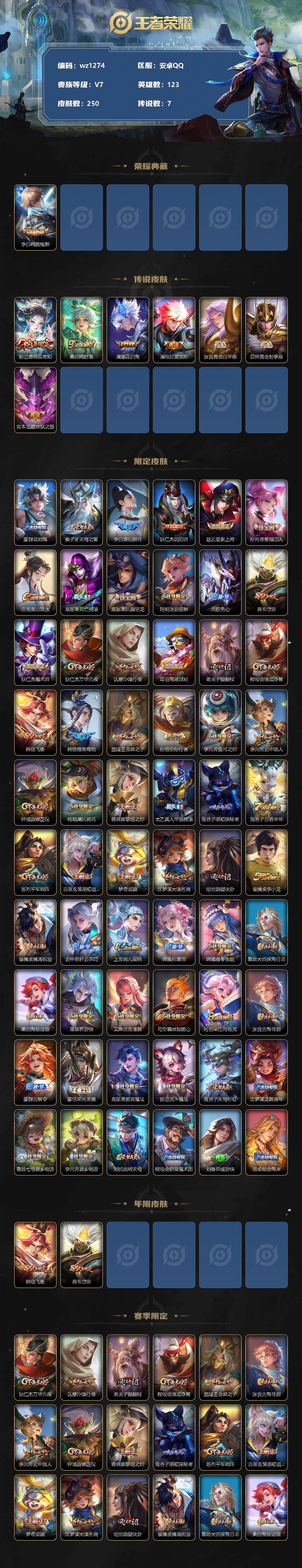 【账号佳】【王者荣耀】【编号:3339620】【可二次实名】【wz1274】【商品标题】:安卓Q-V7-最强王者段位-123英雄-250皮肤-1典藏-0珍品无双-0无双-0珍品传说-7传说-70史诗 【荣耀典藏】:李白鸣剑曳影 【传说皮肤】:妲己愿照众生和,桑启鸣野蒿,澜逐花归海,澜电玩雷克斯,张良黄金白羊座,后羿黄金射手座,宫本武藏地狱之眼 【限定皮肤】:蒙犽顽岩魄,姜子牙天穹之誓,李白谪仙醉月,狄仁杰阴阳师,赵云皇家上将,孙尚香蔷薇恋人,庄周高山流水,高渐离死亡摇滚,高渐离玩趣恶龙,阿轲迷踪丽影,元歌无心,典韦岱宗,狄仁杰魔术师,狄仁杰万华元夜,达摩沙漠行僧,项羽海滩派对,老夫子醍醐杖,程咬金演武夺筹,韩信飞衡,韩信傲雪梅枪,兰陵王金庭之子,孙悟空孙行者,李元芳银河之约,李元芳云中旅人,钟馗驱傩正仪,杨戬潮玩骑兵,雅典娜黎明之约,太乙真人华丽摇滚,鬼谷子原初探秘者,鬼谷子五谷丰年,苏烈千军破阵,百里玄策原初追逐者,梦奇顽趣,沈梦溪大漠名商,明世隐疑决卦,裴擒虎李小龙,裴擒虎擒涛扼浪,云中君纤云弄巧,上官婉儿梁祝,嫦娥拒霜思,嫦娥暖冬兔眠,鲁班大师探海日志,桑启海盐诗旅,暃星界游侠,艾琳流音漫舞,司空震地狱燃心,阿古朵江河有灵,张良古海寻踪,蒙犽百解令,蒙恬荣光圣徽,高渐离燃音魔法,妲己灵卜魔法,鬼谷子天穹祈灯,沈梦溪龙舞盛年,鲁班七号蔬乡物语,李元芳蔬乡物语,刘邦剑破天穹,程咬金群星魔术团,刘备异域游侠,周瑜熔金海岸 【年限皮肤】:韩信飞衡,典韦岱宗 【赛季限定】:狄仁杰万华元夜,达摩沙漠行僧,老夫子醍醐杖,程咬金演武夺筹,兰陵王金庭之子,张良古海寻踪,李元芳云中旅人,钟馗驱傩正仪,雅典娜黎明之约,鬼谷子原初探秘者,苏烈千军破阵,百里玄策原初追逐者,梦奇顽趣,沈梦溪大漠名商,明世隐疑决卦,裴擒虎擒涛扼浪,鲁班大师探海日志,桑启海盐诗旅,鬼谷子天穹祈灯,蒙恬荣光圣徽,刘邦剑破天穹,姜子牙天穹之誓 【战令限定】:阿轲迷踪丽影,艾琳流音漫舞,李元芳银河之约,杨戬潮玩骑兵,嫦娥暖冬兔眠,司空震地狱燃心,暃星界游侠,高渐离燃音魔法,妲己灵卜魔法,鲁班七号蔬乡物语,李元芳蔬乡物语 【史诗皮肤】:项羽苍穹之光,赵云皇家上将,赵云未来纪元,貂蝉圣诞恋歌,甄姬冰雪圆舞曲,王昭君偶像歌手,狄仁杰魔术师,宫本武藏鬼剑武藏,孙尚香蔷薇恋人,孙尚香水果甜心,嬴政摇滚巨星,妲己魅力维加斯,妲己女仆咖啡,墨子龙骑士,墨子金属风暴,吕布圣诞狂欢,刘禅绅士熊喵,李白千年之狐,吕布末日机甲,花木兰水晶猎龙者,兰陵王暗隐猎兽者,诸葛亮黄金分割率,百里守约特工魅影,铠曙光守护者,刘禅天才门将,李元芳逐浪之夏,程咬金功夫厨神,白起星夜王子,阿轲节奏热浪,孙策猫狗日记,伽罗箭羽风息,狄仁杰鹰眼统帅,上官婉儿梁祝,李元芳银河之约,韩信飞衡,典韦岱宗,小乔青蛇,阿轲迷踪丽影,橘右京修罗,百里玄策原初追逐者,裴擒虎李小龙,云中君纤云弄巧,孙悟空孙行者,庄周高山流水,嫦娥拒霜思,雅典娜黎明之约,韩信傲雪梅枪,张良千筹问战,鬼谷子五谷丰年,元歌无心,梦奇顽趣,暃星界游侠,司空震地狱燃心,阿古朵江河有灵,蒙犽百解令,妲己灵卜魔法,高渐离燃音魔法,蒙恬荣光圣徽,鲁班七号蔬乡物语,黄忠怒海争锋,蒙犽顽岩魄,姬小满战舞者,亚连破空之剑,李白谪仙醉月,百里守约百相守梦,牛魔星界战将,孙膑茶境仙,阿轲化蝶舞,刘禅鸭鸭历险记,狂铁龙之律动,黄忠百相守梦 【其他皮肤】:项羽海滩派对,韩信教廷特使,韩信街头霸王,达摩大发明家,赵云白执事,赵云忍炎影,芈月红桃皇后,白起白色死神,扁鹊化身博士,宫本武藏未来纪元,安琪拉玩偶对对碰,孙膑天使之翼,妲己少女阿狸,典韦黄金武士,亚瑟死亡骑士,达摩拳王,花木兰兔女郎,张飞五福同心,宫本武藏万象初新,后羿阿尔法小队,狄仁杰阴阳师,刘备纽约教父,高渐离死亡摇滚,刘备汉昭烈帝,李元芳黑猫爱糖果,关羽龙腾万里,钟无艳海滩丽影,狂铁命运角斗场,老夫子功夫老勺,孙尚香沉稳之力,诸葛亮掌控之力,李白敏锐之力,鬼谷子幻乐之宴,太乙真人华丽摇滚,苏烈坚韧之力,明世隐虹云星官,小乔丁香结,吕布野性能量,高渐离玩趣恶龙,沈梦溪鲨炮海盗猫,姜子牙炽热元素使,哪吒次元突破,鲁班七号黑桃队长,明世隐疑决卦,老夫子醍醐杖,狂铁特工战影,鬼谷子原初探秘者,狄仁杰万华元夜,刘禅秘密基地,程咬金演武夺筹,钟馗驱傩正仪,鲁班大师乓乓大师,苏烈千军破阵,达摩沙漠行僧,程咬金无双福将,兰陵王金庭之子,沈梦溪大漠名商,蒙犽胡桃狂想曲,蒙恬蔚蓝守将,李元芳云中旅人,戈娅危途狂花,刘备潮玩造梦师,桑启海盐诗旅,嫦娥暖冬兔眠,海月幻泉雾影,猪八戒潮玩探月行,牛魔牛运亨通,赵怀真太极少年,裴擒虎擒涛扼浪,杨戬潮玩骑兵,太乙真人劲辣红锅,莱西奥西部游侠,鲁班大师探海日志,艾琳流音漫舞,张良古海寻踪,海月王牌新星,亚连破局者,兰陵王幻夜行动,曹操决胜大满贯,后羿完美