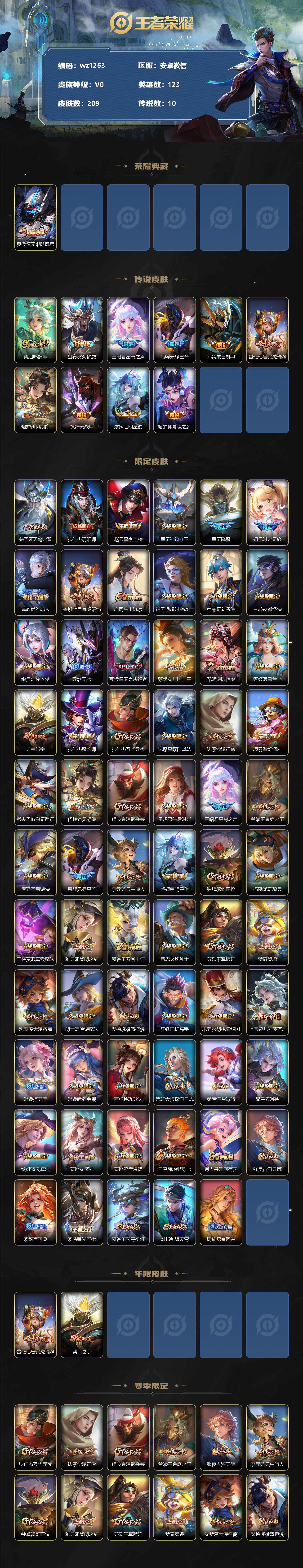 【账号佳】【王者荣耀】【编号:3339623】【可二次实名】【wz1263】【商品标题】:安卓WX-V0-至尊星耀II段位-123英雄-209皮肤-1典藏-0珍品无双-0无双-0珍品传说-10传说-68史诗 【荣耀典藏】:夏侯惇无限飓风号 【传说皮肤】:桑启鸣野蒿,吕布怒海麟威,王昭君星穹之声,后羿无尽星芒,孙策末日机甲,鲁班七号寅虎瑞焰,貂蝉遇见胡旋,铠绛天战甲,虞姬启明星使,貂蝉仲夏夜之梦 【限定皮肤】:姜子牙天穹之誓,狄仁杰阴阳师,赵云皇家上将,墨子神迹守卫,墨子降魔,妲己时之奇旅,嬴政优雅恋人,鲁班七号寅虎瑞焰,庄周高山流水,钟无艳超时空战士,扁鹊奇幻香踪,白起夜都怪侠,芈月幻夜卜梦,元歌无心,夏侯惇匿光决锋者,甄姬女儿国国王,甄姬游园惊梦,甄姬落雪兰心,典韦岱宗,狄仁杰魔术师,狄仁杰万华元夜,达摩星际陆战队,达摩沙漠行僧,项羽海滩派对,老夫子航海奇遇记,貂蝉遇见胡旋,程咬金演武夺筹,王昭君午后时光,王昭君星穹之声,兰陵王金庭之子,后羿圣弓游侠,后羿无尽星芒,李元芳云中旅人,虞姬启明星使,钟馗驱傩正仪,杨戬潮玩骑兵,干将莫邪真爱魔法,雅典娜黎明之约,鬼谷子五谷丰年,黄忠火炮绅士,苏烈千军破阵,梦奇顽趣,沈梦溪大漠名商,明世隐吟游魔法,裴擒虎擒涛扼浪,狂铁电玩高手,米莱狄胡桃异想国,上官婉儿神器万象笔,嫦娥拒霜思,嫦娥暖冬兔眠,西施玲珑珍味,鲁班大师探海日志,桑启海盐诗旅,暃星界游侠,戈娅驭风魔法,艾琳女武神,艾琳流音漫舞,司空震地狱燃心,阿古朵江河有灵,张良古海寻踪,蒙犽百解令,蒙恬荣光圣徽,鬼谷子天穹祈灯,刘邦剑破天穹,周瑜熔金海岸 【年限皮肤】:鲁班七号寅虎瑞焰,典韦岱宗 【赛季限定】:狄仁杰万华元夜,达摩沙漠行僧,程咬金演武夺筹,兰陵王金庭之子,张良古海寻踪,李元芳云中旅人,钟馗驱傩正仪,雅典娜黎明之约,苏烈千军破阵,梦奇顽趣,沈梦溪大漠名商,裴擒虎擒涛扼浪,鲁班大师探海日志,桑启海盐诗旅,鬼谷子天穹祈灯,蒙恬荣光圣徽,刘邦剑破天穹,姜子牙天穹之誓 【战令限定】:墨子神迹守卫,钟无艳超时空战士,扁鹊奇幻香踪,白起夜都怪侠,芈月幻夜卜梦,甄姬落雪兰心,达摩星际陆战队,老夫子航海奇遇记,王昭君午后时光,艾琳流音漫舞,后羿圣弓游侠,杨戬潮玩骑兵,干将莫邪真爱魔法,黄忠火炮绅士,明世隐吟游魔法,狂铁电玩高手,米莱狄胡桃异想国,嫦娥暖冬兔眠,西施玲珑珍味,司空震地狱燃心,暃星界游侠,戈娅驭风魔法 【史诗皮肤】:项羽苍穹之光,露娜紫霞仙子,赵云嘻哈天王,赵云皇家上将,赵云未来纪元,貂蝉圣诞恋歌,甄姬冰雪圆舞曲,王昭君偶像歌手,狄仁杰魔术师,廉颇地狱岩魂,宫本武藏鬼剑武藏,孙尚香水果甜心,嬴政优雅恋人,嬴政摇滚巨星,妲己魅力维加斯,妲己女仆咖啡,墨子金属风暴,吕布圣诞狂欢,曹操幽灵船长,吕布末日机甲,花木兰水晶猎龙者,刘邦德古拉伯爵,夏侯惇乘风破浪,小乔缤纷独角兽,兰陵王暗隐猎兽者,诸葛亮黄金分割率,甄姬游园惊梦,亚瑟心灵战警,雅典娜冰冠公主,安琪拉心灵骇客,百里守约特工魅影,铠曙光守护者,蔡文姬舞动绿茵,刘禅天才门将,李元芳逐浪之夏,程咬金功夫厨神,白起星夜王子,阿轲节奏热浪,狄仁杰鹰眼统帅,典韦岱宗,小乔青蛇,米莱狄胡桃异想国,老夫子航海奇遇记,干将莫邪真爱魔法,庄周高山流水,嫦娥拒霜思,黄忠火炮绅士,雅典娜黎明之约,甄姬女儿国国王,明世隐吟游魔法,夏侯惇匿光决锋者,高渐离天秀音浪,狂铁电玩高手,钟无艳超时空战士,妲己时之奇旅,鬼谷子五谷丰年,上官婉儿神器万象笔,元歌无心,墨子降魔,梦奇顽趣,暃星界游侠,扁鹊奇幻香踪,刘禅电玩爆裂旋风,戈娅驭风魔法,司空震地狱燃心,阿古朵江河有灵,蒙犽百解令,蒙恬荣光圣徽 【其他皮肤】:项羽海滩派对,韩信教廷特使,韩信街头霸王,露娜哥特玫瑰,阿轲爱心护理,赵云白执事,赵云忍炎影,芈月红桃皇后,艾琳女武神,牛魔西部大镖客,扁鹊化身博士,扁鹊救世之瞳,宫本武藏未来纪元,孙膑天使之翼,姜子牙时尚教父,典韦黄金武士,亚瑟死亡骑士,花木兰兔女郎,张飞五福同心,甄姬花好人间,刘备万事如意,后羿阿尔法小队,狄仁杰阴阳师,刘备纽约教父,刘备汉昭烈帝,关羽龙腾万里,墨子进击墨子号,钟无艳海滩丽影,王昭君幻想奇妙夜,狂铁命运角斗场,老夫子功夫老勺,孙尚香沉稳之力,诸葛亮掌控之力,大乔守护之力,明世隐虹云星官,吕布野性能量,孙膑归虚梦演,沈梦溪鲨炮海盗猫,哪吒次元突破,狂铁特工战影,狄仁杰万华元夜,达摩星际陆战队,程咬金演武夺筹,张良缤纷绘卷,钟馗驱傩正仪,墨子神迹守卫,鲁班大师乓乓大师,苏烈千军破阵,后羿圣弓游侠,典韦铁甲之心,达摩沙漠行僧,芈月幻夜卜梦,白起夜都怪侠,兰陵王金庭之子,刘禅唤灵魔甲,米莱狄契约魔法,王昭君午后时光,沈梦溪大漠名商,蒙恬蔚蓝守将,甄姬落雪兰心,李元芳云中旅人,戈娅危途狂花,刘备潮玩造梦师,桑启海盐诗旅,嫦娥暖冬兔眠,海月幻泉雾影,猪八