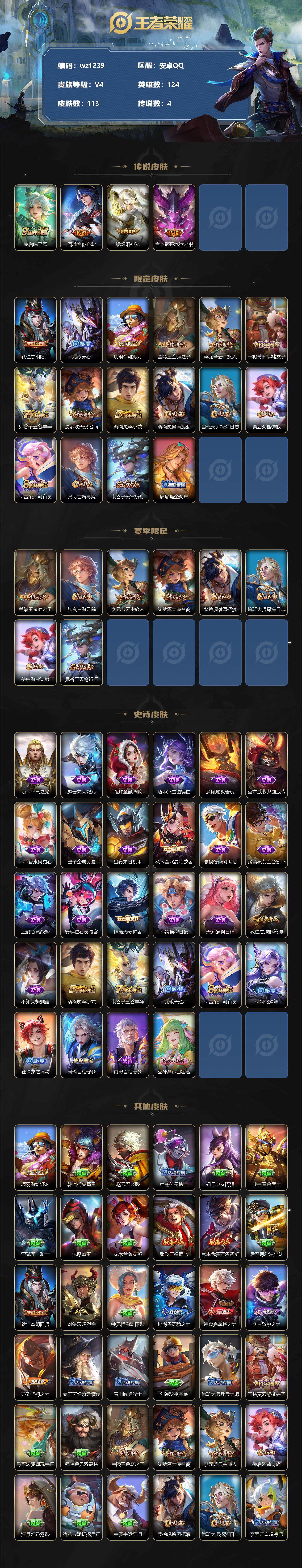 【账号佳】【王者荣耀】【编号:3339640】【可二次实名】【wz1239】【商品标题】:安卓Q-V4-永恒钻石III段位-124英雄-113皮肤-0典藏-0珍品无双-0无双-0珍品传说-4传说-28史诗 【传说皮肤】:桑启鸣野蒿,周瑜音你心动,镜炽阳神光,宫本武藏地狱之眼 【限定皮肤】:狄仁杰阴阳师,元歌无心,项羽海滩派对,兰陵王金庭之子,李元芳云中旅人,干将莫邪胡桃夹子,鬼谷子五谷丰年,沈梦溪大漠名商,裴擒虎李小龙,裴擒虎擒涛扼浪,鲁班大师探海日志,桑启海盐诗旅,阿古朵江河有灵,张良古海寻踪,鬼谷子天穹祈灯,周瑜熔金海岸 【赛季限定】:兰陵王金庭之子,张良古海寻踪,李元芳云中旅人,沈梦溪大漠名商,裴擒虎擒涛扼浪,鲁班大师探海日志,桑启海盐诗旅,鬼谷子天穹祈灯 【史诗皮肤】:项羽苍穹之光,赵云未来纪元,貂蝉圣诞恋歌,甄姬冰雪圆舞曲,廉颇地狱岩魂,宫本武藏鬼剑武藏,孙尚香水果甜心,墨子金属风暴,吕布末日机甲,花木兰水晶猎龙者,夏侯惇乘风破浪,诸葛亮黄金分割率,亚瑟心灵战警,安琪拉心灵骇客,铠曙光守护者,孙策猫狗日记,大乔猫狗日记,狄仁杰鹰眼统帅,不知火舞魅语,裴擒虎李小龙,鬼谷子五谷丰年,元歌无心,阿古朵江河有灵,阿轲化蝶舞,狂铁龙之律动,周瑜百相守梦,黄忠百相守梦,公孙离涂山容容 【其他皮肤】:项羽海滩派对,韩信街头霸王,赵云忍炎影,扁鹊化身博士,妲己少女阿狸,典韦黄金武士,亚瑟死亡骑士,达摩拳王,花木兰兔女郎,张飞五福同心,宫本武藏万象初新,后羿阿尔法小队,狄仁杰阴阳师,刘备汉昭烈帝,钟无艳海滩丽影,孙尚香沉稳之力,诸葛亮掌控之力,李白敏锐之力,苏烈坚韧之力,姜子牙炽热元素使,盾山圆桌骑士,刘禅秘密基地,鲁班大师乓乓大师,干将莫邪胡桃夹子,马可波罗潮玩牛仔,程咬金无双福将,兰陵王金庭之子,沈梦溪大漠名商,李元芳云中旅人,桑启海盐诗旅,海月幻泉雾影,猪八戒潮玩探月行,牛魔牛运亨通,裴擒虎擒涛扼浪,鲁班大师探海日志,李元芳妄想特派,哪吒热血海滩,张良古海寻踪,钟无艳聚星闪耀,鬼谷子天穹祈灯,周瑜熔金海岸,东皇太一噬灭天穹,太乙真人谧流熔炉,西施雪境奇遇,姜子牙星梦巡礼,明世隐景韶洛都,戈娅玫蓝誓约,刘备浪漫序章,钟馗虚灵犬护,苏烈春野闲踪,张良灵野札记,阿古朵布丁狗之约,露娜命运加冕,姬小满小满鸭,白起死霸装,甄姬逆浪荇歌,孙策百相守梦,庄周锦麟游梦,莱西奥踏浪烽翎,哪吒罗小黑战记,鲁班七号福禄兄弟,项羽帝国元帅,曹操超能战警,孙悟空西部大镖客,钟馗地府判官,刘邦圣殿之光,关羽天启骑士,苍维京掠夺者,杨戬埃及法老,诸葛亮星航指挥官,黄忠芝加哥教父,东皇太一东海龙王,铠龙域领主,百里守约绝影神枪,弈星踏雪寻梅,米莱狄精准探案法,李信灼热之刃,猪八戒年年有余,蒙恬秩序猎龙将,澜孤猎,云缨赤焰之缨 【内测皮肤】:干将莫邪胡桃夹子 【营地ID】:1759529931