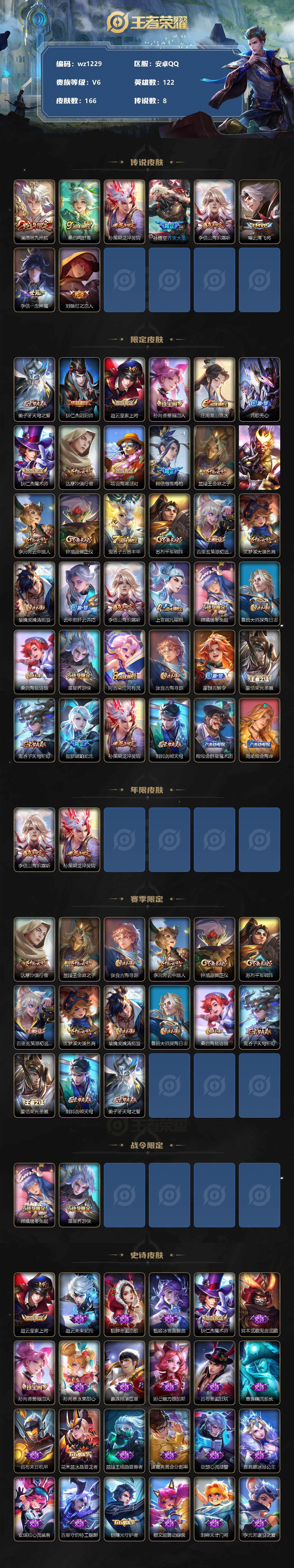 【账号佳】【王者荣耀】【编号:3339647】【可二次实名】【wz1229】【商品标题】:安卓Q-V6-最强王者段位-122英雄-166皮肤-0典藏-0珍品无双-0无双-0珍品传说-8传说-44史诗 【传说皮肤】:澜愿照九州拓,桑启鸣野蒿,孙策乘龙淬吴钩,孙悟空齐天大圣,李信山海炽霜斩,曜云鹰飞将,李信一念神魔,刘备时之恋人 【限定皮肤】:姜子牙天穹之誓,狄仁杰阴阳师,赵云皇家上将,孙尚香蔷薇恋人,庄周高山流水,元歌无心,狄仁杰魔术师,达摩沙漠行僧,项羽海滩派对,韩信傲雪梅枪,兰陵王金庭之子,孙悟空齐天大圣,李元芳云中旅人,钟馗驱傩正仪,鬼谷子五谷丰年,苏烈千军破阵,百里玄策原初追逐者,沈梦溪大漠名商,裴擒虎擒涛扼浪,云中君纤云弄巧,李信山海炽霜斩,上官婉儿梁祝,嫦娥暖冬兔眠,鲁班大师探海日志,桑启海盐诗旅,暃星界游侠,阿古朵江河有灵,张良古海寻踪,蒙犽百解令,蒙恬荣光圣徽,鬼谷子天穹祈灯,伽罗琥珀纪元,孙策乘龙淬吴钩,刘邦剑破天穹,程咬金群星魔术团,周瑜熔金海岸 【年限皮肤】:李信山海炽霜斩,孙策乘龙淬吴钩 【赛季限定】:达摩沙漠行僧,兰陵王金庭之子,张良古海寻踪,李元芳云中旅人,钟馗驱傩正仪,苏烈千军破阵,百里玄策原初追逐者,沈梦溪大漠名商,裴擒虎擒涛扼浪,鲁班大师探海日志,桑启海盐诗旅,鬼谷子天穹祈灯,蒙恬荣光圣徽,刘邦剑破天穹,姜子牙天穹之誓 【战令限定】:嫦娥暖冬兔眠,暃星界游侠 【史诗皮肤】:赵云皇家上将,赵云未来纪元,貂蝉圣诞恋歌,甄姬冰雪圆舞曲,狄仁杰魔术师,宫本武藏鬼剑武藏,孙尚香蔷薇恋人,孙尚香水果甜心,嬴政摇滚巨星,妲己魅力维加斯,吕布圣诞狂欢,曹操幽灵船长,吕布末日机甲,花木兰水晶猎龙者,兰陵王暗隐猎兽者,诸葛亮黄金分割率,亚瑟心灵战警,雅典娜冰冠公主,安琪拉心灵骇客,百里守约特工魅影,铠曙光守护者,蔡文姬舞动绿茵,刘禅天才门将,李元芳逐浪之夏,程咬金功夫厨神,阿轲节奏热浪,狄仁杰鹰眼统帅,上官婉儿梁祝,孙尚香时之恋人,百里玄策原初追逐者,云中君纤云弄巧,庄周高山流水,韩信傲雪梅枪,鬼谷子五谷丰年,元歌无心,暃星界游侠,阿古朵江河有灵,蒙犽百解令,蒙恬荣光圣徽,伽罗琥珀纪元,亚连破空之剑,弈星万物之道,赵怀真器灵浮梦炉,公孙离涂山容容 【其他皮肤】:项羽海滩派对,韩信教廷特使,韩信街头霸王,露娜哥特玫瑰,赵云忍炎影,白起白色死神,牛魔西部大镖客,扁鹊化身博士,宫本武藏未来纪元,妲己少女阿狸,典韦黄金武士,亚瑟死亡骑士,花木兰兔女郎,甄姬花好人间,刘备万事如意,后羿阿尔法小队,狄仁杰阴阳师,刘备纽约教父,关羽龙腾万里,钟无艳海滩丽影,狂铁命运角斗场,老夫子功夫老勺,诸葛亮掌控之力,鬼谷子幻乐之宴,明世隐虹云星官,小乔丁香结,吕布野性能量,沈梦溪鲨炮海盗猫,哪吒次元突破,鲁班七号黑桃队长,狂铁特工战影,刘禅秘密基地,露娜瓷语鉴心,钟馗驱傩正仪,鲁班大师乓乓大师,苏烈千军破阵,达摩沙漠行僧,程咬金无双福将,兰陵王金庭之子,沈梦溪大漠名商,蒙恬蔚蓝守将,李元芳云中旅人,桑启海盐诗旅,嫦娥暖冬兔眠,猪八戒潮玩探月行,赵怀真太极少年,裴擒虎擒涛扼浪,太乙真人劲辣红锅,鲁班大师探海日志,李元芳妄想特派,张良古海寻踪,后羿完美运算,鬼谷子天穹祈灯,海诺时空谍影,刘邦剑破天穹,程咬金群星魔术团,大司命暗都幽影,姜子牙天穹之誓,周瑜熔金海岸,孙悟空神迹守卫,东皇太一噬灭天穹,干将莫邪雾都夜雨,苍苍林狼骑,太乙真人谧流熔炉,典韦铁骨偃魂,西施雪境奇遇,姜子牙星梦巡礼,明世隐景韶洛都,钟馗虚灵犬护,张良灵野札记,阿古朵布丁狗之约,甄姬逆浪荇歌,莱西奥踏浪烽翎,鬼谷子克喵,哪吒罗小黑战记,亚瑟荣光之誓,高渐离金属狂潮,钟无艳生化警戒,貂蝉异域舞娘,孙悟空西部大镖客,后羿精灵王,刘禅英喵野望,李白范海辛,李元芳特种部队,虞姬加勒比小姐,蔡文姬蔷薇王座,夏侯惇战争骑士,马可波罗激情绿茵,诸葛亮星航指挥官,干将莫邪第七人偶,铠龙域领主,百里守约绝影神枪,百里玄策威尼斯狂欢,苏烈爱与和平,明世隐占星师,裴擒虎街头旋风,元歌午夜歌剧院,孙策海之征途,司马懿魇语军师,盾山极冰防御线,伽罗花见巫女,李信灼热之刃,上官婉儿修竹墨客,猪八戒年年有余,盘古创世神祝,云中君荷鲁斯之眼,曜归虚梦演,马超幸存者,阿古朵熊喵少女,澜孤猎,司空震启蛰,云缨赤焰之缨,金蝉前尘,暃碧珀绯影 【内测皮肤】:孙尚香蔷薇恋人,狂铁特工战影 【营地ID】:1846507031