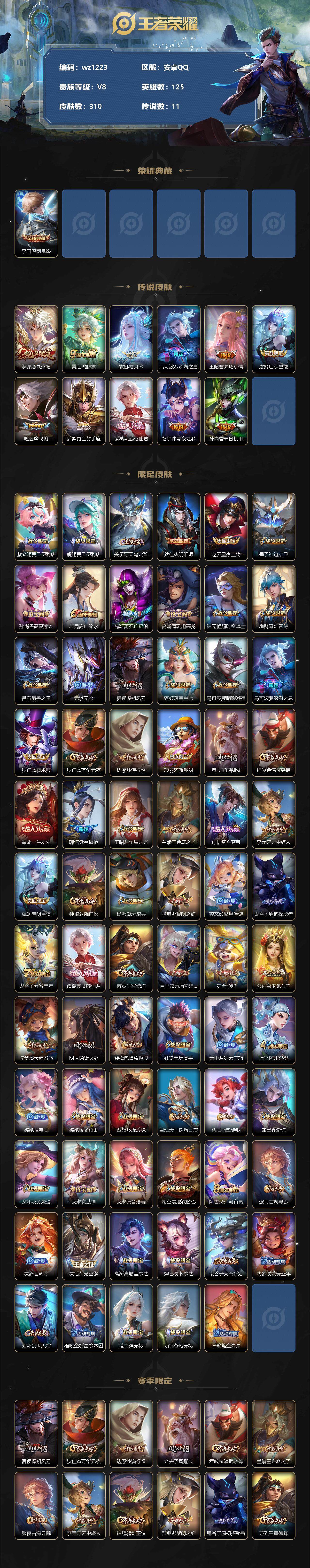 【账号佳】【王者荣耀】【编号:3339648】【可二次实名】【wz1223】【商品标题】:安卓Q-V8-至尊星耀IV段位-125英雄-310皮肤-1典藏-0珍品无双-0无双-0珍品传说-11传说-74史诗 【荣耀典藏】:李白鸣剑曳影 【传说皮肤】:澜愿照九州拓,桑启鸣野蒿,露娜霜月吟,马可波罗深海之息,王昭君乞巧织情,虞姬启明星使,曜云鹰飞将,后羿黄金射手座,诸葛亮武陵仙君,貂蝉仲夏夜之梦,孙尚香末日机甲 【限定皮肤】:蔡文姬夏日便利店,虞姬夏日便利店,姜子牙天穹之誓,狄仁杰阴阳师,赵云皇家上将,墨子神迹守卫,孙尚香蔷薇恋人,庄周高山流水,高渐离死亡摇滚,高渐离玩趣恶龙,钟无艳超时空战士,扁鹊奇幻香踪,吕布猎兽之王,元歌无心,夏侯惇朔风刀,甄姬落雪兰心,马可波罗暗影游猎,马可波罗深海之息,狄仁杰魔术师,狄仁杰万华元夜,达摩沙漠行僧,项羽海滩派对,老夫子醍醐杖,程咬金演武夺筹,露娜一生所爱,韩信傲雪梅枪,王昭君午后时光,兰陵王金庭之子,孙悟空至尊宝,李元芳云中旅人,虞姬启明星使,钟馗驱傩正仪,杨戬潮玩骑兵,雅典娜黎明之约,蔡文姬繁星吟游,鬼谷子原初探秘者,鬼谷子五谷丰年,诸葛亮武陵仙君,苏烈千军破阵,百里玄策原初追逐者,梦奇顽趣,公孙离玉兔公主,沈梦溪大漠名商,明世隐疑决卦,裴擒虎擒涛扼浪,狂铁电玩高手,云中君纤云弄巧,上官婉儿梁祝,嫦娥拒霜思,嫦娥暖冬兔眠,西施玲珑珍味,鲁班大师探海日志,桑启海盐诗旅,暃星界游侠,戈娅驭风魔法,艾琳女武神,艾琳流音漫舞,司空震地狱燃心,阿古朵江河有灵,张良古海寻踪,蒙犽百解令,蒙恬荣光圣徽,高渐离燃音魔法,妲己灵卜魔法,鬼谷子天穹祈灯,沈梦溪龙舞盛年,刘邦剑破天穹,程咬金群星魔术团,镜青焰无极,项羽苍威无极,周瑜熔金海岸 【赛季限定】:夏侯惇朔风刀,狄仁杰万华元夜,达摩沙漠行僧,老夫子醍醐杖,程咬金演武夺筹,兰陵王金庭之子,张良古海寻踪,李元芳云中旅人,钟馗驱傩正仪,雅典娜黎明之约,鬼谷子原初探秘者,苏烈千军破阵,百里玄策原初追逐者,梦奇顽趣,沈梦溪大漠名商,明世隐疑决卦,裴擒虎擒涛扼浪,鲁班大师探海日志,桑启海盐诗旅,鬼谷子天穹祈灯,蒙恬荣光圣徽,刘邦剑破天穹,姜子牙天穹之誓 【战令限定】:墨子神迹守卫,蔡文姬夏日便利店,虞姬夏日便利店,钟无艳超时空战士,扁鹊奇幻香踪,吕布猎兽之王,甄姬落雪兰心,马可波罗暗影游猎,王昭君午后时光,艾琳流音漫舞,杨戬潮玩骑兵,狂铁电玩高手,嫦娥暖冬兔眠,西施玲珑珍味,司空震地狱燃心,暃星界游侠,戈娅驭风魔法,高渐离燃音魔法,妲己灵卜魔法,镜青焰无极,项羽苍威无极 【史诗皮肤】:鲁班七号电玩小子,露娜紫霞仙子,赵云皇家上将,貂蝉圣诞恋歌,甄姬冰雪圆舞曲,王昭君偶像歌手,狄仁杰魔术师,廉颇地狱岩魂,宫本武藏鬼剑武藏,孙尚香蔷薇恋人,孙尚香水果甜心,嬴政暗夜贵公子,妲己魅力维加斯,妲己女仆咖啡,墨子龙骑士,墨子金属风暴,吕布圣诞狂欢,刘禅绅士熊喵,李白千年之狐,吕布末日机甲,张飞乱世虎臣,孙悟空至尊宝,小乔缤纷独角兽,诸葛亮黄金分割率,亚瑟心灵战警,雅典娜冰冠公主,安琪拉心灵骇客,百里守约特工魅影,铠曙光守护者,蔡文姬舞动绿茵,刘禅天才门将,李元芳逐浪之夏,程咬金功夫厨神,白起星夜王子,阿轲节奏热浪,孙策猫狗日记,露娜一生所爱,伽罗箭羽风息,狄仁杰鹰眼统帅,上官婉儿梁祝,蔡文姬繁星吟游,不知火舞魅语,瑶遇见神鹿,马可波罗暗影游猎,百里玄策原初追逐者,云中君纤云弄巧,钟馗乐园奇幻夜,庄周高山流水,嫦娥拒霜思,雅典娜黎明之约,韩信傲雪梅枪,公孙离玉兔公主,澜赏金猎手,狂铁电玩高手,钟无艳超时空战士,鬼谷子五谷丰年,元歌无心,梦奇顽趣,暃星界游侠,扁鹊奇幻香踪,戈娅驭风魔法,司空震地狱燃心,阿古朵江河有灵,蒙犽百解令,妲己灵卜魔法,高渐离燃音魔法,蒙恬荣光圣徽,镜青焰无极,蔡文姬夏日便利店,牛魔星界战将,孙膑茶境仙,狂铁龙之律动,百里守约雪豹霜爪,周瑜百相守梦,黄忠百相守梦 【其他皮肤】:项羽海滩派对,韩信教廷特使,韩信街头霸王,露娜哥特玫瑰,阿轲爱心护理,赵云白执事,赵云忍炎影,芈月红桃皇后,艾琳女武神,程咬金星际陆战队,白起白色死神,牛魔西部大镖客,扁鹊化身博士,宫本武藏未来纪元,安琪拉玩偶对对碰,孙膑天使之翼,姜子牙时尚教父,妲己少女阿狸,典韦黄金武士,亚瑟死亡骑士,达摩拳王,花木兰兔女郎,张飞五福同心,甄姬花好人间,刘备万事如意,宫本武藏万象初新,后羿阿尔法小队,狄仁杰阴阳师,刘备纽约教父,高渐离死亡摇滚,刘备汉昭烈帝,关羽龙腾万里,钟无艳海滩丽影,王昭君幻想奇妙夜,狂铁命运角斗场,老夫子功夫老勺,孙尚香沉稳之力,诸葛亮掌控之力,李白敏锐之力,鬼谷子幻乐之宴,苏烈坚韧之力,大乔守护之力,吕布猎兽之王,明世隐虹云星官,小乔丁香结,吕布野性能量,孙膑归虚梦演,高渐离玩趣恶龙,沈梦溪鲨炮海盗猫,姜子牙炽热元素使,夏侯惇朔风刀