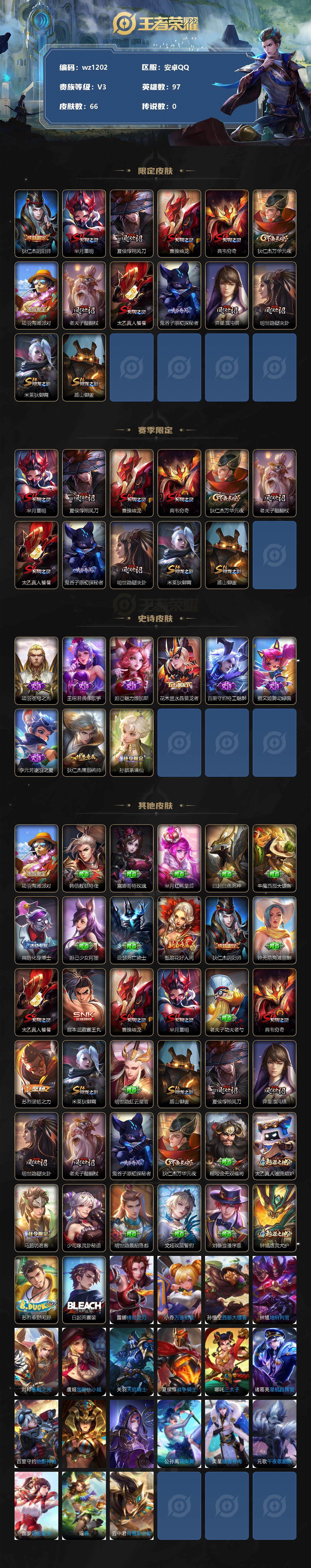 【账号佳】【王者荣耀】【编号:3339688】【可二次实名】【wz1202】【商品标题】:安卓Q-V3-永恒钻石IV段位-97英雄-66皮肤-0典藏-0珍品无双-0无双-0珍品传说-0传说-9史诗 【限定皮肤】:狄仁杰阴阳师,芈月重明,夏侯惇朔风刀,曹操烛龙,典韦穷奇,狄仁杰万华元夜,项羽海滩派对,老夫子醍醐杖,太乙真人饕餮,鬼谷子原初探秘者,弈星混沌棋,明世隐疑决卦,米莱狄御霄,盾山御銮 【赛季限定】:芈月重明,夏侯惇朔风刀,曹操烛龙,典韦穷奇,狄仁杰万华元夜,老夫子醍醐杖,太乙真人饕餮,鬼谷子原初探秘者,弈星混沌棋,明世隐疑决卦,米莱狄御霄,盾山御銮 【史诗皮肤】:项羽苍穹之光,王昭君偶像歌手,妲己魅力维加斯,花木兰水晶猎龙者,百里守约特工魅影,蔡文姬舞动绿茵,李元芳逐浪之夏,狄仁杰鹰眼统帅,孙膑茶境仙 【其他皮肤】:项羽海滩派对,韩信教廷特使,露娜哥特玫瑰,芈月红桃皇后,白起白色死神,牛魔西部大镖客,扁鹊化身博士,妲己少女阿狸,亚瑟死亡骑士,甄姬花好人间,狄仁杰阴阳师,钟无艳海滩丽影,太乙真人饕餮,宫本武藏霸王丸,曹操烛龙,芈月重明,老夫子功夫老勺,典韦穷奇,苏烈坚韧之力,米莱狄御霄,明世隐虹云星官,盾山御銮,夏侯惇朔风刀,弈星混沌棋,明世隐疑决卦,老夫子醍醐杖,鬼谷子原初探秘者,狄仁杰万华元夜,程咬金无双福将,太乙真人谧流熔炉,马超访茗客,少司缘灵卦秘语,明世隐景韶洛都,戈娅玫蓝誓约,刘备浪漫序章,钟馗虚灵犬护,苏烈春野闲踪,白起死霸装,露娜绯红之刃,小乔万圣前夜,孙悟空西部大镖客,钟馗地府判官,刘邦圣殿之光,虞姬加勒比小姐,关羽天启骑士,夏侯惇战争骑士,哪吒三太子,诸葛亮星航指挥官,百里守约绝影神枪,女娲尼罗河女神,明世隐占星师,公孙离花间舞,弈星踏雪寻梅,元歌午夜歌剧院,伽罗花见巫女,瑶森,云中君荷鲁斯之眼 【营地ID】:405507294