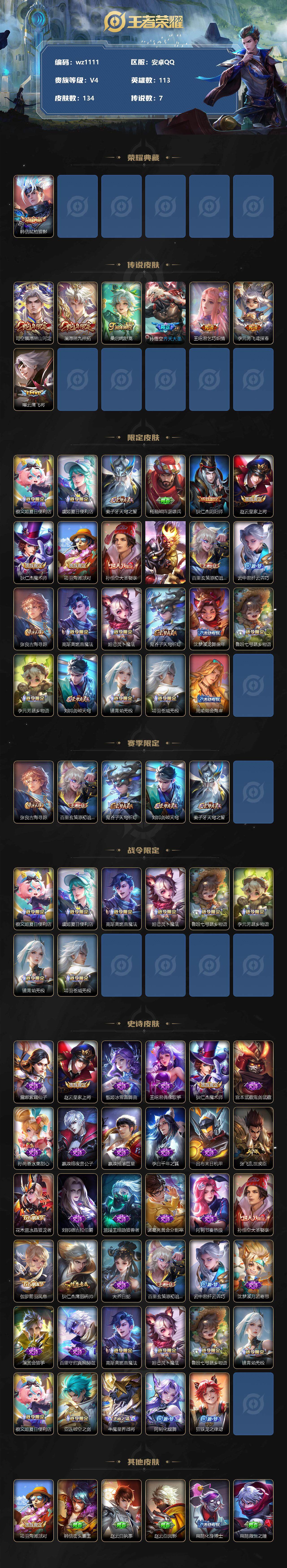【账号佳】【王者荣耀】【编号:3339712】【可二次实名】【wz1111】【商品标题】:安卓Q-V4-最强王者段位-113英雄-134皮肤-1典藏-0珍品无双-0无双-0珍品传说-7传说-34史诗 【荣耀典藏】:韩信弑枪猎影 【传说皮肤】:司空震愿照山河定,澜愿照九州拓,桑启鸣野蒿,孙悟空齐天大圣,王昭君乞巧织情,李元芳飞鸢探春,曜云鹰飞将 【限定皮肤】:蔡文姬夏日便利店,虞姬夏日便利店,姜子牙天穹之誓,杨戬破阵退雄兵,狄仁杰阴阳师,赵云皇家上将,狄仁杰魔术师,项羽海滩派对,孙悟空大圣娶亲,孙悟空齐天大圣,百里玄策原初追逐者,云中君纤云弄巧,张良古海寻踪,高渐离燃音魔法,妲己灵卜魔法,鬼谷子天穹祈灯,沈梦溪龙舞盛年,鲁班七号蔬乡物语,李元芳蔬乡物语,刘邦剑破天穹,镜青焰无极,项羽苍威无极,周瑜熔金海岸 【赛季限定】:张良古海寻踪,百里玄策原初追逐者,鬼谷子天穹祈灯,刘邦剑破天穹,姜子牙天穹之誓 【战令限定】:蔡文姬夏日便利店,虞姬夏日便利店,高渐离燃音魔法,妲己灵卜魔法,鲁班七号蔬乡物语,李元芳蔬乡物语,镜青焰无极,项羽苍威无极 【史诗皮肤】:露娜紫霞仙子,赵云皇家上将,甄姬冰雪圆舞曲,王昭君偶像歌手,狄仁杰魔术师,宫本武藏鬼剑武藏,孙尚香水果甜心,嬴政暗夜贵公子,嬴政摇滚巨星,李白千年之狐,吕布末日机甲,张飞乱世虎臣,花木兰水晶猎龙者,刘邦德古拉伯爵,兰陵王暗隐猎兽者,诸葛亮黄金分割率,阿轲节奏热浪,孙悟空大圣娶亲,伽罗箭羽风息,狄仁杰鹰眼统帅,大乔白蛇,百里玄策原初追逐者,云中君纤云弄巧,沈梦溪月团寄思,澜赏金猎手,百里守约真我赫兹,妲己灵卜魔法,高渐离燃音魔法,鲁班七号蔬乡物语,镜青焰无极,蔡文姬夏日便利店,亚连破空之剑,牛魔星界战将,阿轲化蝶舞,狂铁龙之律动 【其他皮肤】:项羽海滩派对,韩信街头霸王,赵云白执事,赵云忍炎影,扁鹊化身博士,扁鹊救世之瞳,宫本武藏未来纪元,安琪拉玩偶对对碰,孙膑天使之翼,妲己少女阿狸,典韦黄金武士,达摩拳王,甄姬花好人间,刘备万事如意,狄仁杰阴阳师,关羽龙腾万里,王昭君幻想奇妙夜,狂铁命运角斗场,孙尚香沉稳之力,诸葛亮掌控之力,大乔守护之力,张良幽兰居士,庄周奇妙博物学,哪吒次元突破,刘禅秘密基地,鲁班大师乓乓大师,刘禅唤灵魔甲,太乙真人劲辣红锅,张良古海寻踪,后羿完美运算,程咬金暖冬絮语,鬼谷子天穹祈灯,妲己灵卜魔法,嫦娥漠中幻影,沈梦溪龙舞盛年,钟无艳春野之旅,李元芳蔬乡物语,扁鹊无尽旅途,刘邦剑破天穹,盘古经纬探寻者,项羽苍威无极,杨戬破阵退雄兵,姜子牙天穹之誓,周瑜熔金海岸,虞姬夏日便利店,孙悟空神迹守卫,东皇太一噬灭天穹,干将莫邪雾都夜雨,吕布逐霄战戟,太乙真人谧流熔炉,东皇太一金福满堂,明世隐景韶洛都,戈娅玫蓝誓约,刘备浪漫序章,钟馗虚灵犬护,小乔秘证寻踪,张良灵野札记,阿古朵布丁狗之约,露娜命运加冕,白起死霸装,甄姬逆浪荇歌,鲁班七号福禄兄弟,露娜绯红之刃,曹操超能战警,孙悟空西部大镖客,钟馗地府判官,李元芳特种部队,夏侯惇战争骑士,雅典娜战争女神,马可波罗激情绿茵,杨戬埃及法老,黄忠芝加哥教父,东皇太一东海龙王,百里玄策威尼斯狂欢,梦奇美梦成真,女娲尼罗河女神,公孙离花间舞,元歌午夜歌剧院,司马懿魇语军师,李信灼热之刃,上官婉儿修竹墨客,猪八戒年年有余,盘古创世神祝,云中君荷鲁斯之眼,曜归虚梦演,马超幸存者,西施归虚梦演,镜冰刃幻境,阿古朵熊喵少女,司空震启蛰,云缨赤焰之缨,金蝉前尘 【营地ID】:1692705344