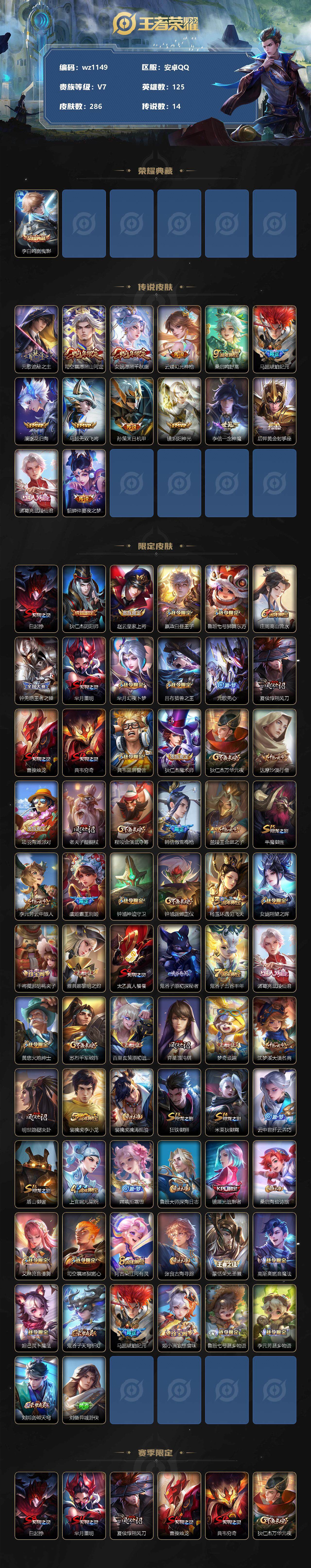 【账号佳】【王者荣耀】【编号:3339716】【可二次实名】【wz1149】【商品标题】:安卓Q-V7-至尊星耀I段位-125英雄-286皮肤-1典藏-0珍品无双-0无双-0珍品传说-14传说-78史诗 【荣耀典藏】:李白鸣剑曳影 【传说皮肤】:元歌诡秘之主,司空震愿照山河定,女娲愿照千秋盛,云缨幻光神枪,桑启鸣野蒿,马超琥珀纪元,澜逐花归海,马超无双飞将,孙策末日机甲,镜炽阳神光,李信一念神魔,后羿黄金射手座,诸葛亮武陵仙君,貂蝉仲夏夜之梦 【限定皮肤】:白起狰,狄仁杰阴阳师,赵云皇家上将,嬴政白昼王子,鲁班七号狮舞东方,庄周高山流水,钟无艳王者之锤,芈月重明,芈月幻夜卜梦,吕布猎兽之王,元歌无心,夏侯惇朔风刀,曹操烛龙,典韦穷奇,典韦蓝屏警告,狄仁杰魔术师,狄仁杰万华元夜,达摩沙漠行僧,项羽海滩派对,老夫子醍醐杖,程咬金演武夺筹,韩信傲雪梅枪,兰陵王金庭之子,牛魔御旌,李元芳云中旅人,虞姬霸王别姬,钟馗神迹守卫,钟馗驱傩正仪,杨玉环遇见飞天,女娲朔望之晖,干将莫邪胡桃夹子,雅典娜黎明之约,太乙真人饕餮,鬼谷子原初探秘者,鬼谷子五谷丰年,诸葛亮武陵仙君,黄忠火炮绅士,苏烈千军破阵,百里玄策原初追逐者,弈星混沌棋,梦奇顽趣,沈梦溪大漠名商,明世隐疑决卦,裴擒虎李小龙,裴擒虎擒涛扼浪,狂铁御狮,米莱狄御霄,云中君纤云弄巧,盾山御銮,上官婉儿梁祝,嫦娥拒霜思,鲁班大师探海日志,镜匿光追影者,桑启海盐诗旅,艾琳流音漫舞,司空震地狱燃心,阿古朵江河有灵,张良古海寻踪,蒙恬荣光圣徽,高渐离燃音魔法,妲己灵卜魔法,鬼谷子天穹祈灯,马超琥珀纪元,姬小满妄想食味,鲁班七号蔬乡物语,李元芳蔬乡物语,刘邦剑破天穹,刘备异域游侠 【赛季限定】:白起狰,芈月重明,夏侯惇朔风刀,曹操烛龙,典韦穷奇,狄仁杰万华元夜,达摩沙漠行僧,老夫子醍醐杖,程咬金演武夺筹,兰陵王金庭之子,张良古海寻踪,牛魔御旌,李元芳云中旅人,钟馗驱傩正仪,雅典娜黎明之约,太乙真人饕餮,鬼谷子原初探秘者,苏烈千军破阵,百里玄策原初追逐者,弈星混沌棋,梦奇顽趣,沈梦溪大漠名商,明世隐疑决卦,裴擒虎擒涛扼浪,狂铁御狮,米莱狄御霄,盾山御銮,鲁班大师探海日志,桑启海盐诗旅,鬼谷子天穹祈灯,蒙恬荣光圣徽,刘邦剑破天穹 【战令限定】:嬴政白昼王子,鲁班七号狮舞东方,芈月幻夜卜梦,吕布猎兽之王,典韦蓝屏警告,艾琳流音漫舞,钟馗神迹守卫,女娲朔望之晖,黄忠火炮绅士,司空震地狱燃心,高渐离燃音魔法,妲己灵卜魔法,鲁班七号蔬乡物语,李元芳蔬乡物语 【史诗皮肤】:鲁班七号电玩小子,露娜紫霞仙子,钟无艳王者之锤,赵云皇家上将,赵云未来纪元,貂蝉圣诞恋歌,甄姬冰雪圆舞曲,狄仁杰魔术师,廉颇地狱岩魂,宫本武藏鬼剑武藏,孙尚香水果甜心,嬴政摇滚巨星,妲己魅力维加斯,妲己女仆咖啡,墨子龙骑士,墨子金属风暴,吕布圣诞狂欢,刘禅绅士熊喵,曹操幽灵船长,李白千年之狐,吕布末日机甲,张飞乱世虎臣,虞姬霸王别姬,花木兰水晶猎龙者,刘邦德古拉伯爵,夏侯惇乘风破浪,小乔缤纷独角兽,兰陵王暗隐猎兽者,诸葛亮黄金分割率,雅典娜冰冠公主,安琪拉心灵骇客,百里守约特工魅影,蔡文姬舞动绿茵,刘禅天才门将,李元芳逐浪之夏,白起星夜王子,阿轲节奏热浪,杨玉环遇见飞天,嬴政白昼王子,大乔猫狗日记,典韦蓝屏警告,伽罗箭羽风息,鲁班七号狮舞东方,狄仁杰鹰眼统帅,上官婉儿梁祝,瑶遇见神鹿,百里玄策原初追逐者,裴擒虎李小龙,云中君纤云弄巧,庄周高山流水,嫦娥拒霜思,镜匿光追影者,黄忠火炮绅士,雅典娜黎明之约,韩信傲雪梅枪,夏洛特永昼,澜赏金猎手,貂蝉唤灵魅影,弈星滕王阁序,鬼谷子五谷丰年,元歌无心,梦奇顽趣,刘禅电玩爆裂旋风,司空震地狱燃心,阿古朵江河有灵,妲己灵卜魔法,高渐离燃音魔法,蒙恬荣光圣徽,姬小满妄想食味,鲁班七号蔬乡物语,姬小满战舞者,弈星炽弈燎原,牛魔星界战将,姬小满飞车小橘子,赵怀真器灵浮梦炉,后羿石田雨龙,黄忠百相守梦,西施织梦人,公孙离涂山容容 【其他皮肤】:项羽海滩派对,韩信教廷特使,韩信街头霸王,露娜哥特玫瑰,阿轲爱心护理,达摩大发明家,赵云忍炎影,芈月红桃皇后,白起白色死神,牛魔西部大镖客,武则天东方不败,扁鹊化身博士,扁鹊救世之瞳,宫本武藏未来纪元,安琪拉玩偶对对碰,孙膑天使之翼,姜子牙时尚教父,妲己少女阿狸,典韦黄金武士,亚瑟死亡骑士,达摩拳王,花木兰兔女郎,张飞五福同心,甄姬花好人间,刘备万事如意,后羿阿尔法小队,狄仁杰阴阳师,刘备纽约教父,刘备汉昭烈帝,关羽龙腾万里,白起狰,钟无艳海滩丽影,太乙真人饕餮,宫本武藏霸王丸,曹操烛龙,王昭君幻想奇妙夜,芈月重明,狂铁命运角斗场,老夫子功夫老勺,孙尚香沉稳之力,典韦穷奇,李白敏锐之力,鬼谷子幻乐之宴,狂铁御狮,安琪拉如懿,苏烈坚韧之力,大乔守护之力,项羽科学大爆炸,米莱狄御霄,吕布猎兽之王,明世隐虹云星官,牛魔御旌,女娲朔望之晖
