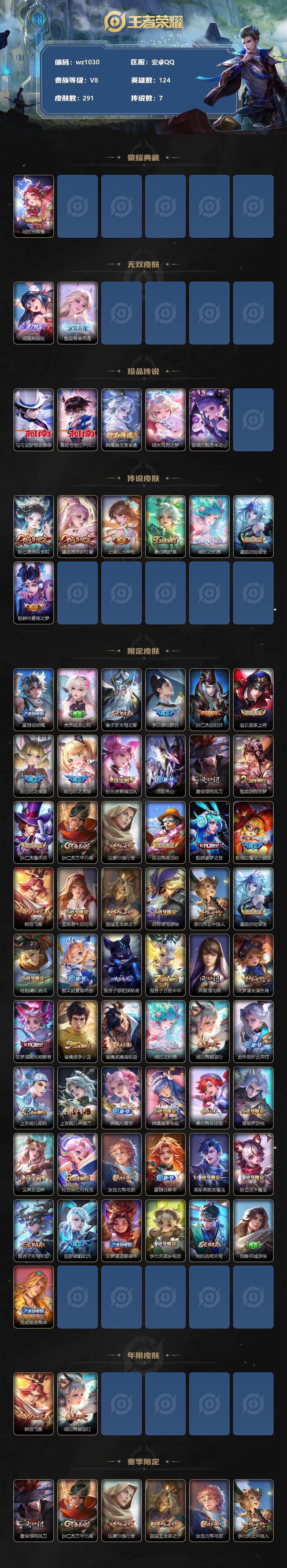 【账号佳】【王者荣耀】【编号:3339753】【可二次实名】【wz1030】【商品标题】:安卓Q-V8-永恒钻石II段位-124英雄-291皮肤-1典藏-0珍品无双-2无双-5珍品传说-7传说-80史诗 【荣耀典藏】:瑶拾光映像 【无双皮肤】:瑶真我赫兹,甄姬雪境奇遇 【珍品传说】:马可波罗怪盗基德,鲁班七号江户川柯南,嫦娥器灵落星盏,瑶大耳狗之梦,安琪拉酷洛米之心 【传说皮肤】:妲己愿照众生和,虞姬愿照岁时盈,云缨幻光神枪,桑启鸣野蒿,瑶时之祈愿,虞姬启明星使,貂蝉仲夏夜之梦 【限定皮肤】:蒙犽顽岩魄,大乔绒语心约,姜子牙天穹之誓,李白谪仙醉月,狄仁杰阴阳师,赵云皇家上将,妲己时之彼端,妲己时之奇旅,孙尚香蔷薇恋人,元歌无心,夏侯惇朔风刀,甄姬游园惊梦,狄仁杰魔术师,狄仁杰万华元夜,达摩沙漠行僧,项羽海滩派对,貂蝉逐梦之音,安琪拉魔法小厨娘,韩信飞衡,王昭君午后时光,兰陵王金庭之子,后羿圣弓游侠,李元芳云中旅人,虞姬启明星使,杨戬潮玩骑兵,蔡文姬繁星吟游,鬼谷子原初探秘者,鬼谷子五谷丰年,弈星混沌棋,沈梦溪大漠名商,沈梦溪匿光破解者,裴擒虎李小龙,裴擒虎擒涛扼浪,瑶时之祈愿,瑶山海碧波行,云中君纤云弄巧,上官婉儿梁祝,上官婉儿神器万象笔,嫦娥拒霜思,嫦娥暖冬兔眠,桑启海盐诗旅,暃星界游侠,艾琳女武神,阿古朵江河有灵,张良古海寻踪,蒙犽百解令,高渐离燃音魔法,妲己灵卜魔法,鬼谷子天穹祈灯,伽罗琥珀纪元,沈梦溪龙舞盛年,李元芳蔬乡物语,刘邦剑破天穹,刘备异域游侠,周瑜熔金海岸 【年限皮肤】:韩信飞衡,瑶山海碧波行 【赛季限定】:夏侯惇朔风刀,狄仁杰万华元夜,达摩沙漠行僧,兰陵王金庭之子,张良古海寻踪,李元芳云中旅人,鬼谷子原初探秘者,弈星混沌棋,沈梦溪大漠名商,裴擒虎擒涛扼浪,桑启海盐诗旅,鬼谷子天穹祈灯,刘邦剑破天穹,姜子牙天穹之誓 【战令限定】:王昭君午后时光,后羿圣弓游侠,杨戬潮玩骑兵,嫦娥暖冬兔眠,暃星界游侠,高渐离燃音魔法,妲己灵卜魔法,李元芳蔬乡物语 【史诗皮肤】:露娜紫霞仙子,阿轲暗夜猫娘,赵云皇家上将,赵云未来纪元,貂蝉圣诞恋歌,甄姬冰雪圆舞曲,王昭君偶像歌手,狄仁杰魔术师,宫本武藏鬼剑武藏,孙尚香蔷薇恋人,孙尚香水果甜心,嬴政摇滚巨星,妲己魅力维加斯,妲己女仆咖啡,吕布圣诞狂欢,刘禅绅士熊喵,曹操幽灵船长,李白千年之狐,安琪拉魔法小厨娘,貂蝉逐梦之音,花木兰水晶猎龙者,刘邦德古拉伯爵,夏侯惇乘风破浪,小乔缤纷独角兽,兰陵王暗隐猎兽者,诸葛亮黄金分割率,甄姬游园惊梦,亚瑟心灵战警,雅典娜冰冠公主,安琪拉心灵骇客,百里守约特工魅影,铠曙光守护者,蔡文姬舞动绿茵,刘禅天才门将,李元芳逐浪之夏,白起星夜王子,阿轲节奏热浪,孙策猫狗日记,狄仁杰鹰眼统帅,公孙离无限星赏官,上官婉儿梁祝,蔡文姬繁星吟游,娜可露露晚萤,韩信飞衡,妲己时之彼端,大乔白蛇,小乔青蛇,瑶遇见神鹿,孙尚香时之恋人,裴擒虎李小龙,云中君纤云弄巧,杨戬天秀启明,嫦娥拒霜思,哪吒雪上飞焰,貂蝉唤灵魅影,妲己时之奇旅,鬼谷子五谷丰年,上官婉儿神器万象笔,元歌无心,暃星界游侠,瑶山海碧波行,沈梦溪匿光破解者,阿古朵江河有灵,蒙犽百解令,妲己灵卜魔法,高渐离燃音魔法,伽罗琥珀纪元,蒙犽顽岩魄,亚连破空之剑,李白谪仙醉月,艾琳陌上桑,孙膑茶境仙,弈星万物之道,赵怀真器灵浮梦炉,阿轲化蝶舞,刘禅鸭鸭历险记,狂铁龙之律动,云缨赞萌露比,黄忠百相守梦,朵莉亚幻珠鲛人,西施织梦人 【其他皮肤】:项羽海滩派对,韩信教廷特使,韩信街头霸王,露娜哥特玫瑰,阿轲爱心护理,赵云忍炎影,芈月红桃皇后,艾琳女武神,白起白色死神,武则天东方不败,扁鹊救世之瞳,安琪拉玩偶对对碰,孙膑天使之翼,姜子牙时尚教父,妲己少女阿狸,典韦黄金武士,亚瑟死亡骑士,达摩拳王,花木兰兔女郎,张飞五福同心,甄姬花好人间,后羿阿尔法小队,狄仁杰阴阳师,刘备汉昭烈帝,关羽龙腾万里,钟无艳海滩丽影,王昭君幻想奇妙夜,狂铁命运角斗场,老夫子功夫老勺,孙尚香沉稳之力,诸葛亮掌控之力,李白敏锐之力,鬼谷子幻乐之宴,苏烈坚韧之力,大乔守护之力,项羽科学大爆炸,明世隐虹云星官,庄周奇妙博物学,小乔丁香结,吕布野性能量,孙膑归虚梦演,沈梦溪鲨炮海盗猫,夏侯惇朔风刀,弈星混沌棋,哪吒次元突破,鲁班七号黑桃队长,鬼谷子原初探秘者,狄仁杰万华元夜,刘禅秘密基地,杨戬次元傲视,露娜瓷语鉴心,张良缤纷绘卷,盘古重装意志,鲁班大师乓乓大师,后羿圣弓游侠,典韦铁甲之心,马可波罗潮玩牛仔,达摩沙漠行僧,程咬金无双福将,刘邦虎啸剑宗,兰陵王金庭之子,米莱狄契约魔法,王昭君午后时光,沈梦溪大漠名商,蒙犽胡桃狂想曲,李元芳云中旅人,刘备潮玩造梦师,桑启海盐诗旅,嫦娥暖冬兔眠,海月幻泉雾影,猪八戒潮玩探月行,赵怀真太极少年,裴擒虎擒涛扼浪,杨戬潮玩骑兵,太乙真人劲辣红锅,莱西奥西部游侠,张良古海寻踪,钟无