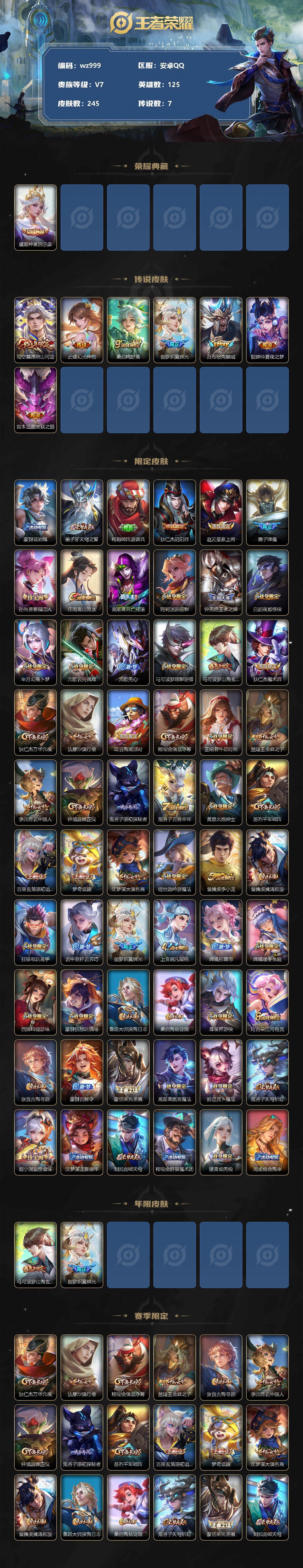 【账号佳】【王者荣耀】【编号:3339755】【可二次实名】【wz999】【商品标题】:安卓Q-V7-最强王者段位-125英雄-245皮肤-1典藏-0珍品无双-0无双-0珍品传说-7传说-82史诗 【荣耀典藏】:虞姬神鉴启示录 【传说皮肤】:司空震愿照山河定,云缨幻光神枪,桑启鸣野蒿,伽罗炽翼辉光,吕布怒海麟威,貂蝉仲夏夜之梦,宫本武藏地狱之眼 【限定皮肤】:蒙犽顽岩魄,姜子牙天穹之誓,杨戬破阵退雄兵,狄仁杰阴阳师,赵云皇家上将,墨子降魔,孙尚香蔷薇恋人,庄周高山流水,高渐离死亡摇滚,阿轲迷踪丽影,钟无艳王者之锤,白起夜都怪侠,芈月幻夜卜梦,元歌云间偶戏,元歌无心,马可波罗暗影游猎,马可波罗山海玄木吟,狄仁杰魔术师,狄仁杰万华元夜,达摩沙漠行僧,项羽海滩派对,程咬金演武夺筹,王昭君午后时光,兰陵王金庭之子,李元芳云中旅人,钟馗驱傩正仪,鬼谷子原初探秘者,鬼谷子五谷丰年,黄忠火炮绅士,苏烈千军破阵,百里玄策原初追逐者,梦奇顽趣,沈梦溪大漠名商,明世隐吟游魔法,裴擒虎李小龙,裴擒虎擒涛扼浪,狂铁电玩高手,云中君纤云弄巧,伽罗炽翼辉光,上官婉儿梁祝,嫦娥拒霜思,嫦娥暖冬兔眠,西施玲珑珍味,蒙犽狂想玩偶喵,鲁班大师探海日志,桑启海盐诗旅,暃星界游侠,阿古朵江河有灵,张良古海寻踪,蒙犽百解令,蒙恬荣光圣徽,高渐离燃音魔法,妲己灵卜魔法,鬼谷子天穹祈灯,姬小满妄想食味,沈梦溪龙舞盛年,刘邦剑破天穹,程咬金群星魔术团,镜青焰无极,周瑜熔金海岸 【年限皮肤】:马可波罗山海玄木吟,伽罗炽翼辉光 【赛季限定】:狄仁杰万华元夜,达摩沙漠行僧,程咬金演武夺筹,兰陵王金庭之子,张良古海寻踪,李元芳云中旅人,钟馗驱傩正仪,鬼谷子原初探秘者,苏烈千军破阵,百里玄策原初追逐者,梦奇顽趣,沈梦溪大漠名商,裴擒虎擒涛扼浪,鲁班大师探海日志,桑启海盐诗旅,鬼谷子天穹祈灯,蒙恬荣光圣徽,刘邦剑破天穹,姜子牙天穹之誓 【战令限定】:阿轲迷踪丽影,白起夜都怪侠,芈月幻夜卜梦,元歌云间偶戏,马可波罗暗影游猎,王昭君午后时光,黄忠火炮绅士,明世隐吟游魔法,狂铁电玩高手,嫦娥暖冬兔眠,西施玲珑珍味,蒙犽狂想玩偶喵,暃星界游侠,高渐离燃音魔法,妲己灵卜魔法,镜青焰无极 【史诗皮肤】:项羽苍穹之光,露娜紫霞仙子,钟无艳王者之锤,赵云皇家上将,赵云未来纪元,貂蝉圣诞恋歌,甄姬冰雪圆舞曲,王昭君偶像歌手,狄仁杰魔术师,廉颇地狱岩魂,宫本武藏鬼剑武藏,孙尚香蔷薇恋人,孙尚香水果甜心,嬴政暗夜贵公子,嬴政摇滚巨星,妲己魅力维加斯,妲己女仆咖啡,墨子金属风暴,曹操幽灵船长,李白千年之狐,吕布末日机甲,张飞乱世虎臣,韩信白龙吟,花木兰水晶猎龙者,刘邦德古拉伯爵,夏侯惇乘风破浪,小乔缤纷独角兽,兰陵王暗隐猎兽者,亚瑟心灵战警,安琪拉心灵骇客,百里守约特工魅影,蔡文姬舞动绿茵,李元芳逐浪之夏,程咬金功夫厨神,白起星夜王子,孙策猫狗日记,伽罗箭羽风息,狄仁杰鹰眼统帅,上官婉儿梁祝,阿轲迷踪丽影,马可波罗暗影游猎,蒙犽狂想玩偶喵,百里玄策原初追逐者,裴擒虎李小龙,云中君纤云弄巧,元歌云间偶戏,沈梦溪月团寄思,庄周高山流水,司马懿暗渊魔法,嫦娥拒霜思,黄忠火炮绅士,夏洛特永昼,明世隐吟游魔法,高渐离天秀音浪,狂铁电玩高手,鬼谷子五谷丰年,元歌无心,墨子降魔,梦奇顽趣,暃星界游侠,马可波罗山海玄木吟,刘禅电玩爆裂旋风,阿古朵江河有灵,蒙犽百解令,周瑜雪夜绮愿,妲己灵卜魔法,高渐离燃音魔法,蒙恬荣光圣徽,姬小满妄想食味,镜青焰无极,蒙犽顽岩魄,亚连破空之剑,艾琳陌上桑,百里守约百相守梦,牛魔星界战将,孙膑茶境仙,弈星万物之道,赵怀真器灵浮梦炉,刘禅鸭鸭历险记,扁鹊灵蛊蚀心,后羿石田雨龙,周瑜百相守梦,公孙离涂山容容 【其他皮肤】:项羽海滩派对,韩信教廷特使,韩信街头霸王,露娜哥特玫瑰,达摩大发明家,赵云白执事,赵云忍炎影,芈月红桃皇后,程咬金星际陆战队,白起白色死神,牛魔西部大镖客,武则天东方不败,扁鹊化身博士,扁鹊救世之瞳,安琪拉玩偶对对碰,孙膑天使之翼,姜子牙时尚教父,妲己少女阿狸,典韦黄金武士,亚瑟死亡骑士,达摩拳王,花木兰兔女郎,张飞五福同心,甄姬花好人间,刘备万事如意,宫本武藏万象初新,后羿阿尔法小队,狄仁杰阴阳师,刘备纽约教父,高渐离死亡摇滚,关羽龙腾万里,墨子进击墨子号,钟无艳海滩丽影,王昭君幻想奇妙夜,老夫子功夫老勺,孙尚香沉稳之力,诸葛亮掌控之力,李白敏锐之力,鬼谷子幻乐之宴,苏烈坚韧之力,大乔守护之力,明世隐虹云星官,小乔丁香结,吕布野性能量,沈梦溪鲨炮海盗猫,姜子牙炽热元素使,哪吒次元突破,狂铁特工战影,鬼谷子原初探秘者,狄仁杰万华元夜,刘禅秘密基地,程咬金演武夺筹,张良缤纷绘卷,钟馗驱傩正仪,鲁班大师乓乓大师,苏烈千军破阵,达摩沙漠行僧,芈月幻夜卜梦,程咬金无双福将,刘邦虎啸剑宗,白起夜都怪侠,兰陵王金庭之子,刘禅唤灵魔甲,米莱狄契约魔