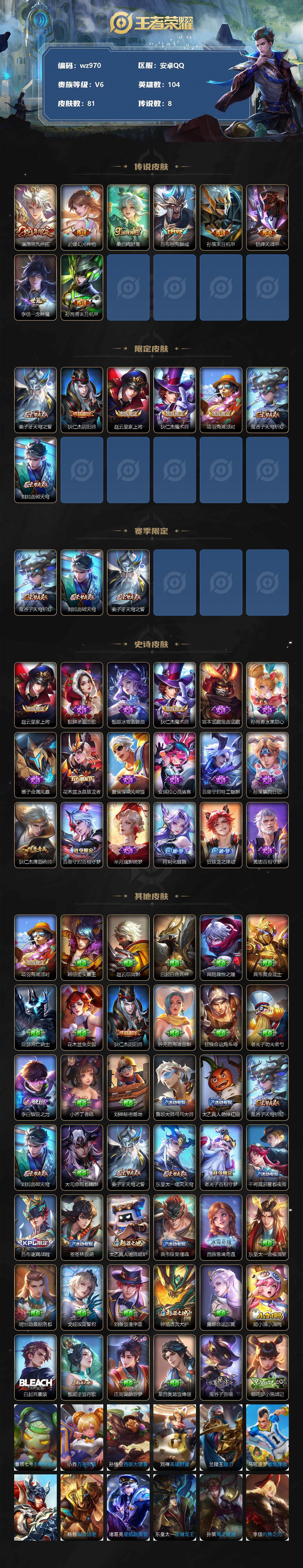 【账号佳】【王者荣耀】【编号:3339765】【可二次实名】【wz970】【商品标题】:安卓Q-V6-永恒钻石II段位-104英雄-81皮肤-0典藏-0珍品无双-0无双-0珍品传说-8传说-18史诗 【传说皮肤】:澜愿照九州拓,云缨幻光神枪,桑启鸣野蒿,吕布怒海麟威,孙策末日机甲,铠绛天战甲,李信一念神魔,孙尚香末日机甲 【限定皮肤】:姜子牙天穹之誓,狄仁杰阴阳师,赵云皇家上将,狄仁杰魔术师,项羽海滩派对,鬼谷子天穹祈灯,刘邦剑破天穹 【赛季限定】:鬼谷子天穹祈灯,刘邦剑破天穹,姜子牙天穹之誓 【史诗皮肤】:赵云皇家上将,貂蝉圣诞恋歌,甄姬冰雪圆舞曲,狄仁杰魔术师,宫本武藏鬼剑武藏,孙尚香水果甜心,墨子金属风暴,花木兰水晶猎龙者,夏侯惇乘风破浪,安琪拉心灵骇客,百里守约特工魅影,孙策猫狗日记,狄仁杰鹰眼统帅,百里守约百相守梦,芈月瑰影绮梦,阿轲化蝶舞,狂铁龙之律动,黄忠百相守梦 【其他皮肤】:项羽海滩派对,韩信街头霸王,赵云忍炎影,白起白色死神,扁鹊救世之瞳,典韦黄金武士,亚瑟死亡骑士,花木兰兔女郎,狄仁杰阴阳师,钟无艳海滩丽影,狂铁命运角斗场,老夫子功夫老勺,李白敏锐之力,小乔丁香结,刘禅秘密基地,鲁班大师乓乓大师,太乙真人劲辣红锅,鬼谷子天穹祈灯,刘邦剑破天穹,大司命暗都幽影,姜子牙天穹之誓,东皇太一噬灭天穹,老夫子百相守梦,干将莫邪雾都夜雨,吕布逐霄战戟,苍苍林狼骑,太乙真人谧流熔炉,典韦铁骨偃魂,西施雪境奇遇,东皇太一金福满堂,明世隐景韶洛都,戈娅玫蓝誓约,刘备浪漫序章,钟馗虚灵犬护,露娜命运加冕,姬小满小满鸭,白起死霸装,甄姬逆浪荇歌,庄周锦麟游梦,莱西奥踏浪烽翎,鬼谷子克喵,哪吒罗小黑战记,鲁班七号木偶奇遇记,小乔万圣前夜,孙悟空西部大镖客,刘禅英喵野望,兰陵王隐刃,马可波罗激情绿茵,苍维京掠夺者,杨戬埃及法老,诸葛亮星航指挥官,东皇太一东海龙王,孙策海之征途,李信灼热之刃,澜孤猎 【营地ID】:1623342325