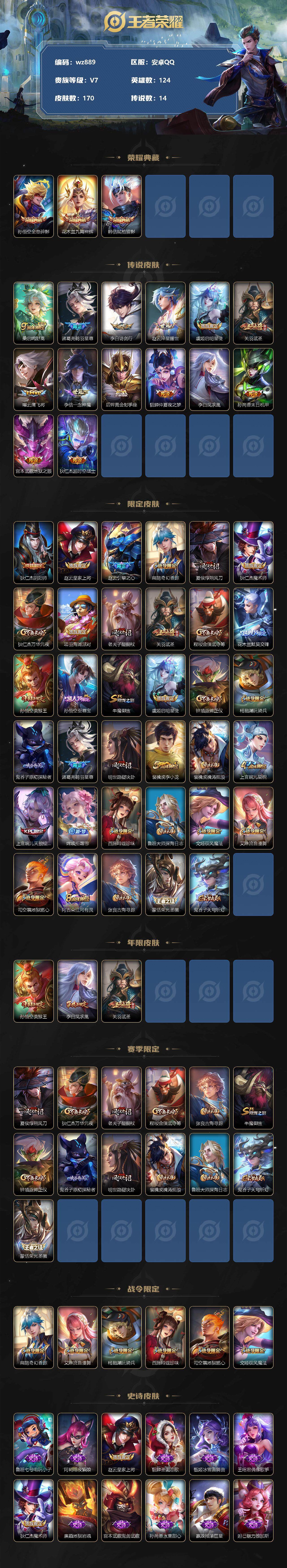 【账号佳】【王者荣耀】【编号:3339805】【可二次实名】【wz889】【商品标题】:安卓Q-V7-最强王者段位-124英雄-170皮肤-3典藏-0珍品无双-0无双-0珍品传说-14传说-49史诗 【荣耀典藏】:孙悟空全息碎影,花木兰九霄神辉,韩信弑枪猎影 【传说皮肤】:桑启鸣野蒿,诸葛亮鹤羽星尊,李白诗剑行,赵云淬星耀世,虞姬启明星使,关羽武圣,曜云鹰飞将,李信一念神魔,后羿黄金射手座,貂蝉仲夏夜之梦,李白凤求凰,孙尚香末日机甲,宫本武藏地狱之眼,狄仁杰超时空战士 【限定皮肤】:狄仁杰阴阳师,赵云皇家上将,赵云引擎之心,扁鹊奇幻香踪,夏侯惇朔风刀,狄仁杰魔术师,狄仁杰万华元夜,项羽海滩派对,老夫子醍醐杖,关羽武圣,程咬金演武夺筹,花木兰默契交锋,孙悟空美猴王,孙悟空至尊宝,牛魔御旌,虞姬启明星使,钟馗驱傩正仪,杨戬潮玩骑兵,鬼谷子原初探秘者,诸葛亮鹤羽星尊,明世隐疑决卦,裴擒虎李小龙,裴擒虎擒涛扼浪,上官婉儿梁祝,上官婉儿天狼绘梦者,嫦娥拒霜思,西施玲珑珍味,鲁班大师探海日志,戈娅驭风魔法,艾琳流音漫舞,司空震地狱燃心,阿古朵江河有灵,张良古海寻踪,蒙恬荣光圣徽,鬼谷子天穹祈灯 【年限皮肤】:孙悟空美猴王,李白凤求凰,关羽武圣 【赛季限定】:夏侯惇朔风刀,狄仁杰万华元夜,老夫子醍醐杖,程咬金演武夺筹,张良古海寻踪,牛魔御旌,钟馗驱傩正仪,鬼谷子原初探秘者,明世隐疑决卦,裴擒虎擒涛扼浪,鲁班大师探海日志,鬼谷子天穹祈灯,蒙恬荣光圣徽 【战令限定】:扁鹊奇幻香踪,艾琳流音漫舞,杨戬潮玩骑兵,西施玲珑珍味,司空震地狱燃心,戈娅驭风魔法 【史诗皮肤】:鲁班七号电玩小子,阿轲暗夜猫娘,赵云皇家上将,貂蝉圣诞恋歌,甄姬冰雪圆舞曲,王昭君偶像歌手,狄仁杰魔术师,廉颇地狱岩魂,宫本武藏鬼剑武藏,孙尚香水果甜心,嬴政摇滚巨星,妲己魅力维加斯,妲己女仆咖啡,墨子龙骑士,墨子金属风暴,吕布圣诞狂欢,刘禅绅士熊喵,曹操幽灵船长,李白千年之狐,吕布末日机甲,孙悟空至尊宝,赵云引擎之心,花木兰水晶猎龙者,刘邦德古拉伯爵,夏侯惇乘风破浪,兰陵王暗隐猎兽者,亚瑟心灵战警,雅典娜冰冠公主,铠曙光守护者,李元芳逐浪之夏,程咬金功夫厨神,狄仁杰鹰眼统帅,上官婉儿梁祝,娜可露露晚萤,小乔青蛇,上官婉儿天狼绘梦者,裴擒虎李小龙,花木兰默契交锋,嫦娥拒霜思,艾琳奇遇舞章,扁鹊奇幻香踪,刘禅电玩爆裂旋风,戈娅驭风魔法,司空震地狱燃心,阿古朵江河有灵,蒙恬荣光圣徽,亚连破空之剑,刘禅鸭鸭历险记,狂铁龙之律动 【其他皮肤】:项羽海滩派对,韩信教廷特使,韩信街头霸王,阿轲爱心护理,赵云白执事,赵云忍炎影,白起白色死神,安琪拉玩偶对对碰,孙膑天使之翼,妲己少女阿狸,典韦黄金武士,亚瑟死亡骑士,达摩拳王,孙悟空美猴王,花木兰兔女郎,张飞五福同心,甄姬花好人间,宫本武藏万象初新,后羿阿尔法小队,狄仁杰阴阳师,关羽龙腾万里,钟无艳海滩丽影,王昭君幻想奇妙夜,老夫子功夫老勺,鬼谷子幻乐之宴,大乔守护之力,明世隐虹云星官,牛魔御旌,小乔丁香结,夏侯惇朔风刀,哪吒次元突破,明世隐疑决卦,盾山圆桌骑士,老夫子醍醐杖,鬼谷子原初探秘者,狄仁杰万华元夜,程咬金演武夺筹,钟馗驱傩正仪,马可波罗潮玩牛仔,猪八戒潮玩探月行,裴擒虎擒涛扼浪,杨戬潮玩骑兵,鲁班大师探海日志,西施玲珑珍味,艾琳流音漫舞,张良古海寻踪,钟无艳聚星闪耀,亚连破局者,后羿完美运算,鬼谷子天穹祈灯,大司命暗都幽影,孙悟空神迹守卫,东皇太一噬灭天穹,干将莫邪雾都夜雨,苍苍林狼骑,太乙真人谧流熔炉,典韦铁骨偃魂,西施雪境奇遇,姜子牙星梦巡礼,明世隐景韶洛都,戈娅玫蓝誓约,钟馗虚灵犬护,沈梦溪鸭鸭历险记,露娜命运加冕,姬小满小满鸭,白起死霸装,甄姬逆浪荇歌,空空儿戏梦巡演,高渐离落日弦歌,莱西奥踏浪烽翎,鬼谷子克喵,花木兰剑舞者,王昭君精灵公主,狄仁杰锦衣卫,小乔万圣前夜,孙膑未来旅行,孙悟空西部大镖客,刘禅英喵野望,钟馗地府判官,虞姬加勒比小姐,蔡文姬蔷薇王座,马可波罗激情绿茵,哪吒三太子,黄忠芝加哥教父,大乔伊势巫女,东皇太一东海龙王,干将莫邪第七人偶,杨玉环霓裳曲,元歌午夜歌剧院,孙策海之征途,伽罗花见巫女,沈梦溪棒球奇才,上官婉儿修竹墨客,嫦娥露花倒影,瑶森,马超幸存者,蒙犽归虚梦演,蒙恬秩序猎龙将,澜孤猎,司空震启蛰,云缨赤焰之缨,金蝉前尘,暃碧珀绯影,桑启画中游 【营地ID】:98088155
