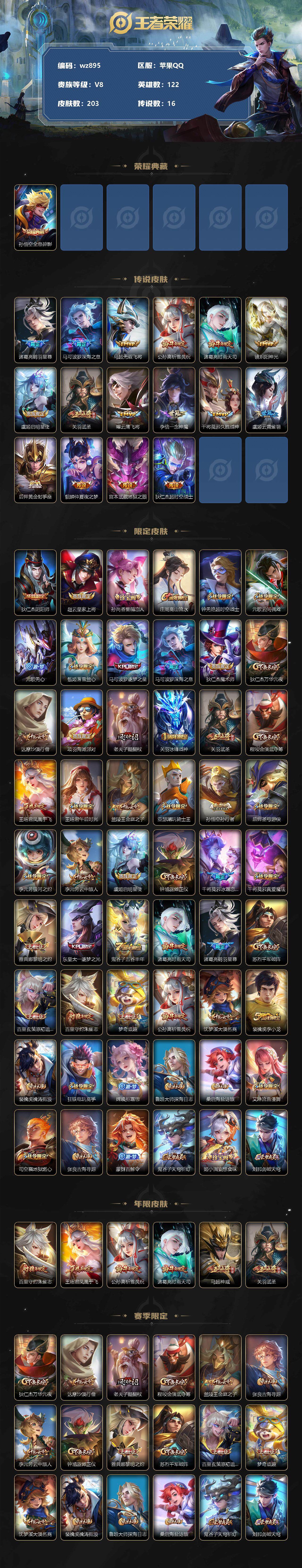 【账号佳】【王者荣耀】【编号:3339809】【可二次实名】【wz895】【商品标题】:苹果Q-V8-最强王者段位-122英雄-203皮肤-1典藏-0珍品无双-0无双-0珍品传说-16传说-70史诗 【荣耀典藏】:孙悟空全息碎影 【传说皮肤】:诸葛亮鹤羽星尊,马可波罗深海之息,马超无双飞将,公孙离祈雪灵祝,诸葛亮时雨天司,镜炽阳神光,虞姬启明星使,关羽武圣,曜云鹰飞将,李信一念神魔,干将莫邪久胜战神,虞姬云霓雀翎,后羿黄金射手座,貂蝉仲夏夜之梦,宫本武藏地狱之眼,狄仁杰超时空战士 【限定皮肤】:狄仁杰阴阳师,赵云皇家上将,孙尚香蔷薇恋人,庄周高山流水,钟无艳超时空战士,元歌云间偶戏,元歌无心,甄姬落雪兰心,马可波罗逐梦之星,马可波罗深海之息,狄仁杰魔术师,狄仁杰万华元夜,达摩沙漠行僧,项羽海滩派对,老夫子醍醐杖,关羽冰锋战神,关羽武圣,程咬金演武夺筹,王昭君凤凰于飞,王昭君午后时光,兰陵王金庭之子,亚瑟潮玩骑士王,孙悟空孙行者,后羿圣弓游侠,李元芳银河之约,李元芳云中旅人,虞姬启明星使,钟馗驱傩正仪,干将莫邪冰霜恋舞曲,干将莫邪真爱魔法,雅典娜黎明之约,东皇太一逐梦之光,鬼谷子五谷丰年,诸葛亮时雨天司,诸葛亮鹤羽星尊,苏烈千军破阵,百里玄策原初追逐者,百里守约朱雀志,梦奇顽趣,公孙离祈雪灵祝,沈梦溪大漠名商,裴擒虎李小龙,裴擒虎擒涛扼浪,狂铁电玩高手,嫦娥拒霜思,鲁班大师探海日志,桑启海盐诗旅,艾琳流音漫舞,司空震地狱燃心,张良古海寻踪,蒙犽百解令,鬼谷子天穹祈灯,姬小满妄想食味,刘邦剑破天穹 【年限皮肤】:百里守约朱雀志,王昭君凤凰于飞,公孙离祈雪灵祝,诸葛亮时雨天司,马超神威,关羽武圣 【赛季限定】:狄仁杰万华元夜,达摩沙漠行僧,老夫子醍醐杖,程咬金演武夺筹,兰陵王金庭之子,张良古海寻踪,李元芳云中旅人,钟馗驱傩正仪,雅典娜黎明之约,苏烈千军破阵,百里玄策原初追逐者,梦奇顽趣,沈梦溪大漠名商,裴擒虎擒涛扼浪,鲁班大师探海日志,桑启海盐诗旅,鬼谷子天穹祈灯,刘邦剑破天穹 【战令限定】:钟无艳超时空战士,元歌云间偶戏,甄姬落雪兰心,王昭君午后时光,艾琳流音漫舞,亚瑟潮玩骑士王,后羿圣弓游侠,李元芳银河之约,干将莫邪真爱魔法,狂铁电玩高手,司空震地狱燃心 【史诗皮肤】:鲁班七号电玩小子,项羽苍穹之光,露娜紫霞仙子,赵云皇家上将,赵云未来纪元,甄姬冰雪圆舞曲,狄仁杰魔术师,廉颇地狱岩魂,宫本武藏鬼剑武藏,孙尚香蔷薇恋人,孙尚香水果甜心,妲己魅力维加斯,妲己女仆咖啡,墨子金属风暴,吕布圣诞狂欢,刘禅绅士熊喵,曹操幽灵船长,李白千年之狐,张飞乱世虎臣,韩信白龙吟,关羽冰锋战神,王昭君凤凰于飞,花木兰水晶猎龙者,夏侯惇乘风破浪,小乔缤纷独角兽,兰陵王暗隐猎兽者,马可波罗逐梦之星,雅典娜冰冠公主,安琪拉心灵骇客,百里守约特工魅影,蔡文姬舞动绿茵,刘禅天才门将,程咬金功夫厨神,白起星夜王子,阿轲节奏热浪,东皇太一逐梦之光,孙策猫狗日记,大乔猫狗日记,百里守约朱雀志,干将莫邪冰霜恋舞曲,狄仁杰鹰眼统帅,李元芳银河之约,娜可露露晚萤,不知火舞魅语,橘右京修罗,马超神威,百里玄策原初追逐者,裴擒虎李小龙,元歌云间偶戏,西施诗语江南,干将莫邪真爱魔法,沈梦溪月团寄思,孙悟空孙行者,庄周高山流水,嫦娥拒霜思,雅典娜黎明之约,夏洛特永昼,澜赏金猎手,狂铁电玩高手,钟无艳超时空战士,鬼谷子五谷丰年,元歌无心,梦奇顽趣,司空震地狱燃心,蒙犽百解令,姬小满妄想食味,狂铁龙之律动,后羿石田雨龙,黄忠百相守梦,朵莉亚幻珠鲛人 【其他皮肤】:项羽海滩派对,韩信教廷特使,韩信街头霸王,露娜哥特玫瑰,阿轲爱心护理,赵云忍炎影,牛魔西部大镖客,扁鹊化身博士,扁鹊救世之瞳,宫本武藏未来纪元,安琪拉玩偶对对碰,姜子牙时尚教父,妲己少女阿狸,典韦黄金武士,亚瑟死亡骑士,达摩拳王,花木兰兔女郎,张飞五福同心,甄姬花好人间,刘备万事如意,狄仁杰阴阳师,刘备纽约教父,关羽龙腾万里,钟无艳海滩丽影,宫本武藏霸王丸,王昭君幻想奇妙夜,狂铁命运角斗场,老夫子功夫老勺,孙尚香沉稳之力,鬼谷子幻乐之宴,庄周奇妙博物学,小乔丁香结,吕布野性能量,孙膑归虚梦演,姜子牙炽热元素使,哪吒次元突破,盾山圆桌骑士,老夫子醍醐杖,狄仁杰万华元夜,亚瑟潮玩骑士王,露娜瓷语鉴心,程咬金演武夺筹,张良缤纷绘卷,钟馗驱傩正仪,鲁班大师乓乓大师,苏烈千军破阵,后羿圣弓游侠,妲己紫罗兰之誓,达摩沙漠行僧,程咬金无双福将,兰陵王金庭之子,刘禅唤灵魔甲,王昭君午后时光,沈梦溪大漠名商,甄姬落雪兰心,李元芳云中旅人,刘备潮玩造梦师,桑启海盐诗旅,猪八戒潮玩探月行,裴擒虎擒涛扼浪,鲁班大师探海日志,李元芳妄想特派,艾琳流音漫舞,张良古海寻踪,钟无艳聚星闪耀,亚连破局者,曹操决胜大满贯,后羿完美运算,鬼谷子天穹祈灯,朵莉亚金色潮汐,廉颇功夫炙烤,刘邦剑破天穹,东皇太一噬灭天穹,吕布