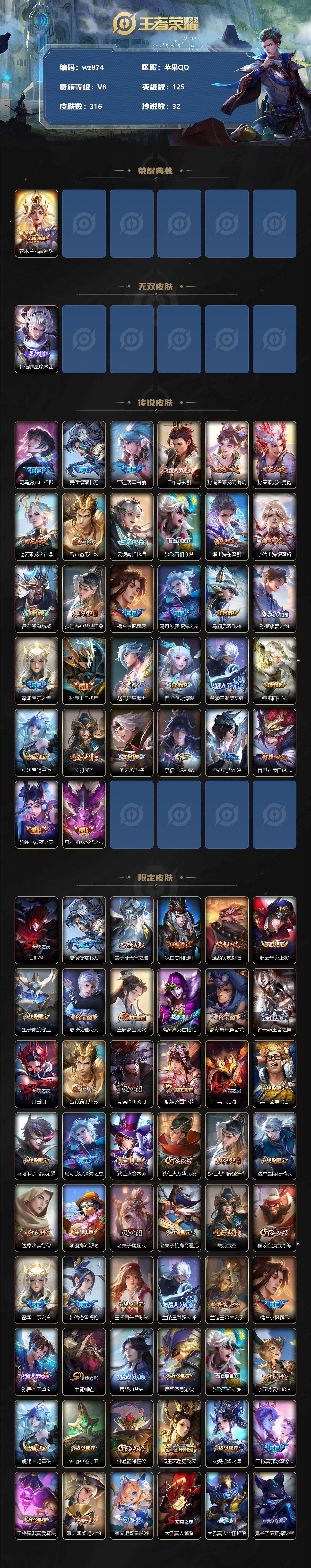 【账号佳】【王者荣耀】【编号:3339811】【可二次实名】【wz874】【商品标题】:苹果Q-V8-永恒钻石I段位-125英雄-316皮肤-1典藏-0珍品无双-1无双-0珍品传说-32传说-82史诗 【荣耀典藏】:花木兰九霄神辉 【无双皮肤】:韩信群星魔术团 【传说皮肤】:司马懿九山相柳,夏侯惇霜北刀,亚连落雪白狼,吕布曦玄引,孙尚香乘龙问璇玑,孙策乘龙淬吴钩,赵云乘龙铭钟鼎,吕布遇见神鼓,云缨鹤归松栖,张飞百相守梦,曜山海苍雷引,李信山海炽霜斩,吕布怒海麟威,狄仁杰神器狴犴令,橘右京枫霜尽,马可波罗深海之息,马超无双飞将,孙策挚爱之约,露娜启示之音,孙策末日机甲,赵云淬星耀世,西施游龙清影,兰陵王默契交锋,镜炽阳神光,虞姬启明星使,关羽武圣,曜云鹰飞将,李信一念神魔,虞姬云霓雀翎,百里玄策白虎志,貂蝉仲夏夜之梦,宫本武藏地狱之眼 【限定皮肤】:白起狰,夏侯惇霜北刀,姜子牙天穹之誓,狄仁杰阴阳师,廉颇寅虎御盾,赵云皇家上将,墨子神迹守卫,嬴政优雅恋人,庄周高山流水,高渐离死亡摇滚,高渐离玩趣恶龙,钟无艳王者之锤,芈月重明,吕布遇见神鼓,夏侯惇朔风刀,甄姬游园惊梦,典韦穷奇,典韦蓝屏警告,马可波罗暗影游猎,马可波罗深海之息,狄仁杰魔术师,狄仁杰万华元夜,狄仁杰神器狴犴令,达摩星际陆战队,达摩沙漠行僧,项羽海滩派对,老夫子醍醐杖,老夫子航海奇遇记,关羽武圣,程咬金演武夺筹,露娜启示之音,韩信傲雪梅枪,王昭君午后时光,兰陵王默契交锋,兰陵王金庭之子,橘右京枫霜尽,孙悟空至尊宝,牛魔御旌,后羿如梦令,后羿圣弓游侠,张飞百相守梦,李元芳云中旅人,虞姬启明星使,钟馗神迹守卫,钟馗驱傩正仪,杨玉环遇见飞天,女娲朔望之晖,干将莫邪冰霜恋舞曲,干将莫邪真爱魔法,雅典娜黎明之约,蔡文姬繁星吟游,太乙真人饕餮,太乙真人华丽摇滚,鬼谷子原初探秘者,鬼谷子五谷丰年,大乔白鹤梁神女,苏烈千军破阵,百里玄策白虎志,百里玄策原初追逐者,百里守约朱雀志,弈星混沌棋,梦奇顽趣,公孙离玉兔公主,沈梦溪大漠名商,明世隐疑决卦,裴擒虎李小龙,裴擒虎擒涛扼浪,狂铁御狮,狂铁电玩高手,米莱狄御霄,米莱狄胡桃异想国,云中君纤云弄巧,李信山海炽霜斩,盾山御銮,孙策挚爱之约,猪八戒西部大镖客,猪八戒猪悟能,上官婉儿梁祝,嫦娥拒霜思,曜山海苍雷引,鲁班大师探海日志,桑启海盐诗旅,戈娅驭风魔法,艾琳流音漫舞,赵怀真鹤归松栖,云缨鹤归松栖,司空震地狱燃心,阿古朵江河有灵,张良古海寻踪,蒙犽百解令,蒙恬荣光圣徽,鬼谷子天穹祈灯,伽罗琥珀纪元,姬小满妄想食味,大乔乘龙忆丹青,安琪拉乘龙聚宝船,孙尚香乘龙问璇玑,孙策乘龙淬吴钩,赵云乘龙铭钟鼎,吕布曦玄引,亚连落雪白狼,沈梦溪龙舞盛年,鲁班七号蔬乡物语,李元芳蔬乡物语,刘邦剑破天穹,程咬金群星魔术团,韩信群星魔术团,镜青焰无极,项羽苍威无极,刘备异域游侠,芈月浮光幕影,周瑜熔金海岸 【年限皮肤】:百里玄策白虎志,百里守约朱雀志,廉颇寅虎御盾,马超神威,关羽武圣,李信山海炽霜斩,曜山海苍雷引,大乔乘龙忆丹青,安琪拉乘龙聚宝船,孙尚香乘龙问璇玑,孙策乘龙淬吴钩,赵云乘龙铭钟鼎 【赛季限定】:白起狰,芈月重明,夏侯惇朔风刀,典韦穷奇,狄仁杰万华元夜,达摩沙漠行僧,老夫子醍醐杖,程咬金演武夺筹,兰陵王金庭之子,张良古海寻踪,牛魔御旌,李元芳云中旅人,钟馗驱傩正仪,雅典娜黎明之约,太乙真人饕餮,鬼谷子原初探秘者,苏烈千军破阵,百里玄策原初追逐者,弈星混沌棋,梦奇顽趣,沈梦溪大漠名商,明世隐疑决卦,裴擒虎擒涛扼浪,狂铁御狮,米莱狄御霄,盾山御銮,鲁班大师探海日志,桑启海盐诗旅,鬼谷子天穹祈灯,蒙恬荣光圣徽,刘邦剑破天穹,姜子牙天穹之誓 【战令限定】:墨子神迹守卫,典韦蓝屏警告,马可波罗暗影游猎,达摩星际陆战队,老夫子航海奇遇记,王昭君午后时光,艾琳流音漫舞,后羿圣弓游侠,钟馗神迹守卫,女娲朔望之晖,干将莫邪真爱魔法,狂铁电玩高手,米莱狄胡桃异想国,猪八戒西部大镖客,司空震地狱燃心,戈娅驭风魔法,鲁班七号蔬乡物语,李元芳蔬乡物语,镜青焰无极,项羽苍威无极 【史诗皮肤】:露娜紫霞仙子,钟无艳王者之锤,赵云皇家上将,貂蝉圣诞恋歌,甄姬冰雪圆舞曲,王昭君偶像歌手,狄仁杰魔术师,宫本武藏鬼剑武藏,孙尚香水果甜心,嬴政优雅恋人,妲己魅力维加斯,墨子金属风暴,吕布圣诞狂欢,李白千年之狐,吕布末日机甲,张飞乱世虎臣,孙悟空至尊宝,花木兰水晶猎龙者,刘邦德古拉伯爵,夏侯惇乘风破浪,小乔缤纷独角兽,兰陵王暗隐猎兽者,诸葛亮黄金分割率,甄姬游园惊梦,亚瑟心灵战警,百里守约特工魅影,铠曙光守护者,蔡文姬舞动绿茵,白起星夜王子,阿轲节奏热浪,杨玉环遇见飞天,孙策猫狗日记,百里守约朱雀志,干将莫邪冰霜恋舞曲,典韦蓝屏警告,伽罗箭羽风息,狄仁杰鹰眼统帅,上官婉儿梁祝,蔡文姬繁星吟游,后羿如梦令,橘右京修罗,马超神威,马可波罗暗影游猎,