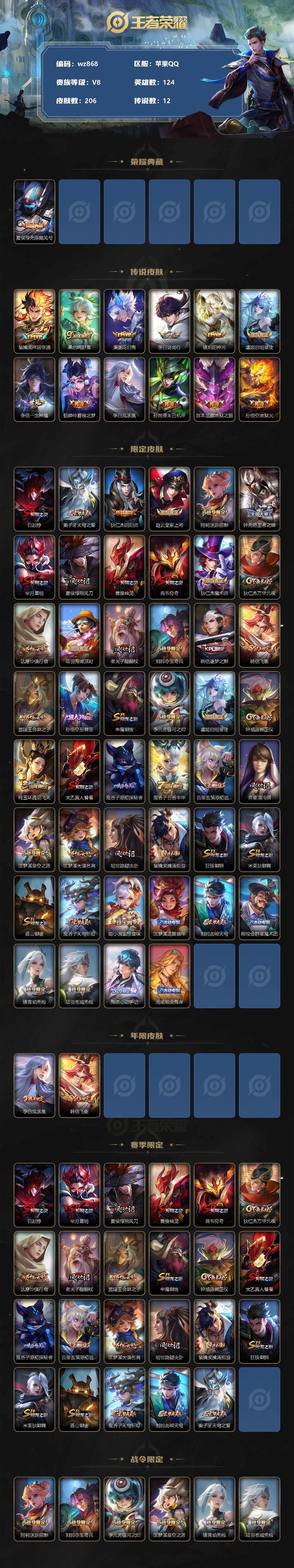 【账号佳】【王者荣耀】【编号:3339813】【可二次实名】【wz868】【商品标题】:苹果Q-V8-至尊星耀V段位-124英雄-206皮肤-1典藏-0珍品无双-0无双-0珍品传说-12传说-43史诗 【荣耀典藏】:夏侯惇无限飓风号 【传说皮肤】:裴擒虎祥瑞亨通,桑启鸣野蒿,澜逐花归海,李白诗剑行,镜炽阳神光,虞姬启明星使,李信一念神魔,貂蝉仲夏夜之梦,李白凤求凰,孙尚香末日机甲,宫本武藏地狱之眼,孙悟空地狱火 【限定皮肤】:白起狰,姜子牙天穹之誓,狄仁杰阴阳师,赵云皇家上将,阿轲迷踪丽影,钟无艳王者之锤,芈月重明,夏侯惇朔风刀,曹操烛龙,典韦穷奇,狄仁杰魔术师,狄仁杰万华元夜,达摩沙漠行僧,项羽海滩派对,老夫子醍醐杖,刘邦夺宝奇兵,韩信逐梦之影,韩信飞衡,兰陵王金庭之子,孙悟空至尊宝,牛魔御旌,李元芳银河之约,虞姬启明星使,钟馗驱傩正仪,杨玉环遇见飞天,太乙真人饕餮,鬼谷子原初探秘者,鬼谷子五谷丰年,百里玄策原初追逐者,弈星混沌棋,沈梦溪星空之诺,沈梦溪大漠名商,明世隐疑决卦,裴擒虎擒涛扼浪,狂铁御狮,米莱狄御霄,盾山御銮,鬼谷子天穹祈灯,姬小满妄想食味,沈梦溪龙舞盛年,刘邦剑破天穹,程咬金群星魔术团,镜青焰无极,项羽苍威无极,海诺心动手记,周瑜熔金海岸 【年限皮肤】:李白凤求凰,韩信飞衡 【赛季限定】:白起狰,芈月重明,夏侯惇朔风刀,曹操烛龙,典韦穷奇,狄仁杰万华元夜,达摩沙漠行僧,老夫子醍醐杖,兰陵王金庭之子,牛魔御旌,钟馗驱傩正仪,太乙真人饕餮,鬼谷子原初探秘者,百里玄策原初追逐者,弈星混沌棋,沈梦溪大漠名商,明世隐疑决卦,裴擒虎擒涛扼浪,狂铁御狮,米莱狄御霄,盾山御銮,鬼谷子天穹祈灯,刘邦剑破天穹,姜子牙天穹之誓 【战令限定】:阿轲迷踪丽影,刘邦夺宝奇兵,李元芳银河之约,沈梦溪星空之诺,镜青焰无极,项羽苍威无极 【史诗皮肤】:钟无艳王者之锤,赵云皇家上将,赵云未来纪元,貂蝉圣诞恋歌,甄姬冰雪圆舞曲,狄仁杰魔术师,宫本武藏鬼剑武藏,孙尚香水果甜心,嬴政暗夜贵公子,妲己女仆咖啡,墨子金属风暴,吕布圣诞狂欢,李白千年之狐,韩信白龙吟,孙悟空至尊宝,花木兰水晶猎龙者,刘邦德古拉伯爵,韩信逐梦之影,夏侯惇乘风破浪,小乔缤纷独角兽,兰陵王暗隐猎兽者,诸葛亮黄金分割率,百里守约特工魅影,李元芳逐浪之夏,程咬金功夫厨神,白起星夜王子,阿轲节奏热浪,杨玉环遇见飞天,狄仁杰鹰眼统帅,李元芳银河之约,娜可露露晚萤,韩信飞衡,小乔青蛇,阿轲迷踪丽影,百里玄策原初追逐者,司马懿暗渊魔法,鬼谷子五谷丰年,姬小满妄想食味,镜青焰无极,海诺心动手记,亚连破空之剑,牛魔星界战将,黄忠百相守梦 【其他皮肤】:项羽海滩派对,韩信教廷特使,韩信街头霸王,露娜哥特玫瑰,阿轲致命风华,阿轲爱心护理,赵云忍炎影,芈月红桃皇后,白起白色死神,牛魔西部大镖客,扁鹊化身博士,扁鹊救世之瞳,宫本武藏未来纪元,安琪拉玩偶对对碰,孙膑天使之翼,妲己少女阿狸,典韦黄金武士,亚瑟死亡骑士,花木兰兔女郎,甄姬花好人间,刘备万事如意,宫本武藏万象初新,狄仁杰阴阳师,刘备汉昭烈帝,关羽龙腾万里,墨子进击墨子号,白起狰,钟无艳海滩丽影,太乙真人饕餮,宫本武藏霸王丸,曹操烛龙,王昭君幻想奇妙夜,芈月重明,狂铁命运角斗场,老夫子功夫老勺,孙尚香沉稳之力,典韦穷奇,诸葛亮掌控之力,李白敏锐之力,鬼谷子幻乐之宴,狂铁御狮,安琪拉如懿,苏烈坚韧之力,大乔守护之力,米莱狄御霄,明世隐虹云星官,庄周奇妙博物学,牛魔御旌,吕布野性能量,盾山御銮,沈梦溪鲨炮海盗猫,夏侯惇朔风刀,沈梦溪星空之诺,弈星混沌棋,哪吒次元突破,鲁班七号黑桃队长,明世隐疑决卦,刘邦夺宝奇兵,盾山圆桌骑士,老夫子醍醐杖,狂铁特工战影,鬼谷子原初探秘者,狄仁杰万华元夜,刘禅秘密基地,杨戬次元傲视,露娜瓷语鉴心,钟馗驱傩正仪,鲁班大师乓乓大师,达摩沙漠行僧,兰陵王金庭之子,沈梦溪大漠名商,蒙恬蔚蓝守将,裴擒虎擒涛扼浪,鬼谷子天穹祈灯,廉颇功夫炙烤,沈梦溪龙舞盛年,钟无艳春野之旅,刘邦剑破天穹,盘古经纬探寻者,程咬金群星魔术团,项羽苍威无极,大司命暗都幽影,姜子牙天穹之誓,周瑜熔金海岸,孙悟空神迹守卫,盘古敬我三分,东皇太一噬灭天穹,太乙真人谧流熔炉,姜子牙星梦巡礼,甄姬逆浪荇歌,高渐离落日弦歌,莱西奥踏浪烽翎,鲁班七号福禄兄弟,鲁班七号木偶奇遇记,高渐离金属狂潮,露娜绯红之刃,老夫子潮流仙人,程咬金华尔街大亨,狄仁杰锦衣卫,曹操超能战警,张良一千零一夜,小乔万圣前夜,孙悟空西部大镖客,后羿精灵王,李白范海辛,虞姬加勒比小姐,夏侯惇战争骑士,雅典娜战争女神,马可波罗激情绿茵,苍维京掠夺者,杨戬埃及法老,太乙真人圆桌骑士,哪吒三太子,诸葛亮星航指挥官,黄忠芝加哥教父,大乔伊势巫女,东皇太一东海龙王,干将莫邪第七人偶,鬼谷子阿摩司公爵,铠龙域领主,百里守约绝影神枪,百里玄策威尼斯狂欢,苏烈爱与和