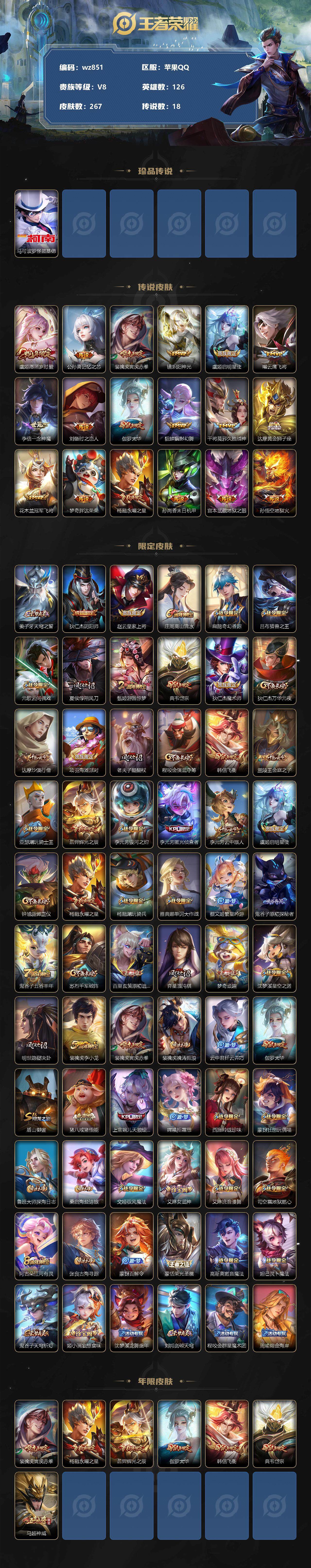 【账号佳】【王者荣耀】【编号:3339821】【可二次实名】【wz851】【商品标题】:苹果Q-V8-至尊星耀III段位-126英雄-267皮肤-0典藏-0珍品无双-0无双-1珍品传说-18传说-73史诗 【珍品传说】:马可波罗怪盗基德 【传说皮肤】:虞姬愿照岁时盈,公孙离记忆之芯,裴擒虎寅虎赤拳,镜炽阳神光,虞姬启明星使,曜云鹰飞将,李信一念神魔,刘备时之恋人,伽罗太华,貂蝉猫影幻舞,干将莫邪久胜战神,达摩黄金狮子座,花木兰冠军飞将,梦奇胖达荣荣,杨戬永曜之星,孙尚香末日机甲,宫本武藏地狱之眼,孙悟空地狱火 【限定皮肤】:姜子牙天穹之誓,狄仁杰阴阳师,赵云皇家上将,庄周高山流水,扁鹊奇幻香踪,吕布猎兽之王,元歌云间偶戏,夏侯惇朔风刀,甄姬游园惊梦,典韦岱宗,狄仁杰魔术师,狄仁杰万华元夜,达摩沙漠行僧,项羽海滩派对,老夫子醍醐杖,程咬金演武夺筹,韩信飞衡,兰陵王金庭之子,亚瑟潮玩骑士王,后羿辉光之辰,李元芳银河之约,李元芳匿光侦查者,李元芳云中旅人,虞姬启明星使,钟馗驱傩正仪,杨戬永曜之星,杨戬潮玩骑兵,雅典娜单词大作战,蔡文姬繁星吟游,鬼谷子原初探秘者,鬼谷子五谷丰年,苏烈千军破阵,百里玄策原初追逐者,弈星混沌棋,梦奇顽趣,沈梦溪星空之诺,明世隐疑决卦,裴擒虎李小龙,裴擒虎寅虎赤拳,裴擒虎擒涛扼浪,云中君纤云弄巧,伽罗太华,盾山御銮,猪八戒猪悟能,上官婉儿天狼绘梦者,嫦娥拒霜思,西施玲珑珍味,蒙犽狂想玩偶喵,鲁班大师探海日志,桑启海盐诗旅,戈娅驭风魔法,艾琳女武神,艾琳流音漫舞,司空震地狱燃心,阿古朵江河有灵,张良古海寻踪,蒙犽百解令,蒙恬荣光圣徽,高渐离燃音魔法,妲己灵卜魔法,鬼谷子天穹祈灯,姬小满妄想食味,沈梦溪龙舞盛年,刘邦剑破天穹,程咬金群星魔术团,周瑜熔金海岸 【年限皮肤】:裴擒虎寅虎赤拳,杨戬永曜之星,后羿辉光之辰,伽罗太华,韩信飞衡,典韦岱宗,马超神威 【赛季限定】:夏侯惇朔风刀,狄仁杰万华元夜,达摩沙漠行僧,老夫子醍醐杖,程咬金演武夺筹,兰陵王金庭之子,张良古海寻踪,李元芳云中旅人,钟馗驱傩正仪,鬼谷子原初探秘者,苏烈千军破阵,百里玄策原初追逐者,弈星混沌棋,梦奇顽趣,明世隐疑决卦,裴擒虎擒涛扼浪,盾山御銮,鲁班大师探海日志,桑启海盐诗旅,鬼谷子天穹祈灯,蒙恬荣光圣徽,刘邦剑破天穹,姜子牙天穹之誓 【战令限定】:扁鹊奇幻香踪,吕布猎兽之王,元歌云间偶戏,艾琳流音漫舞,亚瑟潮玩骑士王,李元芳银河之约,杨戬潮玩骑兵,雅典娜单词大作战,沈梦溪星空之诺,西施玲珑珍味,蒙犽狂想玩偶喵,司空震地狱燃心,戈娅驭风魔法,高渐离燃音魔法,妲己灵卜魔法 【史诗皮肤】:鲁班七号电玩小子,露娜紫霞仙子,阿轲暗夜猫娘,赵云皇家上将,赵云未来纪元,貂蝉圣诞恋歌,甄姬冰雪圆舞曲,王昭君偶像歌手,狄仁杰魔术师,廉颇地狱岩魂,宫本武藏鬼剑武藏,孙尚香水果甜心,嬴政暗夜贵公子,嬴政摇滚巨星,墨子金属风暴,吕布圣诞狂欢,刘禅绅士熊喵,李白千年之狐,吕布末日机甲,花木兰水晶猎龙者,刘邦德古拉伯爵,夏侯惇乘风破浪,小乔缤纷独角兽,兰陵王暗隐猎兽者,诸葛亮黄金分割率,甄姬游园惊梦,亚瑟心灵战警,后羿辉光之辰,百里守约特工魅影,李元芳逐浪之夏,程咬金功夫厨神,白起星夜王子,阿轲节奏热浪,孙策猫狗日记,伽罗箭羽风息,狄仁杰鹰眼统帅,蔡文姬繁星吟游,李元芳银河之约,韩信飞衡,典韦岱宗,不知火舞魅语,橘右京修罗,马超神威,上官婉儿天狼绘梦者,蒙犽狂想玩偶喵,百里玄策原初追逐者,裴擒虎李小龙,云中君纤云弄巧,元歌云间偶戏,沈梦溪月团寄思,猪八戒猪悟能,庄周高山流水,嫦娥拒霜思,夏洛特永昼,艾琳奇遇舞章,鬼谷子五谷丰年,梦奇顽趣,扁鹊奇幻香踪,刘禅电玩爆裂旋风,戈娅驭风魔法,李元芳匿光侦查者,司空震地狱燃心,阿古朵江河有灵,蒙犽百解令,妲己灵卜魔法,高渐离燃音魔法,蒙恬荣光圣徽,姬小满妄想食味,百里守约百相守梦,牛魔星界战将,赵怀真器灵浮梦炉,狂铁龙之律动,扁鹊灵蛊蚀心,黄忠百相守梦 【其他皮肤】:项羽海滩派对,韩信教廷特使,韩信街头霸王,露娜哥特玫瑰,达摩大发明家,赵云忍炎影,芈月红桃皇后,艾琳女武神,程咬金星际陆战队,白起白色死神,扁鹊化身博士,扁鹊救世之瞳,孙膑天使之翼,妲己少女阿狸,典韦黄金武士,达摩拳王,花木兰兔女郎,张飞五福同心,甄姬花好人间,刘备万事如意,宫本武藏万象初新,后羿阿尔法小队,狄仁杰阴阳师,刘备纽约教父,刘备汉昭烈帝,关羽龙腾万里,钟无艳海滩丽影,宫本武藏霸王丸,老夫子功夫老勺,孙尚香沉稳之力,诸葛亮掌控之力,李白敏锐之力,鬼谷子幻乐之宴,苏烈坚韧之力,项羽科学大爆炸,吕布猎兽之王,明世隐虹云星官,吕布野性能量,盾山御銮,孙膑归虚梦演,沈梦溪鲨炮海盗猫,姜子牙炽热元素使,夏侯惇朔风刀,沈梦溪星空之诺,弈星混沌棋,哪吒次元突破,鲁班七号黑桃队长,明世隐疑决卦,盾山圆桌骑士,老夫子醍醐杖,狂铁特工