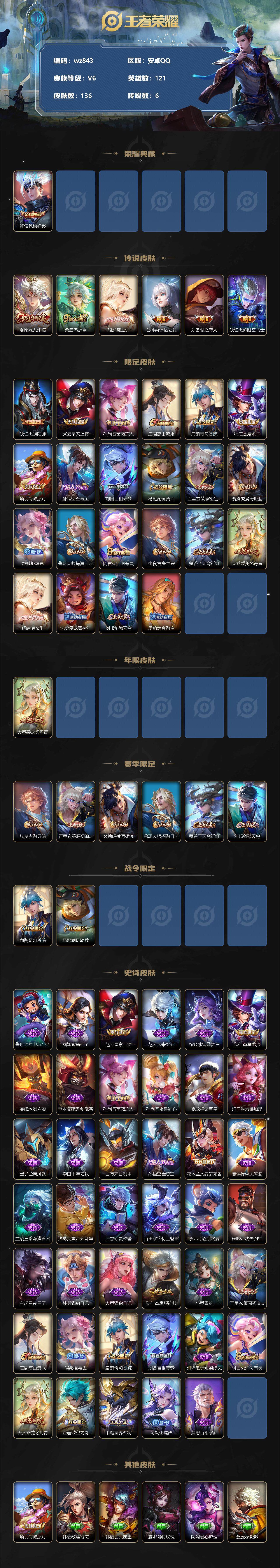 【账号佳】【王者荣耀】【编号:3339826】【可二次实名】【wz843】【商品标题】:安卓Q-V6-最强王者段位-121英雄-136皮肤-1典藏-0珍品无双-0无双-0珍品传说-6传说-41史诗 【荣耀典藏】:韩信弑枪猎影 【传说皮肤】:澜愿照九州拓,桑启鸣野蒿,貂蝉曦玄引,公孙离记忆之芯,刘备时之恋人,狄仁杰超时空战士 【限定皮肤】:狄仁杰阴阳师,赵云皇家上将,孙尚香蔷薇恋人,庄周高山流水,扁鹊奇幻香踪,狄仁杰魔术师,项羽海滩派对,孙悟空至尊宝,刘备百相守梦,杨戬潮玩骑兵,百里玄策原初追逐者,裴擒虎擒涛扼浪,嫦娥拒霜思,鲁班大师探海日志,阿古朵江河有灵,张良古海寻踪,鬼谷子天穹祈灯,大乔乘龙忆丹青,貂蝉曦玄引,沈梦溪龙舞盛年,刘邦剑破天穹,周瑜熔金海岸 【年限皮肤】:大乔乘龙忆丹青 【赛季限定】:张良古海寻踪,百里玄策原初追逐者,裴擒虎擒涛扼浪,鲁班大师探海日志,鬼谷子天穹祈灯,刘邦剑破天穹 【战令限定】:扁鹊奇幻香踪,杨戬潮玩骑兵 【史诗皮肤】:鲁班七号电玩小子,露娜紫霞仙子,赵云皇家上将,赵云未来纪元,甄姬冰雪圆舞曲,狄仁杰魔术师,廉颇地狱岩魂,宫本武藏鬼剑武藏,孙尚香蔷薇恋人,孙尚香水果甜心,嬴政摇滚巨星,妲己魅力维加斯,墨子金属风暴,李白千年之狐,吕布末日机甲,孙悟空至尊宝,花木兰水晶猎龙者,夏侯惇乘风破浪,兰陵王暗隐猎兽者,诸葛亮黄金分割率,亚瑟心灵战警,百里守约特工魅影,李元芳逐浪之夏,程咬金功夫厨神,白起星夜王子,孙策猫狗日记,大乔猫狗日记,狄仁杰鹰眼统帅,小乔青蛇,百里玄策原初追逐者,庄周高山流水,嫦娥拒霜思,扁鹊奇幻香踪,刘备百相守梦,刘禅电玩爆裂旋风,阿古朵江河有灵,大乔乘龙忆丹青,亚连破空之剑,牛魔星界战将,阿轲化蝶舞,黄忠百相守梦 【其他皮肤】:项羽海滩派对,韩信教廷特使,韩信街头霸王,露娜哥特玫瑰,阿轲爱心护理,赵云忍炎影,程咬金星际陆战队,白起白色死神,扁鹊救世之瞳,宫本武藏未来纪元,安琪拉玩偶对对碰,孙膑天使之翼,典韦黄金武士,亚瑟死亡骑士,张飞五福同心,甄姬花好人间,狄仁杰阴阳师,刘备纽约教父,关羽龙腾万里,王昭君幻想奇妙夜,狂铁命运角斗场,老夫子功夫老勺,诸葛亮掌控之力,李白敏锐之力,小乔丁香结,哪吒次元突破,狂铁特工战影,刘禅秘密基地,鲁班大师乓乓大师,猪八戒潮玩探月行,裴擒虎擒涛扼浪,杨戬潮玩骑兵,太乙真人劲辣红锅,鲁班大师探海日志,姬小满零食大作战,李元芳妄想特派,张良古海寻踪,钟无艳聚星闪耀,海月王牌新星,亚连破局者,后羿完美运算,鬼谷子天穹祈灯,嫦娥漠中幻影,沈梦溪龙舞盛年,刘邦剑破天穹,周瑜熔金海岸,孙悟空神迹守卫,盘古敬我三分,东皇太一噬灭天穹,干将莫邪雾都夜雨,苍苍林狼骑,太乙真人谧流熔炉,典韦铁骨偃魂,影魅影绮裳,西施雪境奇遇,明世隐景韶洛都,甄姬逆浪荇歌,莱西奥踏浪烽翎,鲁班七号福禄兄弟,高渐离金属狂潮,钟无艳生化警戒,老夫子潮流仙人,王昭君精灵公主,狄仁杰锦衣卫,小乔万圣前夜,孙膑未来旅行,孙悟空西部大镖客,后羿精灵王,李白范海辛,钟馗地府判官,马可波罗激情绿茵,杨戬埃及法老,哪吒三太子,黄忠芝加哥教父,大乔伊势巫女,铠龙域领主,女娲尼罗河女神,公孙离花间舞,杨玉环霓裳曲,米莱狄精准探案法,司马懿魇语军师,李信灼热之刃,盘古创世神祝,曜归虚梦演,阿古朵熊喵少女,澜孤猎,云缨赤焰之缨,暃碧珀绯影 【内测皮肤】:孙尚香蔷薇恋人,狂铁特工战影 【营地ID】:1791132426