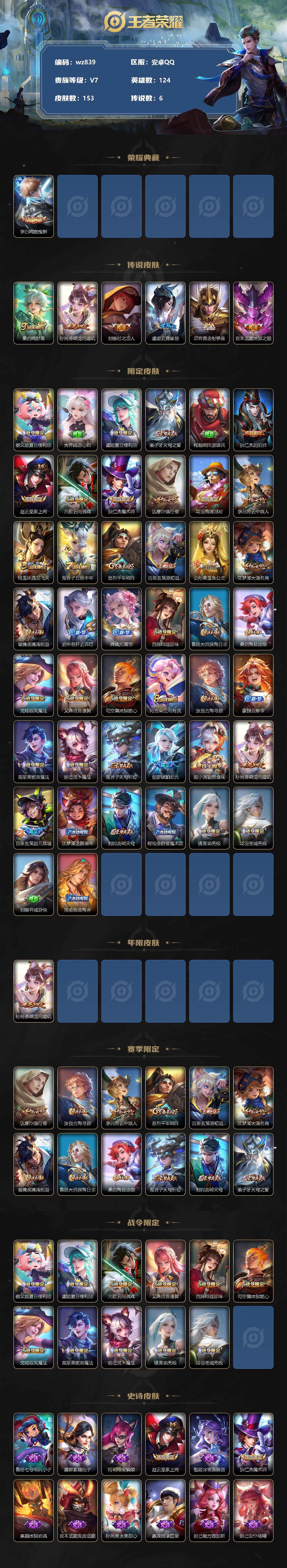 【账号佳】【王者荣耀】【编号:3339831】【可二次实名】【wz839】【商品标题】:安卓Q-V7-永恒钻石II段位-124英雄-153皮肤-1典藏-0珍品无双-0无双-0珍品传说-6传说-47史诗 【荣耀典藏】:李白鸣剑曳影 【传说皮肤】:桑启鸣野蒿,孙尚香乘龙问璇玑,刘备时之恋人,虞姬云霓雀翎,后羿黄金射手座,宫本武藏地狱之眼 【限定皮肤】:蔡文姬夏日便利店,大乔绒语心约,虞姬夏日便利店,姜子牙天穹之誓,杨戬破阵退雄兵,狄仁杰阴阳师,赵云皇家上将,元歌云间偶戏,狄仁杰魔术师,达摩沙漠行僧,项羽海滩派对,李元芳云中旅人,杨玉环遇见飞天,鬼谷子五谷丰年,苏烈千军破阵,百里玄策原初追逐者,公孙离玉兔公主,沈梦溪大漠名商,裴擒虎擒涛扼浪,云中君纤云弄巧,嫦娥拒霜思,西施玲珑珍味,鲁班大师探海日志,桑启海盐诗旅,戈娅驭风魔法,艾琳流音漫舞,司空震地狱燃心,阿古朵江河有灵,张良古海寻踪,蒙犽百解令,高渐离燃音魔法,妲己灵卜魔法,鬼谷子天穹祈灯,伽罗琥珀纪元,姬小满妄想食味,孙尚香乘龙问璇玑,百里玄策超元猎域,沈梦溪龙舞盛年,刘邦剑破天穹,程咬金群星魔术团,镜青焰无极,项羽苍威无极,刘备异域游侠,周瑜熔金海岸 【年限皮肤】:孙尚香乘龙问璇玑 【赛季限定】:达摩沙漠行僧,张良古海寻踪,李元芳云中旅人,苏烈千军破阵,百里玄策原初追逐者,沈梦溪大漠名商,裴擒虎擒涛扼浪,鲁班大师探海日志,桑启海盐诗旅,鬼谷子天穹祈灯,刘邦剑破天穹,姜子牙天穹之誓 【战令限定】:蔡文姬夏日便利店,虞姬夏日便利店,元歌云间偶戏,艾琳流音漫舞,西施玲珑珍味,司空震地狱燃心,戈娅驭风魔法,高渐离燃音魔法,妲己灵卜魔法,镜青焰无极,项羽苍威无极 【史诗皮肤】:鲁班七号电玩小子,露娜紫霞仙子,阿轲暗夜猫娘,赵云皇家上将,甄姬冰雪圆舞曲,狄仁杰魔术师,廉颇地狱岩魂,宫本武藏鬼剑武藏,孙尚香水果甜心,嬴政摇滚巨星,妲己魅力维加斯,妲己女仆咖啡,吕布圣诞狂欢,李白千年之狐,张飞乱世虎臣,花木兰水晶猎龙者,刘邦德古拉伯爵,夏侯惇乘风破浪,小乔缤纷独角兽,兰陵王暗隐猎兽者,安琪拉心灵骇客,李元芳逐浪之夏,杨玉环遇见飞天,伽罗箭羽风息,狄仁杰鹰眼统帅,百里玄策原初追逐者,云中君纤云弄巧,元歌云间偶戏,沈梦溪月团寄思,司马懿暗渊魔法,嫦娥拒霜思,公孙离玉兔公主,鬼谷子五谷丰年,戈娅驭风魔法,司空震地狱燃心,阿古朵江河有灵,蒙犽百解令,妲己灵卜魔法,高渐离燃音魔法,伽罗琥珀纪元,姬小满妄想食味,百里玄策超元猎域,镜青焰无极,蔡文姬夏日便利店,亚连破空之剑,牛魔星界战将,西施织梦人,公孙离涂山容容 【其他皮肤】:项羽海滩派对,韩信教廷特使,韩信街头霸王,露娜哥特玫瑰,赵云忍炎影,芈月红桃皇后,白起白色死神,扁鹊化身博士,姜子牙时尚教父,典韦黄金武士,亚瑟死亡骑士,花木兰兔女郎,张飞五福同心,宫本武藏万象初新,狄仁杰阴阳师,刘备汉昭烈帝,钟无艳海滩丽影,王昭君幻想奇妙夜,老夫子功夫老勺,苏烈坚韧之力,明世隐虹云星官,沈梦溪鲨炮海盗猫,哪吒次元突破,盾山圆桌骑士,狂铁特工战影,刘禅秘密基地,露娜瓷语鉴心,张良缤纷绘卷,鲁班大师乓乓大师,苏烈千军破阵,达摩沙漠行僧,米莱狄契约魔法,沈梦溪大漠名商,蒙恬蔚蓝守将,李元芳云中旅人,刘备潮玩造梦师,桑启海盐诗旅,猪八戒潮玩探月行,赵怀真太极少年,裴擒虎擒涛扼浪,太乙真人劲辣红锅,鲁班大师探海日志,西施玲珑珍味,李元芳妄想特派,艾琳流音漫舞,张良古海寻踪,钟无艳聚星闪耀,海月王牌新星,兰陵王幻夜行动,曹操决胜大满贯,后羿完美运算,程咬金暖冬絮语,鬼谷子天穹祈灯,妲己灵卜魔法,海诺时空谍影,嫦娥漠中幻影,朵莉亚金色潮汐,亚瑟鸿运当头,沈梦溪龙舞盛年,钟无艳春野之旅,扁鹊无尽旅途,刘邦剑破天穹,盘古经纬探寻者,程咬金群星魔术团,项羽苍威无极,大司命暗都幽影,刘备异域游侠,杨戬破阵退雄兵,姜子牙天穹之誓,周瑜熔金海岸,虞姬夏日便利店,大乔绒语心约,孙悟空神迹守卫,盘古敬我三分,苍苍林狼骑,典韦铁骨偃魂,姜子牙星梦巡礼,阿古朵布丁狗之约,甄姬逆浪荇歌,狄仁杰锦衣卫,张良一千零一夜,孙悟空西部大镖客,后羿精灵王,蔡文姬蔷薇王座,马可波罗激情绿茵,苍维京掠夺者,黄忠芝加哥教父,干将莫邪第七人偶,铠龙域领主,百里守约绝影神枪,女娲尼罗河女神,弈星踏雪寻梅,米莱狄精准探案法,元歌午夜歌剧院,伽罗花见巫女,瑶森,曜归虚梦演,澜孤猎,司空震启蛰 【内测皮肤】:狂铁特工战影 【营地ID】:1807610269