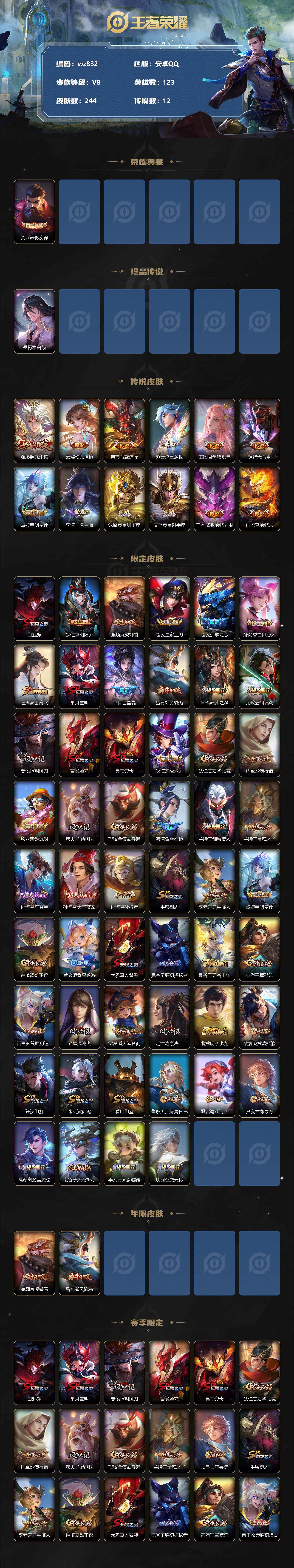【账号佳】【王者荣耀】【编号:3339832】【可二次实名】【wz832】【商品标题】:安卓Q-V8-最强王者段位-123英雄-244皮肤-1典藏-0珍品无双-0无双-1珍品传说-12传说-56史诗 【荣耀典藏】:关羽赤影疾锋 【珍品传说】:暃朽木白哉 【传说皮肤】:澜愿照九州拓,云缨幻光神枪,典韦战鼓燎原,赵云淬星耀世,王昭君乞巧织情,铠绛天战甲,虞姬启明星使,李信一念神魔,达摩黄金狮子座,后羿黄金射手座,宫本武藏地狱之眼,孙悟空地狱火 【限定皮肤】:白起狰,狄仁杰阴阳师,廉颇寅虎御盾,赵云皇家上将,赵云引擎之心,孙尚香蔷薇恋人,庄周高山流水,芈月重明,芈月白晶晶,吕布御风骁将,周瑜赤莲之焰,元歌云间偶戏,夏侯惇朔风刀,曹操烛龙,典韦穷奇,狄仁杰魔术师,狄仁杰万华元夜,达摩沙漠行僧,项羽海滩派对,老夫子醍醐杖,程咬金演武夺筹,韩信傲雪梅枪,兰陵王驯魔猎人,兰陵王金庭之子,孙悟空至尊宝,孙悟空大圣娶亲,孙悟空孙行者,牛魔御旌,李元芳云中旅人,虞姬启明星使,钟馗驱傩正仪,蔡文姬繁星吟游,太乙真人饕餮,鬼谷子原初探秘者,鬼谷子五谷丰年,苏烈千军破阵,百里玄策原初追逐者,弈星混沌棋,沈梦溪大漠名商,明世隐疑决卦,裴擒虎李小龙,裴擒虎擒涛扼浪,狂铁御狮,米莱狄御霄,盾山御銮,鲁班大师探海日志,桑启海盐诗旅,张良古海寻踪,高渐离燃音魔法,鬼谷子天穹祈灯,李元芳蔬乡物语,项羽苍威无极 【年限皮肤】:廉颇寅虎御盾,吕布御风骁将 【赛季限定】:白起狰,芈月重明,夏侯惇朔风刀,曹操烛龙,典韦穷奇,狄仁杰万华元夜,达摩沙漠行僧,老夫子醍醐杖,程咬金演武夺筹,兰陵王金庭之子,张良古海寻踪,牛魔御旌,李元芳云中旅人,钟馗驱傩正仪,太乙真人饕餮,鬼谷子原初探秘者,苏烈千军破阵,百里玄策原初追逐者,弈星混沌棋,沈梦溪大漠名商,明世隐疑决卦,裴擒虎擒涛扼浪,狂铁御狮,米莱狄御霄,盾山御銮,鲁班大师探海日志,桑启海盐诗旅,鬼谷子天穹祈灯 【战令限定】:周瑜赤莲之焰,元歌云间偶戏,兰陵王驯魔猎人,高渐离燃音魔法,李元芳蔬乡物语,项羽苍威无极 【史诗皮肤】:鲁班七号电玩小子,项羽苍穹之光,露娜紫霞仙子,阿轲暗夜猫娘,赵云皇家上将,赵云未来纪元,甄姬冰雪圆舞曲,狄仁杰魔术师,廉颇地狱岩魂,孙尚香蔷薇恋人,孙尚香水果甜心,嬴政暗夜贵公子,妲己魅力维加斯,妲己女仆咖啡,墨子金属风暴,吕布圣诞狂欢,曹操幽灵船长,张飞乱世虎臣,孙悟空至尊宝,赵云引擎之心,花木兰水晶猎龙者,夏侯惇乘风破浪,兰陵王暗隐猎兽者,安琪拉心灵骇客,百里守约特工魅影,刘禅天才门将,白起星夜王子,孙悟空大圣娶亲,狄仁杰鹰眼统帅,兰陵王驯魔猎人,蔡文姬繁星吟游,橘右京修罗,百里玄策原初追逐者,裴擒虎李小龙,元歌云间偶戏,芈月白晶晶,吕布御风骁将,孙悟空孙行者,庄周高山流水,司马懿暗渊魔法,韩信傲雪梅枪,廉颇寅虎御盾,夏洛特永昼,澜赏金猎手,鬼谷子五谷丰年,高渐离燃音魔法,孙膑茶境仙,白起苍鳞隐世,赵怀真器灵浮梦炉,阿轲化蝶舞,刘禅鸭鸭历险记,狂铁龙之律动,老夫子藏狐褐绒,周瑜百相守梦,黄忠百相守梦,公孙离涂山容容 【其他皮肤】:项羽海滩派对,韩信教廷特使,韩信街头霸王,露娜哥特玫瑰,达摩大发明家,赵云忍炎影,芈月红桃皇后,程咬金星际陆战队,白起白色死神,牛魔西部大镖客,扁鹊化身博士,安琪拉玩偶对对碰,姜子牙时尚教父,妲己少女阿狸,典韦黄金武士,亚瑟死亡骑士,花木兰兔女郎,张飞五福同心,甄姬花好人间,刘备万事如意,宫本武藏万象初新,后羿阿尔法小队,狄仁杰阴阳师,刘备纽约教父,刘备汉昭烈帝,关羽龙腾万里,墨子进击墨子号,白起狰,钟无艳海滩丽影,太乙真人饕餮,宫本武藏霸王丸,曹操烛龙,王昭君幻想奇妙夜,芈月重明,狂铁命运角斗场,老夫子功夫老勺,孙尚香沉稳之力,典韦穷奇,诸葛亮掌控之力,鬼谷子幻乐之宴,狂铁御狮,苏烈坚韧之力,大乔守护之力,项羽科学大爆炸,米莱狄御霄,明世隐虹云星官,牛魔御旌,吕布野性能量,盾山御銮,沈梦溪鲨炮海盗猫,夏侯惇朔风刀,周瑜赤莲之焰,弈星混沌棋,哪吒次元突破,明世隐疑决卦,盾山圆桌骑士,老夫子醍醐杖,廉颇无尽征程,鬼谷子原初探秘者,狄仁杰万华元夜,刘禅秘密基地,程咬金演武夺筹,盘古重装意志,钟馗驱傩正仪,鲁班大师乓乓大师,苏烈千军破阵,典韦铁甲之心,妲己紫罗兰之誓,达摩沙漠行僧,程咬金无双福将,刘邦虎啸剑宗,兰陵王金庭之子,沈梦溪大漠名商,蒙恬蔚蓝守将,李元芳云中旅人,桑启海盐诗旅,猪八戒潮玩探月行,裴擒虎擒涛扼浪,鲁班大师探海日志,姬小满零食大作战,张良古海寻踪,亚连破局者,鬼谷子天穹祈灯,海诺时空谍影,廉颇功夫炙烤,李元芳蔬乡物语,项羽苍威无极,东皇太一噬灭天穹,干将莫邪雾都夜雨,苍苍林狼骑,太乙真人谧流熔炉,典韦铁骨偃魂,马超访茗客,影魅影绮裳,西施雪境奇遇,姜子牙星梦巡礼,东皇太一金福满堂,达摩爆裂喵拳,明世隐景韶洛都,戈娅玫蓝誓