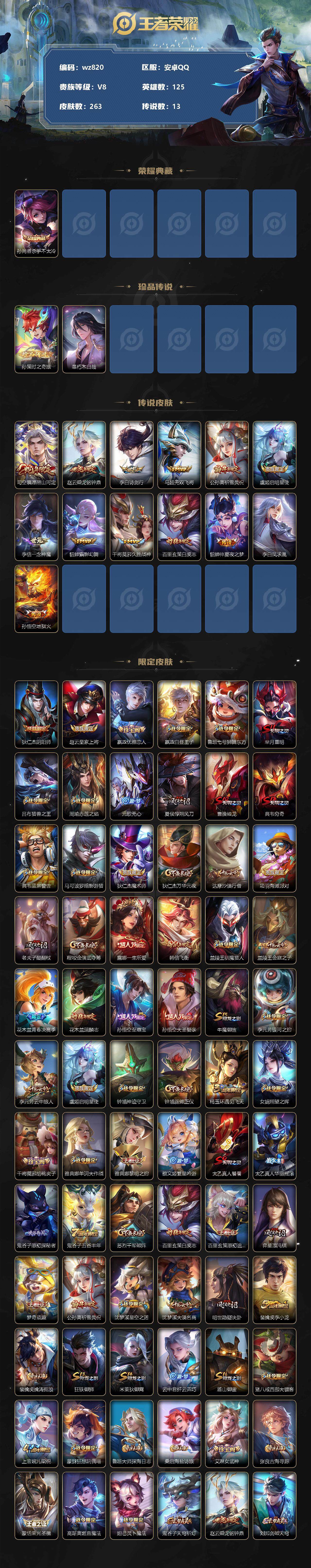 【账号佳】【王者荣耀】【编号:3339835】【可二次实名】【wz820】【商品标题】:安卓Q-V8-至尊星耀II段位-125英雄-263皮肤-1典藏-0珍品无双-0无双-2珍品传说-13传说-69史诗 【荣耀典藏】:孙尚香杀手不太冷 【珍品传说】:孙策时之奇旅,暃朽木白哉 【传说皮肤】:司空震愿照山河定,赵云乘龙铭钟鼎,李白诗剑行,马超无双飞将,公孙离祈雪灵祝,虞姬启明星使,李信一念神魔,貂蝉猫影幻舞,干将莫邪久胜战神,百里玄策白虎志,貂蝉仲夏夜之梦,李白凤求凰,孙悟空地狱火 【限定皮肤】:狄仁杰阴阳师,赵云皇家上将,嬴政优雅恋人,嬴政白昼王子,鲁班七号狮舞东方,芈月重明,吕布猎兽之王,周瑜赤莲之焰,元歌无心,夏侯惇朔风刀,曹操烛龙,典韦穷奇,典韦蓝屏警告,马可波罗暗影游猎,狄仁杰魔术师,狄仁杰万华元夜,达摩沙漠行僧,项羽海滩派对,老夫子醍醐杖,程咬金演武夺筹,露娜一生所爱,韩信飞衡,兰陵王驯魔猎人,兰陵王金庭之子,花木兰青春决赛季,花木兰瑞麟志,孙悟空至尊宝,孙悟空大圣娶亲,牛魔御旌,李元芳银河之约,李元芳云中旅人,虞姬启明星使,钟馗神迹守卫,钟馗驱傩正仪,杨玉环遇见飞天,女娲朔望之晖,干将莫邪胡桃夹子,雅典娜单词大作战,雅典娜黎明之约,蔡文姬繁星吟游,太乙真人饕餮,太乙真人华丽摇滚,鬼谷子原初探秘者,鬼谷子五谷丰年,苏烈千军破阵,百里玄策白虎志,百里玄策原初追逐者,弈星混沌棋,梦奇顽趣,公孙离祈雪灵祝,沈梦溪星空之诺,沈梦溪大漠名商,明世隐疑决卦,裴擒虎李小龙,裴擒虎擒涛扼浪,狂铁御狮,米莱狄御霄,云中君纤云弄巧,盾山御銮,猪八戒西部大镖客,上官婉儿梁祝,蒙犽狂想玩偶喵,鲁班大师探海日志,桑启海盐诗旅,艾琳女武神,张良古海寻踪,蒙恬荣光圣徽,高渐离燃音魔法,妲己灵卜魔法,鬼谷子天穹祈灯,赵云乘龙铭钟鼎,刘邦剑破天穹,周瑜熔金海岸 【年限皮肤】:百里玄策白虎志,花木兰瑞麟志,李白凤求凰,公孙离祈雪灵祝,韩信飞衡,赵云乘龙铭钟鼎 【赛季限定】:芈月重明,夏侯惇朔风刀,曹操烛龙,典韦穷奇,狄仁杰万华元夜,达摩沙漠行僧,老夫子醍醐杖,程咬金演武夺筹,兰陵王金庭之子,张良古海寻踪,牛魔御旌,李元芳云中旅人,钟馗驱傩正仪,雅典娜黎明之约,太乙真人饕餮,鬼谷子原初探秘者,苏烈千军破阵,百里玄策原初追逐者,弈星混沌棋,梦奇顽趣,沈梦溪大漠名商,明世隐疑决卦,裴擒虎擒涛扼浪,狂铁御狮,米莱狄御霄,盾山御銮,鲁班大师探海日志,桑启海盐诗旅,鬼谷子天穹祈灯,蒙恬荣光圣徽,刘邦剑破天穹 【战令限定】:嬴政白昼王子,鲁班七号狮舞东方,吕布猎兽之王,周瑜赤莲之焰,典韦蓝屏警告,马可波罗暗影游猎,兰陵王驯魔猎人,李元芳银河之约,钟馗神迹守卫,女娲朔望之晖,雅典娜单词大作战,沈梦溪星空之诺,猪八戒西部大镖客,蒙犽狂想玩偶喵,高渐离燃音魔法,妲己灵卜魔法 【史诗皮肤】:鲁班七号电玩小子,露娜紫霞仙子,阿轲暗夜猫娘,赵云皇家上将,赵云未来纪元,貂蝉圣诞恋歌,甄姬冰雪圆舞曲,王昭君偶像歌手,狄仁杰魔术师,宫本武藏鬼剑武藏,孙尚香水果甜心,嬴政优雅恋人,嬴政摇滚巨星,妲己魅力维加斯,妲己女仆咖啡,墨子金属风暴,吕布圣诞狂欢,曹操幽灵船长,李白千年之狐,吕布末日机甲,张飞乱世虎臣,孙悟空至尊宝,花木兰水晶猎龙者,刘邦德古拉伯爵,夏侯惇乘风破浪,诸葛亮黄金分割率,花木兰青春决赛季,百里守约特工魅影,铠曙光守护者,蔡文姬舞动绿茵,刘禅天才门将,李元芳逐浪之夏,程咬金功夫厨神,白起星夜王子,杨玉环遇见飞天,嬴政白昼王子,露娜一生所爱,孙悟空大圣娶亲,花木兰瑞麟志,典韦蓝屏警告,鲁班七号狮舞东方,狄仁杰鹰眼统帅,公孙离无限星赏官,兰陵王驯魔猎人,上官婉儿梁祝,蔡文姬繁星吟游,李元芳银河之约,韩信飞衡,不知火舞魅语,橘右京修罗,马可波罗暗影游猎,蒙犽狂想玩偶喵,百里玄策原初追逐者,裴擒虎李小龙,云中君纤云弄巧,杨戬天秀启明,雅典娜黎明之约,鬼谷子五谷丰年,元歌无心,梦奇顽趣,妲己灵卜魔法,高渐离燃音魔法,蒙恬荣光圣徽,姬小满飞车小橘子,赵怀真器灵浮梦炉,刘禅鸭鸭历险记,狂铁龙之律动,后羿石田雨龙,周瑜百相守梦,黄忠百相守梦 【其他皮肤】:项羽海滩派对,韩信教廷特使,韩信街头霸王,露娜哥特玫瑰,阿轲爱心护理,达摩大发明家,赵云白执事,赵云忍炎影,艾琳女武神,程咬金星际陆战队,扁鹊化身博士,宫本武藏未来纪元,安琪拉玩偶对对碰,孙膑天使之翼,姜子牙时尚教父,妲己少女阿狸,典韦黄金武士,亚瑟死亡骑士,达摩拳王,花木兰兔女郎,张飞五福同心,甄姬花好人间,刘备万事如意,宫本武藏万象初新,后羿阿尔法小队,狄仁杰阴阳师,刘备纽约教父,关羽龙腾万里,钟无艳海滩丽影,太乙真人饕餮,宫本武藏霸王丸,曹操烛龙,王昭君幻想奇妙夜,芈月重明,狂铁命运角斗场,老夫子功夫老勺,孙尚香沉稳之力,典韦穷奇,诸葛亮掌控之力,李白敏锐之力,鬼谷子幻乐之宴,狂铁御狮,