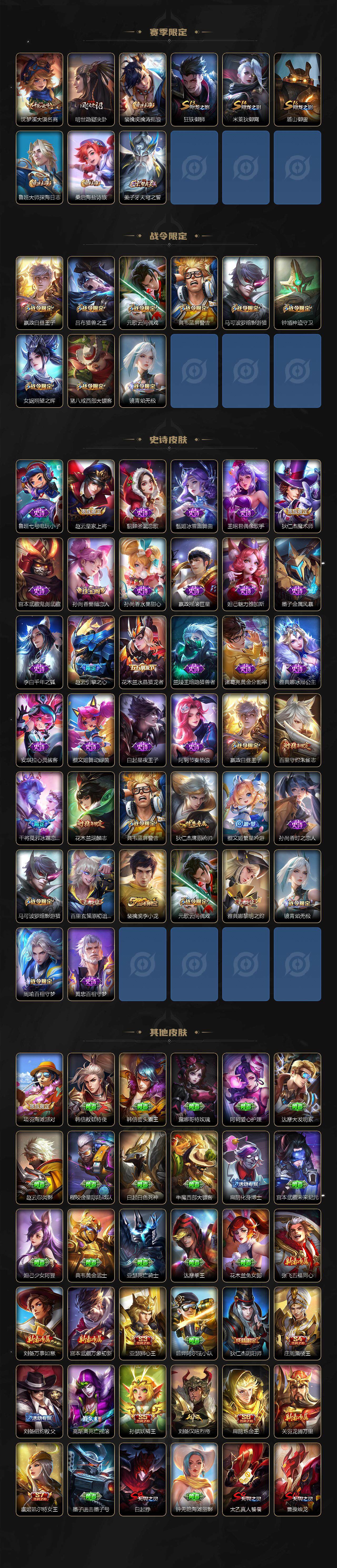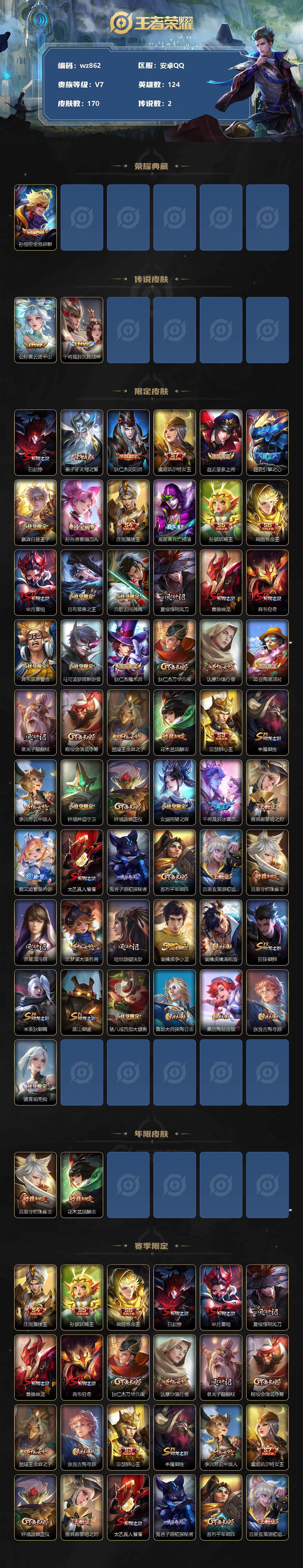 【账号佳】【王者荣耀】【编号:3339836】【可二次实名】【wz862】【商品标题】:安卓Q-V7-最强王者段位-124英雄-170皮肤-1典藏-0珍品无双-0无双-0珍品传说-2传说-38史诗 【荣耀典藏】:孙悟空全息碎影 【传说皮肤】:公孙离云诺千山,干将莫邪久胜战神 【限定皮肤】:白起狰,姜子牙天穹之誓,狄仁杰阴阳师,虞姬凯尔特女王,赵云皇家上将,赵云引擎之心,嬴政白昼王子,孙尚香蔷薇恋人,庄周蜃楼王,高渐离死亡摇滚,孙膑妖精王,扁鹊炼金王,芈月重明,吕布猎兽之王,元歌云间偶戏,夏侯惇朔风刀,曹操烛龙,典韦穷奇,典韦蓝屏警告,马可波罗暗影游猎,狄仁杰魔术师,狄仁杰万华元夜,达摩沙漠行僧,项羽海滩派对,老夫子醍醐杖,程咬金演武夺筹,兰陵王金庭之子,花木兰瑞麟志,亚瑟狮心王,牛魔御旌,李元芳云中旅人,钟馗神迹守卫,钟馗驱傩正仪,女娲朔望之晖,干将莫邪冰霜恋舞曲,雅典娜黎明之约,蔡文姬繁星吟游,太乙真人饕餮,鬼谷子原初探秘者,苏烈千军破阵,百里玄策原初追逐者,百里守约朱雀志,弈星混沌棋,沈梦溪大漠名商,明世隐疑决卦,裴擒虎李小龙,裴擒虎擒涛扼浪,狂铁御狮,米莱狄御霄,盾山御銮,猪八戒西部大镖客,鲁班大师探海日志,桑启海盐诗旅,张良古海寻踪,镜青焰无极 【年限皮肤】:百里守约朱雀志,花木兰瑞麟志 【赛季限定】:庄周蜃楼王,孙膑妖精王,扁鹊炼金王,白起狰,芈月重明,夏侯惇朔风刀,曹操烛龙,典韦穷奇,狄仁杰万华元夜,达摩沙漠行僧,老夫子醍醐杖,程咬金演武夺筹,兰陵王金庭之子,张良古海寻踪,亚瑟狮心王,牛魔御旌,李元芳云中旅人,虞姬凯尔特女王,钟馗驱傩正仪,雅典娜黎明之约,太乙真人饕餮,鬼谷子原初探秘者,苏烈千军破阵,百里玄策原初追逐者,弈星混沌棋,沈梦溪大漠名商,明世隐疑决卦,裴擒虎擒涛扼浪,狂铁御狮,米莱狄御霄,盾山御銮,鲁班大师探海日志,桑启海盐诗旅,姜子牙天穹之誓 【战令限定】:嬴政白昼王子,吕布猎兽之王,元歌云间偶戏,典韦蓝屏警告,马可波罗暗影游猎,钟馗神迹守卫,女娲朔望之晖,猪八戒西部大镖客,镜青焰无极 【史诗皮肤】:鲁班七号电玩小子,赵云皇家上将,貂蝉圣诞恋歌,甄姬冰雪圆舞曲,王昭君偶像歌手,狄仁杰魔术师,宫本武藏鬼剑武藏,孙尚香蔷薇恋人,孙尚香水果甜心,嬴政摇滚巨星,妲己魅力维加斯,墨子金属风暴,李白千年之狐,赵云引擎之心,花木兰水晶猎龙者,兰陵王暗隐猎兽者,诸葛亮黄金分割率,雅典娜冰冠公主,安琪拉心灵骇客,蔡文姬舞动绿茵,白起星夜王子,阿轲节奏热浪,嬴政白昼王子,百里守约朱雀志,干将莫邪冰霜恋舞曲,花木兰瑞麟志,典韦蓝屏警告,狄仁杰鹰眼统帅,蔡文姬繁星吟游,孙尚香时之恋人,马可波罗暗影游猎,百里玄策原初追逐者,裴擒虎李小龙,元歌云间偶戏,雅典娜黎明之约,镜青焰无极,周瑜百相守梦,黄忠百相守梦 【其他皮肤】:项羽海滩派对,韩信教廷特使,韩信街头霸王,露娜哥特玫瑰,阿轲爱心护理,达摩大发明家,赵云忍炎影,程咬金星际陆战队,白起白色死神,牛魔西部大镖客,扁鹊化身博士,宫本武藏未来纪元,妲己少女阿狸,典韦黄金武士,亚瑟死亡骑士,达摩拳王,花木兰兔女郎,张飞五福同心,刘备万事如意,宫本武藏万象初新,亚瑟狮心王,后羿阿尔法小队,狄仁杰阴阳师,庄周蜃楼王,刘备纽约教父,高渐离死亡摇滚,孙膑妖精王,刘备汉昭烈帝,扁鹊炼金王,关羽龙腾万里,虞姬凯尔特女王,墨子进击墨子号,白起狰,钟无艳海滩丽影,太乙真人饕餮,曹操烛龙,芈月重明,狂铁命运角斗场,老夫子功夫老勺,孙尚香沉稳之力,典韦穷奇,诸葛亮掌控之力,李白敏锐之力,鬼谷子幻乐之宴,狂铁御狮,苏烈坚韧之力,大乔守护之力,项羽科学大爆炸,米莱狄御霄,吕布猎兽之王,明世隐虹云星官,庄周奇妙博物学,牛魔御旌,女娲朔望之晖,小乔丁香结,钟馗神迹守卫,盾山御銮,沈梦溪鲨炮海盗猫,夏侯惇朔风刀,弈星混沌棋,明世隐疑决卦,老夫子醍醐杖,猪八戒西部大镖客,鬼谷子原初探秘者,狄仁杰万华元夜,刘禅秘密基地,杨戬次元傲视,程咬金演武夺筹,钟馗驱傩正仪,鲁班大师乓乓大师,苏烈千军破阵,达摩沙漠行僧,兰陵王金庭之子,沈梦溪大漠名商,李元芳云中旅人,桑启海盐诗旅,猪八戒潮玩探月行,裴擒虎擒涛扼浪,鲁班大师探海日志,张良古海寻踪,姜子牙天穹之誓,苏烈春野闲踪,小乔秘证寻踪,阿古朵布丁狗之约,露娜命运加冕,甄姬逆浪荇歌,孙策百相守梦,莱西奥踏浪烽翎,鬼谷子克喵,哪吒罗小黑战记,鲁班七号福禄兄弟,鲁班七号木偶奇遇记,貂蝉异域舞娘,曹操死神来了,小乔万圣前夜,孙悟空西部大镖客,后羿精灵王,李元芳特种部队,蔡文姬蔷薇王座,夏侯惇战争骑士,马可波罗激情绿茵,苍维京掠夺者,杨戬埃及法老,哪吒三太子,诸葛亮星航指挥官,黄忠芝加哥教父,干将莫邪第七人偶,百里守约绝影神枪,百里玄策威尼斯狂欢,女娲尼罗河女神,公孙离花间舞,杨玉环霓裳曲,裴擒虎街头旋风,弈星踏雪寻梅,元歌午夜歌剧院,伽罗花