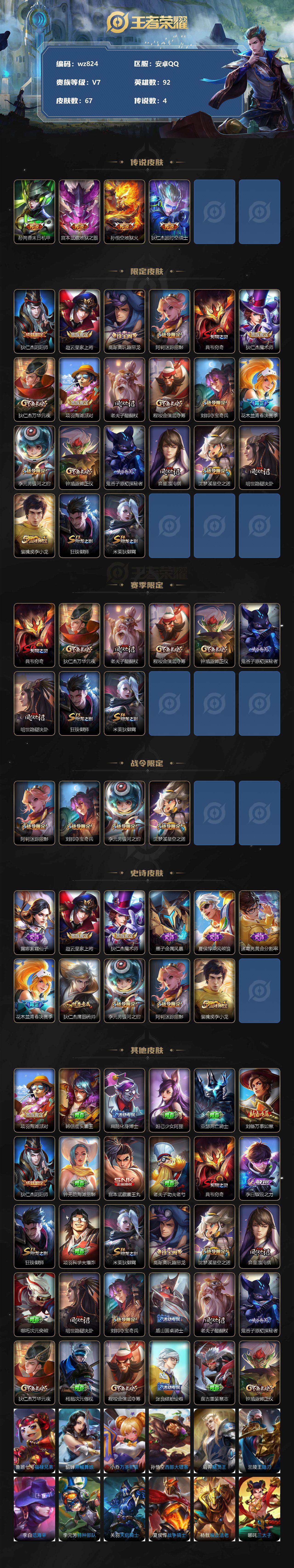 【账号佳】【王者荣耀】【编号:3339838】【可二次实名】【wz824】【商品标题】:安卓Q-V7-尊贵铂金II段位-92英雄-67皮肤-0典藏-0珍品无双-0无双-0珍品传说-4传说-11史诗 【传说皮肤】:孙尚香末日机甲,宫本武藏地狱之眼,孙悟空地狱火,狄仁杰超时空战士 【限定皮肤】:狄仁杰阴阳师,赵云皇家上将,高渐离玩趣恶龙,阿轲迷踪丽影,典韦穷奇,狄仁杰魔术师,狄仁杰万华元夜,项羽海滩派对,老夫子醍醐杖,程咬金演武夺筹,刘邦夺宝奇兵,花木兰青春决赛季,李元芳银河之约,钟馗驱傩正仪,鬼谷子原初探秘者,弈星混沌棋,沈梦溪星空之诺,明世隐疑决卦,裴擒虎李小龙,狂铁御狮,米莱狄御霄 【赛季限定】:典韦穷奇,狄仁杰万华元夜,老夫子醍醐杖,程咬金演武夺筹,钟馗驱傩正仪,鬼谷子原初探秘者,弈星混沌棋,明世隐疑决卦,狂铁御狮,米莱狄御霄 【战令限定】:阿轲迷踪丽影,刘邦夺宝奇兵,李元芳银河之约,沈梦溪星空之诺 【史诗皮肤】:露娜紫霞仙子,赵云皇家上将,狄仁杰魔术师,墨子金属风暴,夏侯惇乘风破浪,诸葛亮黄金分割率,花木兰青春决赛季,狄仁杰鹰眼统帅,李元芳银河之约,阿轲迷踪丽影,裴擒虎李小龙 【其他皮肤】:项羽海滩派对,韩信街头霸王,扁鹊化身博士,妲己少女阿狸,亚瑟死亡骑士,刘备万事如意,狄仁杰阴阳师,钟无艳海滩丽影,宫本武藏霸王丸,老夫子功夫老勺,典韦穷奇,李白敏锐之力,狂铁御狮,项羽科学大爆炸,米莱狄御霄,高渐离玩趣恶龙,沈梦溪星空之诺,弈星混沌棋,哪吒次元突破,明世隐疑决卦,刘邦夺宝奇兵,盾山圆桌骑士,老夫子醍醐杖,鬼谷子原初探秘者,狄仁杰万华元夜,杨戬次元傲视,程咬金演武夺筹,张良缤纷绘卷,盘古重装意志,钟馗驱傩正仪,鲁班七号福禄兄弟,貂蝉异域舞娘,小乔万圣前夜,孙悟空西部大镖客,后羿精灵王,兰陵王隐刃,李白范海辛,李元芳特种部队,关羽天启骑士,夏侯惇战争骑士,杨戬埃及法老,哪吒三太子,东皇太一东海龙王,鬼谷子阿摩司公爵,百里守约绝影神枪,百里玄策威尼斯狂欢,苏烈爱与和平,裴擒虎街头旋风,盾山极冰防御线,盘古创世神祝,曜归虚梦演,司空震启蛰 【内测皮肤】:高渐离玩趣恶龙 【营地ID】:2126582554