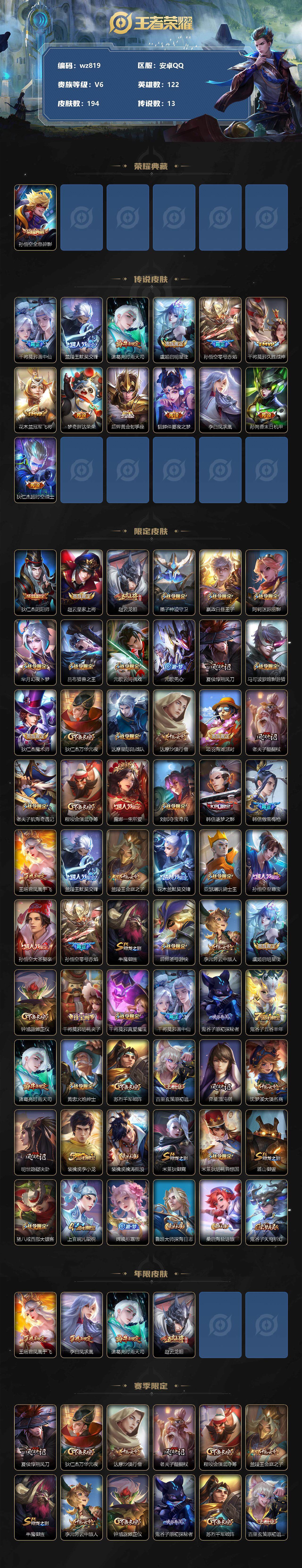 【账号佳】【王者荣耀】【编号:3339839】【可二次实名】【wz819】【商品标题】:安卓Q-V6-至尊星耀III段位-122英雄-194皮肤-1典藏-0珍品无双-0无双-0珍品传说-13传说-54史诗 【荣耀典藏】:孙悟空全息碎影 【传说皮肤】:干将莫邪画中仙,兰陵王默契交锋,诸葛亮时雨天司,虞姬启明星使,孙悟空零号赤焰,干将莫邪久胜战神,花木兰冠军飞将,梦奇胖达荣荣,后羿黄金射手座,貂蝉仲夏夜之梦,李白凤求凰,孙尚香末日机甲,狄仁杰超时空战士 【限定皮肤】:狄仁杰阴阳师,赵云皇家上将,赵云龙胆,墨子神迹守卫,嬴政白昼王子,阿轲迷踪丽影,芈月幻夜卜梦,吕布猎兽之王,元歌云间偶戏,元歌无心,夏侯惇朔风刀,马可波罗暗影游猎,狄仁杰魔术师,狄仁杰万华元夜,达摩星际陆战队,达摩沙漠行僧,项羽海滩派对,老夫子醍醐杖,老夫子航海奇遇记,程咬金演武夺筹,露娜一生所爱,刘邦夺宝奇兵,韩信逐梦之影,韩信傲雪梅枪,王昭君凤凰于飞,兰陵王默契交锋,兰陵王金庭之子,花木兰默契交锋,亚瑟潮玩骑士王,孙悟空至尊宝,孙悟空大圣娶亲,孙悟空零号赤焰,牛魔御旌,后羿圣弓游侠,李元芳云中旅人,虞姬启明星使,钟馗驱傩正仪,干将莫邪胡桃夹子,干将莫邪真爱魔法,干将莫邪画中仙,鬼谷子原初探秘者,鬼谷子五谷丰年,诸葛亮时雨天司,黄忠火炮绅士,苏烈千军破阵,百里玄策原初追逐者,弈星混沌棋,沈梦溪大漠名商,明世隐疑决卦,裴擒虎李小龙,裴擒虎擒涛扼浪,米莱狄御霄,米莱狄胡桃异想国,盾山御銮,猪八戒西部大镖客,上官婉儿梁祝,嫦娥拒霜思,鲁班大师探海日志,桑启海盐诗旅,鬼谷子天穹祈灯 【年限皮肤】:王昭君凤凰于飞,李白凤求凰,诸葛亮时雨天司,赵云龙胆 【赛季限定】:夏侯惇朔风刀,狄仁杰万华元夜,达摩沙漠行僧,老夫子醍醐杖,程咬金演武夺筹,兰陵王金庭之子,牛魔御旌,李元芳云中旅人,钟馗驱傩正仪,鬼谷子原初探秘者,苏烈千军破阵,百里玄策原初追逐者,弈星混沌棋,沈梦溪大漠名商,明世隐疑决卦,裴擒虎擒涛扼浪,米莱狄御霄,盾山御銮,鲁班大师探海日志,桑启海盐诗旅,鬼谷子天穹祈灯 【战令限定】:墨子神迹守卫,嬴政白昼王子,阿轲迷踪丽影,芈月幻夜卜梦,吕布猎兽之王,元歌云间偶戏,马可波罗暗影游猎,达摩星际陆战队,老夫子航海奇遇记,刘邦夺宝奇兵,亚瑟潮玩骑士王,后羿圣弓游侠,干将莫邪真爱魔法,黄忠火炮绅士,米莱狄胡桃异想国,猪八戒西部大镖客 【史诗皮肤】:鲁班七号电玩小子,露娜紫霞仙子,赵云皇家上将,赵云未来纪元,狄仁杰魔术师,孙尚香水果甜心,妲己魅力维加斯,妲己女仆咖啡,墨子金属风暴,吕布圣诞狂欢,刘禅绅士熊喵,李白千年之狐,吕布末日机甲,王昭君凤凰于飞,孙悟空至尊宝,刘邦德古拉伯爵,韩信逐梦之影,夏侯惇乘风破浪,兰陵王暗隐猎兽者,诸葛亮黄金分割率,雅典娜冰冠公主,安琪拉心灵骇客,百里守约特工魅影,蔡文姬舞动绿茵,李元芳逐浪之夏,程咬金功夫厨神,阿轲节奏热浪,嬴政白昼王子,孙策猫狗日记,露娜一生所爱,孙悟空大圣娶亲,狄仁杰鹰眼统帅,上官婉儿梁祝,娜可露露晚萤,不知火舞魅语,阿轲迷踪丽影,橘右京修罗,赵云龙胆,马可波罗暗影游猎,百里玄策原初追逐者,裴擒虎李小龙,元歌云间偶戏,花木兰默契交锋,米莱狄胡桃异想国,老夫子航海奇遇记,干将莫邪真爱魔法,嫦娥拒霜思,黄忠火炮绅士,韩信傲雪梅枪,澜赏金猎手,鬼谷子五谷丰年,元歌无心,刘禅电玩爆裂旋风,后羿石田雨龙 【其他皮肤】:项羽海滩派对,韩信教廷特使,韩信街头霸王,露娜哥特玫瑰,阿轲爱心护理,达摩大发明家,赵云忍炎影,程咬金爱与正义,牛魔西部大镖客,扁鹊化身博士,安琪拉玩偶对对碰,姜子牙时尚教父,妲己少女阿狸,典韦黄金武士,亚瑟死亡骑士,达摩拳王,花木兰兔女郎,甄姬花好人间,刘备万事如意,狄仁杰阴阳师,刘备纽约教父,刘备汉昭烈帝,关羽龙腾万里,钟无艳海滩丽影,宫本武藏霸王丸,王昭君幻想奇妙夜,老夫子功夫老勺,诸葛亮掌控之力,鬼谷子幻乐之宴,米莱狄御霄,吕布猎兽之王,明世隐虹云星官,牛魔御旌,吕布野性能量,盾山御銮,沈梦溪鲨炮海盗猫,夏侯惇朔风刀,弈星混沌棋,哪吒次元突破,鲁班七号黑桃队长,明世隐疑决卦,刘邦夺宝奇兵,盾山圆桌骑士,老夫子醍醐杖,猪八戒西部大镖客,狂铁特工战影,鬼谷子原初探秘者,狄仁杰万华元夜,亚瑟潮玩骑士王,刘禅秘密基地,杨戬次元傲视,露娜瓷语鉴心,达摩星际陆战队,程咬金演武夺筹,张良缤纷绘卷,钟馗驱傩正仪,墨子神迹守卫,鲁班大师乓乓大师,苏烈千军破阵,后羿圣弓游侠,干将莫邪胡桃夹子,达摩沙漠行僧,芈月幻夜卜梦,程咬金无双福将,兰陵王金庭之子,刘禅唤灵魔甲,沈梦溪大漠名商,李元芳云中旅人,桑启海盐诗旅,海月幻泉雾影,猪八戒潮玩探月行,白起乐园追猎者,裴擒虎擒涛扼浪,太乙真人劲辣红锅,莱西奥西部游侠,鲁班大师探海日志,姬小满零食大作战,李元芳妄想特派,鬼谷子天穹祈灯,廉颇功夫炙烤,姜子牙星梦