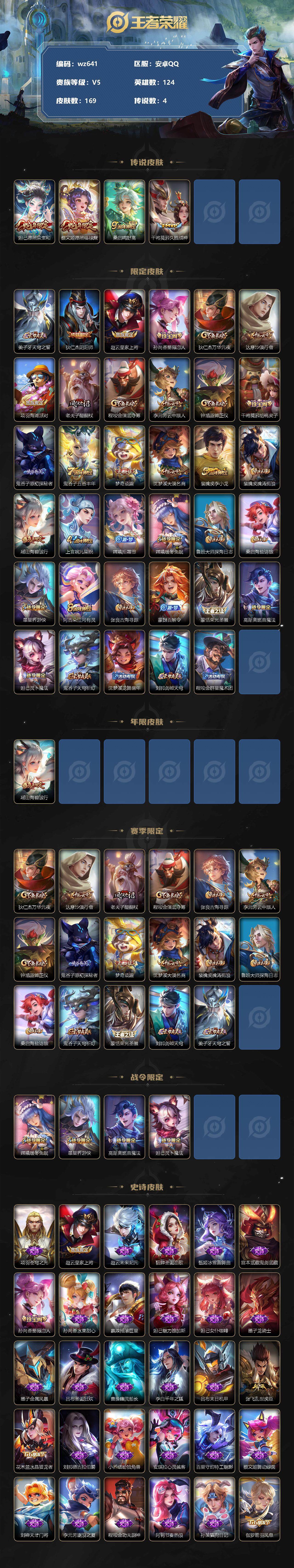 【账号佳】【王者荣耀】【编号:3339909】【可二次实名】【wz641】【商品标题】:安卓Q-V5-最强王者段位-124英雄-169皮肤-0典藏-0珍品无双-0无双-0珍品传说-4传说-49史诗 【传说皮肤】:妲己愿照众生和,蔡文姬愿照福禄聚,桑启鸣野蒿,干将莫邪久胜战神 【限定皮肤】:姜子牙天穹之誓,狄仁杰阴阳师,赵云皇家上将,孙尚香蔷薇恋人,狄仁杰万华元夜,达摩沙漠行僧,项羽海滩派对,老夫子醍醐杖,程咬金演武夺筹,李元芳云中旅人,钟馗驱傩正仪,干将莫邪胡桃夹子,鬼谷子原初探秘者,鬼谷子五谷丰年,梦奇顽趣,沈梦溪大漠名商,裴擒虎李小龙,裴擒虎擒涛扼浪,瑶山海碧波行,上官婉儿梁祝,嫦娥拒霜思,嫦娥暖冬兔眠,鲁班大师探海日志,桑启海盐诗旅,暃星界游侠,阿古朵江河有灵,张良古海寻踪,蒙犽百解令,蒙恬荣光圣徽,高渐离燃音魔法,妲己灵卜魔法,鬼谷子天穹祈灯,沈梦溪龙舞盛年,刘邦剑破天穹,程咬金群星魔术团 【年限皮肤】:瑶山海碧波行 【赛季限定】:狄仁杰万华元夜,达摩沙漠行僧,老夫子醍醐杖,程咬金演武夺筹,张良古海寻踪,李元芳云中旅人,钟馗驱傩正仪,鬼谷子原初探秘者,梦奇顽趣,沈梦溪大漠名商,裴擒虎擒涛扼浪,鲁班大师探海日志,桑启海盐诗旅,鬼谷子天穹祈灯,蒙恬荣光圣徽,刘邦剑破天穹,姜子牙天穹之誓 【战令限定】:嫦娥暖冬兔眠,暃星界游侠,高渐离燃音魔法,妲己灵卜魔法 【史诗皮肤】:项羽苍穹之光,赵云皇家上将,赵云未来纪元,貂蝉圣诞恋歌,甄姬冰雪圆舞曲,宫本武藏鬼剑武藏,孙尚香蔷薇恋人,孙尚香水果甜心,嬴政摇滚巨星,妲己魅力维加斯,妲己女仆咖啡,墨子龙骑士,墨子金属风暴,吕布圣诞狂欢,曹操幽灵船长,李白千年之狐,吕布末日机甲,张飞乱世虎臣,花木兰水晶猎龙者,刘邦德古拉伯爵,小乔缤纷独角兽,安琪拉心灵骇客,百里守约特工魅影,蔡文姬舞动绿茵,刘禅天才门将,李元芳逐浪之夏,程咬金功夫厨神,阿轲节奏热浪,孙策猫狗日记,伽罗箭羽风息,狄仁杰鹰眼统帅,上官婉儿梁祝,孙尚香时之恋人,裴擒虎李小龙,嫦娥拒霜思,鬼谷子五谷丰年,梦奇顽趣,暃星界游侠,瑶山海碧波行,刘禅电玩爆裂旋风,阿古朵江河有灵,蒙犽百解令,妲己灵卜魔法,高渐离燃音魔法,蒙恬荣光圣徽,牛魔星界战将,赵怀真器灵浮梦炉,后羿石田雨龙,黄忠百相守梦,公孙离涂山容容 【其他皮肤】:项羽海滩派对,韩信教廷特使,赵云忍炎影,白起白色死神,牛魔西部大镖客,武则天东方不败,扁鹊化身博士,扁鹊救世之瞳,宫本武藏未来纪元,安琪拉玩偶对对碰,孙膑天使之翼,姜子牙时尚教父,妲己少女阿狸,典韦黄金武士,亚瑟死亡骑士,花木兰兔女郎,张飞五福同心,甄姬花好人间,狄仁杰阴阳师,关羽龙腾万里,钟无艳海滩丽影,王昭君幻想奇妙夜,老夫子功夫老勺,孙尚香沉稳之力,诸葛亮掌控之力,鬼谷子幻乐之宴,大乔守护之力,明世隐虹云星官,孙膑归虚梦演,沈梦溪鲨炮海盗猫,姜子牙炽热元素使,哪吒次元突破,老夫子醍醐杖,狂铁特工战影,鬼谷子原初探秘者,狄仁杰万华元夜,刘禅秘密基地,露娜瓷语鉴心,程咬金演武夺筹,张良缤纷绘卷,钟馗驱傩正仪,鲁班大师乓乓大师,干将莫邪胡桃夹子,达摩沙漠行僧,程咬金无双福将,米莱狄契约魔法,沈梦溪大漠名商,李元芳云中旅人,桑启海盐诗旅,嫦娥暖冬兔眠,海月幻泉雾影,猪八戒潮玩探月行,裴擒虎擒涛扼浪,太乙真人劲辣红锅,鲁班大师探海日志,李元芳妄想特派,张良古海寻踪,钟无艳聚星闪耀,后羿完美运算,鬼谷子天穹祈灯,妲己灵卜魔法,朵莉亚金色潮汐,廉颇功夫炙烤,沈梦溪龙舞盛年,钟无艳春野之旅,刘邦剑破天穹,程咬金群星魔术团,姜子牙天穹之誓,盘古敬我三分,东皇太一噬灭天穹,米莱狄怪诞之夜,干将莫邪雾都夜雨,苍苍林狼骑,太乙真人谧流熔炉,典韦铁骨偃魂,西施雪境奇遇,姜子牙星梦巡礼,明世隐景韶洛都,戈娅玫蓝誓约,刘备浪漫序章,钟馗虚灵犬护,苏烈春野闲踪,张良灵野札记,阿古朵布丁狗之约,露娜命运加冕,姬小满小满鸭,甄姬逆浪荇歌,庄周锦麟游梦,莱西奥踏浪烽翎,鬼谷子克喵,哪吒罗小黑战记,鲁班七号福禄兄弟,貂蝉异域舞娘,花木兰剑舞者,曹操超能战警,小乔万圣前夜,孙膑未来旅行,虞姬加勒比小姐,关羽天启骑士,蔡文姬蔷薇王座,大乔伊势巫女,干将莫邪第七人偶,鬼谷子阿摩司公爵,铠龙域领主,女娲尼罗河女神,杨玉环霓裳曲,弈星踏雪寻梅,米莱狄精准探案法,司马懿魇语军师,上官婉儿修竹墨客,瑶森,曜归虚梦演,蒙犽归虚梦演,云缨赤焰之缨,金蝉前尘,暃碧珀绯影 【内测皮肤】:孙尚香蔷薇恋人,狂铁特工战影,干将莫邪胡桃夹子 【营地ID】:1868980153