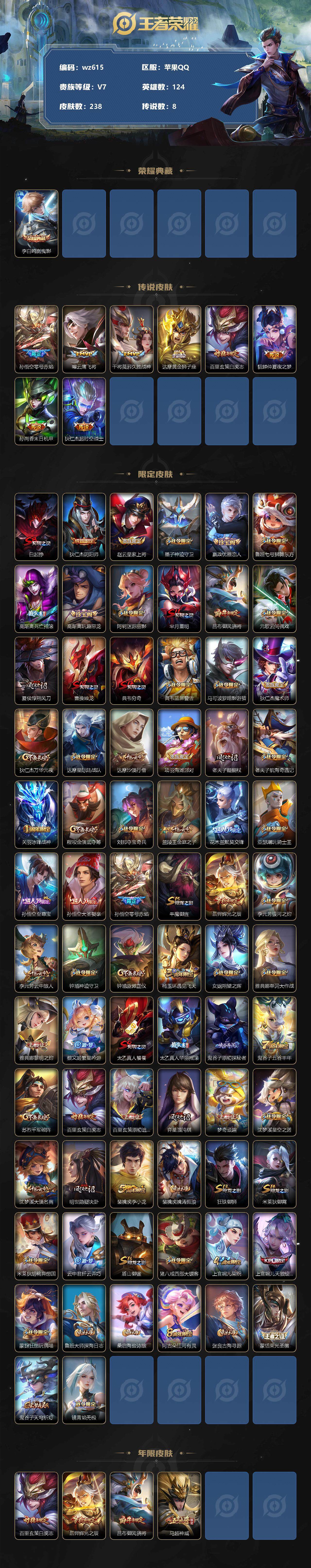 【账号佳】【王者荣耀】【编号:3339916】【可二次实名】【wz615】【商品标题】:苹果Q-V7-最强王者段位-124英雄-238皮肤-1典藏-0珍品无双-0无双-0珍品传说-8传说-69史诗 【荣耀典藏】:李白鸣剑曳影 【传说皮肤】:孙悟空零号赤焰,曜云鹰飞将,干将莫邪久胜战神,达摩黄金狮子座,百里玄策白虎志,貂蝉仲夏夜之梦,孙尚香末日机甲,狄仁杰超时空战士 【限定皮肤】:白起狰,狄仁杰阴阳师,赵云皇家上将,墨子神迹守卫,嬴政优雅恋人,鲁班七号狮舞东方,高渐离死亡摇滚,高渐离玩趣恶龙,阿轲迷踪丽影,芈月重明,吕布御风骁将,元歌云间偶戏,夏侯惇朔风刀,曹操烛龙,典韦穷奇,典韦蓝屏警告,马可波罗暗影游猎,狄仁杰魔术师,狄仁杰万华元夜,达摩星际陆战队,达摩沙漠行僧,项羽海滩派对,老夫子醍醐杖,老夫子航海奇遇记,关羽冰锋战神,程咬金演武夺筹,刘邦夺宝奇兵,兰陵王金庭之子,花木兰默契交锋,亚瑟潮玩骑士王,孙悟空至尊宝,孙悟空大圣娶亲,孙悟空零号赤焰,牛魔御旌,后羿辉光之辰,李元芳银河之约,李元芳云中旅人,钟馗神迹守卫,钟馗驱傩正仪,杨玉环遇见飞天,女娲朔望之晖,雅典娜单词大作战,雅典娜黎明之约,蔡文姬繁星吟游,太乙真人饕餮,太乙真人华丽摇滚,鬼谷子原初探秘者,鬼谷子五谷丰年,苏烈千军破阵,百里玄策白虎志,百里玄策原初追逐者,弈星混沌棋,梦奇顽趣,沈梦溪星空之诺,沈梦溪大漠名商,明世隐疑决卦,裴擒虎李小龙,裴擒虎擒涛扼浪,狂铁御狮,米莱狄御霄,米莱狄胡桃异想国,云中君纤云弄巧,盾山御銮,猪八戒西部大镖客,上官婉儿梁祝,上官婉儿天狼绘梦者,蒙犽狂想玩偶喵,鲁班大师探海日志,桑启海盐诗旅,阿古朵江河有灵,张良古海寻踪,蒙恬荣光圣徽,鬼谷子天穹祈灯,镜青焰无极 【年限皮肤】:百里玄策白虎志,后羿辉光之辰,吕布御风骁将,马超神威 【赛季限定】:白起狰,芈月重明,夏侯惇朔风刀,曹操烛龙,典韦穷奇,狄仁杰万华元夜,达摩沙漠行僧,老夫子醍醐杖,程咬金演武夺筹,兰陵王金庭之子,张良古海寻踪,牛魔御旌,李元芳云中旅人,钟馗驱傩正仪,雅典娜黎明之约,太乙真人饕餮,鬼谷子原初探秘者,苏烈千军破阵,百里玄策原初追逐者,弈星混沌棋,梦奇顽趣,沈梦溪大漠名商,明世隐疑决卦,裴擒虎擒涛扼浪,狂铁御狮,米莱狄御霄,盾山御銮,鲁班大师探海日志,桑启海盐诗旅,鬼谷子天穹祈灯,蒙恬荣光圣徽 【战令限定】:墨子神迹守卫,鲁班七号狮舞东方,阿轲迷踪丽影,元歌云间偶戏,典韦蓝屏警告,马可波罗暗影游猎,达摩星际陆战队,老夫子航海奇遇记,刘邦夺宝奇兵,亚瑟潮玩骑士王,李元芳银河之约,钟馗神迹守卫,女娲朔望之晖,雅典娜单词大作战,沈梦溪星空之诺,米莱狄胡桃异想国,猪八戒西部大镖客,蒙犽狂想玩偶喵,镜青焰无极 【史诗皮肤】:露娜紫霞仙子,赵云皇家上将,赵云未来纪元,貂蝉圣诞恋歌,甄姬冰雪圆舞曲,王昭君偶像歌手,狄仁杰魔术师,廉颇地狱岩魂,宫本武藏鬼剑武藏,孙尚香水果甜心,嬴政优雅恋人,嬴政摇滚巨星,妲己魅力维加斯,妲己女仆咖啡,墨子龙骑士,墨子金属风暴,吕布圣诞狂欢,曹操幽灵船长,李白千年之狐,张飞乱世虎臣,韩信白龙吟,关羽冰锋战神,孙悟空至尊宝,花木兰水晶猎龙者,刘邦德古拉伯爵,夏侯惇乘风破浪,小乔缤纷独角兽,诸葛亮黄金分割率,雅典娜冰冠公主,安琪拉心灵骇客,后羿辉光之辰,铠曙光守护者,刘禅天才门将,李元芳逐浪之夏,白起星夜王子,阿轲节奏热浪,杨玉环遇见飞天,孙悟空大圣娶亲,典韦蓝屏警告,鲁班七号狮舞东方,狄仁杰鹰眼统帅,上官婉儿梁祝,蔡文姬繁星吟游,李元芳银河之约,阿轲迷踪丽影,橘右京修罗,马超神威,上官婉儿天狼绘梦者,马可波罗暗影游猎,蒙犽狂想玩偶喵,百里玄策原初追逐者,裴擒虎李小龙,云中君纤云弄巧,元歌云间偶戏,吕布御风骁将,花木兰默契交锋,米莱狄胡桃异想国,老夫子航海奇遇记,雅典娜黎明之约,艾琳奇遇舞章,鬼谷子五谷丰年,梦奇顽趣,阿古朵江河有灵,蒙恬荣光圣徽,镜青焰无极,大司命东方月初,周瑜百相守梦,黄忠百相守梦,公孙离涂山容容 【其他皮肤】:项羽海滩派对,韩信教廷特使,韩信街头霸王,露娜哥特玫瑰,阿轲爱心护理,达摩大发明家,赵云白执事,赵云忍炎影,芈月红桃皇后,程咬金爱与正义,白起白色死神,扁鹊化身博士,孙膑天使之翼,姜子牙时尚教父,妲己少女阿狸,典韦黄金武士,亚瑟死亡骑士,达摩拳王,花木兰兔女郎,甄姬花好人间,宫本武藏万象初新,后羿阿尔法小队,狄仁杰阴阳师,刘备纽约教父,高渐离死亡摇滚,刘备汉昭烈帝,关羽龙腾万里,白起狰,钟无艳海滩丽影,太乙真人饕餮,宫本武藏霸王丸,曹操烛龙,王昭君幻想奇妙夜,芈月重明,狂铁命运角斗场,老夫子功夫老勺,孙尚香沉稳之力,典韦穷奇,诸葛亮掌控之力,鬼谷子幻乐之宴,狂铁御狮,太乙真人华丽摇滚,苏烈坚韧之力,大乔守护之力,项羽科学大爆炸,米莱狄御霄,明世隐虹云星官,庄周奇妙博物学,牛魔御旌,女娲朔望