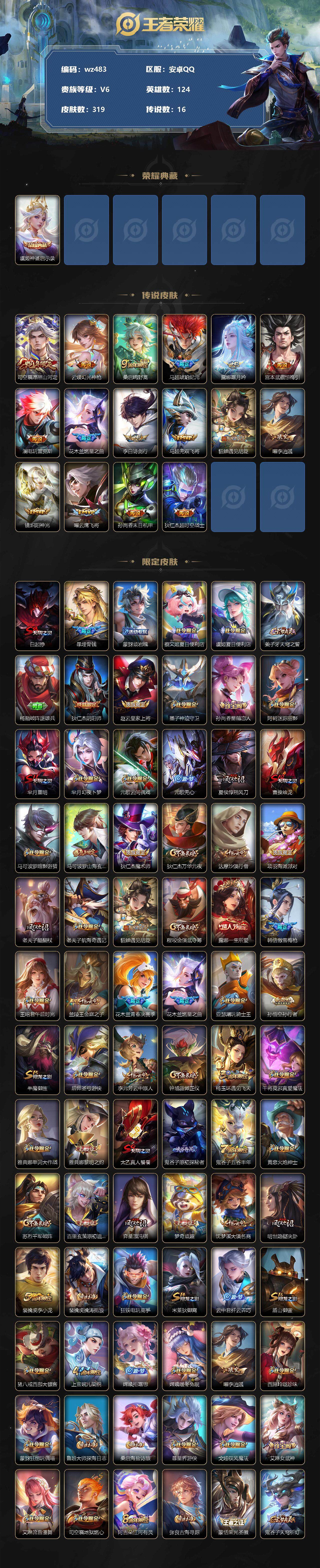 【账号佳】【王者荣耀】【编号:3339953】【可二次实名】【wz483】【商品标题】:安卓Q-V6-最强王者段位-124英雄-319皮肤-1典藏-0珍品无双-0无双-0珍品传说-16传说-84史诗 【荣耀典藏】:虞姬神鉴启示录 【传说皮肤】:司空震愿照山河定,云缨幻光神枪,桑启鸣野蒿,马超琥珀纪元,露娜霜月吟,宫本武藏惊梅引,澜电玩雷克斯,花木兰燃星之曲,李白诗剑行,马超无双飞将,貂蝉遇见胡旋,曜李逍遥 ,镜炽阳神光,曜云鹰飞将,孙尚香末日机甲,狄仁杰超时空战士 【限定皮肤】:白起狰,暃埋骨钱,蒙犽顽岩魄,蔡文姬夏日便利店,虞姬夏日便利店,姜子牙天穹之誓,杨戬破阵退雄兵,狄仁杰阴阳师,赵云皇家上将,墨子神迹守卫,孙尚香蔷薇恋人,阿轲迷踪丽影,芈月重明,芈月幻夜卜梦,元歌云间偶戏,元歌无心,夏侯惇朔风刀,曹操烛龙,马可波罗暗影游猎,马可波罗山海玄木吟,狄仁杰魔术师,狄仁杰万华元夜,达摩沙漠行僧,项羽海滩派对,老夫子醍醐杖,老夫子航海奇遇记,貂蝉遇见胡旋,程咬金演武夺筹,露娜一生所爱,韩信傲雪梅枪,王昭君午后时光,兰陵王金庭之子,花木兰青春决赛季,花木兰燃星之曲,亚瑟潮玩骑士王,孙悟空孙行者,牛魔御旌,后羿圣弓游侠,李元芳云中旅人,钟馗驱傩正仪,杨玉环遇见飞天,干将莫邪真爱魔法,雅典娜单词大作战,雅典娜黎明之约,太乙真人饕餮,鬼谷子原初探秘者,鬼谷子五谷丰年,黄忠火炮绅士,苏烈千军破阵,百里玄策原初追逐者,弈星混沌棋,梦奇顽趣,沈梦溪大漠名商,明世隐疑决卦,裴擒虎李小龙,裴擒虎擒涛扼浪,狂铁电玩高手,米莱狄御霄,云中君纤云弄巧,盾山御銮,猪八戒西部大镖客,上官婉儿梁祝,嫦娥拒霜思,嫦娥暖冬兔眠,曜李逍遥 ,西施玲珑珍味,蒙犽狂想玩偶喵,鲁班大师探海日志,桑启海盐诗旅,暃星界游侠,戈娅驭风魔法,艾琳女武神,艾琳流音漫舞,司空震地狱燃心,阿古朵江河有灵,张良古海寻踪,蒙恬荣光圣徽,鬼谷子天穹祈灯,伽罗琥珀纪元,马超琥珀纪元,姬小满妄想食味,沈梦溪龙舞盛年,鲁班七号蔬乡物语,李元芳蔬乡物语,刘邦剑破天穹,程咬金群星魔术团,关羽决胜骁骑,镜青焰无极,项羽苍威无极,周瑜熔金海岸 【年限皮肤】:马可波罗山海玄木吟 【赛季限定】:白起狰,芈月重明,夏侯惇朔风刀,曹操烛龙,狄仁杰万华元夜,达摩沙漠行僧,老夫子醍醐杖,程咬金演武夺筹,兰陵王金庭之子,张良古海寻踪,牛魔御旌,李元芳云中旅人,钟馗驱傩正仪,雅典娜黎明之约,太乙真人饕餮,鬼谷子原初探秘者,苏烈千军破阵,百里玄策原初追逐者,弈星混沌棋,梦奇顽趣,沈梦溪大漠名商,明世隐疑决卦,裴擒虎擒涛扼浪,米莱狄御霄,盾山御銮,鲁班大师探海日志,桑启海盐诗旅,鬼谷子天穹祈灯,蒙恬荣光圣徽,刘邦剑破天穹,姜子牙天穹之誓 【战令限定】:墨子神迹守卫,蔡文姬夏日便利店,虞姬夏日便利店,阿轲迷踪丽影,芈月幻夜卜梦,元歌云间偶戏,马可波罗暗影游猎,老夫子航海奇遇记,王昭君午后时光,艾琳流音漫舞,亚瑟潮玩骑士王,后羿圣弓游侠,干将莫邪真爱魔法,雅典娜单词大作战,黄忠火炮绅士,狂铁电玩高手,猪八戒西部大镖客,嫦娥暖冬兔眠,西施玲珑珍味,蒙犽狂想玩偶喵,司空震地狱燃心,暃星界游侠,戈娅驭风魔法,鲁班七号蔬乡物语,李元芳蔬乡物语,镜青焰无极,项羽苍威无极 【史诗皮肤】:项羽苍穹之光,阿轲暗夜猫娘,赵云皇家上将,赵云未来纪元,貂蝉圣诞恋歌,甄姬冰雪圆舞曲,王昭君偶像歌手,狄仁杰魔术师,廉颇地狱岩魂,宫本武藏鬼剑武藏,孙尚香蔷薇恋人,孙尚香水果甜心,嬴政摇滚巨星,妲己魅力维加斯,墨子金属风暴,吕布圣诞狂欢,曹操幽灵船长,张飞乱世虎臣,花木兰水晶猎龙者,刘邦德古拉伯爵,夏侯惇乘风破浪,小乔缤纷独角兽,兰陵王暗隐猎兽者,诸葛亮黄金分割率,亚瑟心灵战警,安琪拉心灵骇客,花木兰青春决赛季,百里守约特工魅影,刘禅天才门将,李元芳逐浪之夏,程咬金功夫厨神,白起星夜王子,阿轲节奏热浪,杨玉环遇见飞天,大乔猫狗日记,露娜一生所爱,伽罗箭羽风息,狄仁杰鹰眼统帅,公孙离无限星赏官,上官婉儿梁祝,不知火舞魅语,阿轲迷踪丽影,橘右京修罗,马可波罗暗影游猎,蒙犽狂想玩偶喵,百里玄策原初追逐者,裴擒虎李小龙,云中君纤云弄巧,元歌云间偶戏,老夫子航海奇遇记,干将莫邪真爱魔法,沈梦溪月团寄思,孙悟空孙行者,嫦娥拒霜思,黄忠火炮绅士,雅典娜黎明之约,韩信傲雪梅枪,夏洛特永昼,狂铁电玩高手,鬼谷子五谷丰年,元歌无心,梦奇顽趣,暃星界游侠,马可波罗山海玄木吟,杨玉环银翎春语,刘禅电玩爆裂旋风,戈娅驭风魔法,镜真我赫兹,司空震地狱燃心,阿古朵江河有灵,蒙恬荣光圣徽,伽罗琥珀纪元,姬小满妄想食味,鲁班七号蔬乡物语,镜青焰无极,关羽决胜骁骑,蔡文姬夏日便利店,蒙犽顽岩魄,暃埋骨钱,百里守约百相守梦,牛魔星界战将,赵怀真器灵浮梦炉,阿轲化蝶舞,狂铁龙之律动,黄忠百相守梦 【其他皮肤】:项羽海滩派对,韩信教廷特使,韩信街头霸王