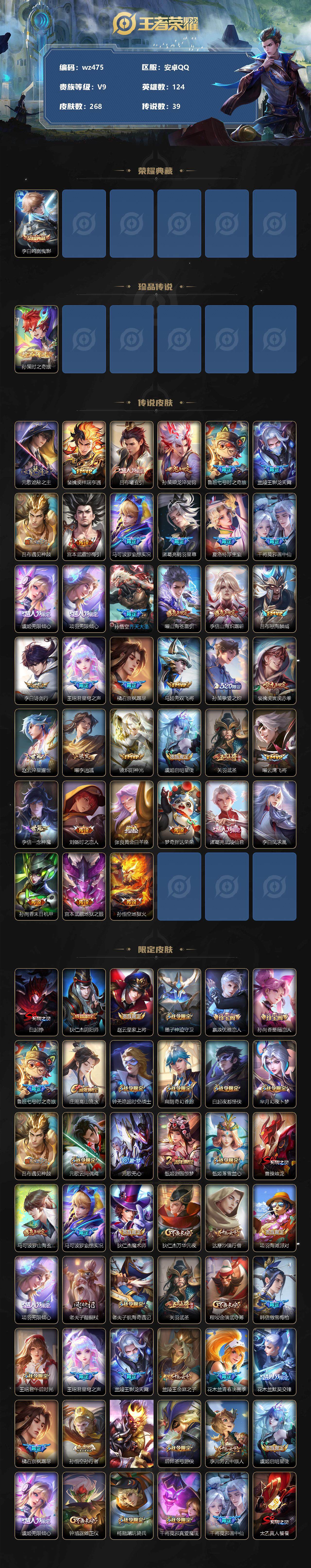 【账号佳】【王者荣耀】【编号:3339955】【可二次实名】【wz475】【商品标题】:安卓Q-V9-至尊星耀V段位-124英雄-268皮肤-1典藏-0珍品无双-0无双-1珍品传说-39传说-76史诗 【荣耀典藏】:李白鸣剑曳影 【珍品传说】:孙策时之奇旅 【传说皮肤】:元歌诡秘之主,裴擒虎祥瑞亨通,吕布曦玄引,孙策乘龙淬吴钩,鲁班七号时之奇旅,兰陵王影龙天霄,吕布遇见神鼓,宫本武藏惊梅引,马可波罗妄想实况,诸葛亮鹤羽星尊,夏洛特浮生妄,干将莫邪画中仙,虞姬无限倾心,项羽无限倾心,孙悟空齐天大圣,曜山海苍雷引,李信山海炽霜斩,吕布怒海麟威,李白诗剑行,王昭君星穹之声,橘右京枫霜尽,马超无双飞将,孙策挚爱之约,裴擒虎寅虎赤拳,赵云淬星耀世,曜李逍遥 ,镜炽阳神光,虞姬启明星使,关羽武圣,曜云鹰飞将,李信一念神魔,刘备时之恋人,张良黄金白羊座,梦奇胖达荣荣,诸葛亮武陵仙君,李白凤求凰,孙尚香末日机甲,宫本武藏地狱之眼,孙悟空地狱火 【限定皮肤】:白起狰,狄仁杰阴阳师,赵云皇家上将,墨子神迹守卫,嬴政优雅恋人,孙尚香蔷薇恋人,鲁班七号时之奇旅,庄周高山流水,钟无艳超时空战士,扁鹊奇幻香踪,白起夜都怪侠,芈月幻夜卜梦,吕布遇见神鼓,元歌云间偶戏,元歌无心,甄姬游园惊梦,甄姬落雪兰心,曹操烛龙,马可波罗山海玄木吟,马可波罗妄想实况,狄仁杰魔术师,狄仁杰万华元夜,达摩沙漠行僧,项羽海滩派对,项羽无限倾心,老夫子醍醐杖,老夫子航海奇遇记,关羽武圣,程咬金演武夺筹,韩信傲雪梅枪,王昭君午后时光,王昭君星穹之声,兰陵王影龙天霄,兰陵王金庭之子,花木兰青春决赛季,花木兰默契交锋,橘右京枫霜尽,孙悟空孙行者,孙悟空齐天大圣,后羿圣弓游侠,李元芳云中旅人,虞姬启明星使,虞姬无限倾心,钟馗驱傩正仪,杨戬潮玩骑兵,干将莫邪真爱魔法,干将莫邪画中仙,太乙真人饕餮,鬼谷子五谷丰年,诸葛亮武陵仙君,诸葛亮鹤羽星尊,黄忠烈魂,黄忠火炮绅士,苏烈千军破阵,弈星混沌棋,梦奇顽趣,公孙离玉兔公主,沈梦溪大漠名商,明世隐疑决卦,明世隐吟游魔法,裴擒虎李小龙,裴擒虎寅虎赤拳,裴擒虎擒涛扼浪,狂铁御狮,狂铁电玩高手,米莱狄御霄,云中君纤云弄巧,云中君时之祈愿,李信山海炽霜斩,伽罗天狼溯光者,孙策挚爱之约,上官婉儿梁祝,嫦娥拒霜思,嫦娥暖冬兔眠,曜李逍遥 ,曜山海苍雷引,西施玲珑珍味,鲁班大师探海日志,镜匿光追影者,桑启海盐诗旅,夏洛特浮生妄,暃星界游侠,戈娅驭风魔法,艾琳女武神,艾琳流音漫舞,司空震地狱燃心,阿古朵江河有灵,张良古海寻踪,蒙犽百解令,鬼谷子天穹祈灯,孙策乘龙淬吴钩,吕布曦玄引,李元芳蔬乡物语,刘邦剑破天穹,程咬金群星魔术团 【年限皮肤】:裴擒虎寅虎赤拳,李白凤求凰,关羽武圣,黄忠烈魂,马可波罗山海玄木吟,李信山海炽霜斩,曜山海苍雷引,孙策乘龙淬吴钩 【赛季限定】:白起狰,曹操烛龙,狄仁杰万华元夜,达摩沙漠行僧,老夫子醍醐杖,程咬金演武夺筹,兰陵王金庭之子,张良古海寻踪,李元芳云中旅人,钟馗驱傩正仪,太乙真人饕餮,苏烈千军破阵,弈星混沌棋,梦奇顽趣,沈梦溪大漠名商,明世隐疑决卦,裴擒虎擒涛扼浪,狂铁御狮,米莱狄御霄,鲁班大师探海日志,桑启海盐诗旅,鬼谷子天穹祈灯,刘邦剑破天穹 【战令限定】:墨子神迹守卫,钟无艳超时空战士,扁鹊奇幻香踪,白起夜都怪侠,芈月幻夜卜梦,元歌云间偶戏,甄姬落雪兰心,老夫子航海奇遇记,王昭君午后时光,艾琳流音漫舞,后羿圣弓游侠,杨戬潮玩骑兵,干将莫邪真爱魔法,黄忠火炮绅士,明世隐吟游魔法,狂铁电玩高手,嫦娥暖冬兔眠,西施玲珑珍味,司空震地狱燃心,暃星界游侠,戈娅驭风魔法,李元芳蔬乡物语 【史诗皮肤】:露娜紫霞仙子,阿轲暗夜猫娘,赵云皇家上将,赵云未来纪元,貂蝉圣诞恋歌,甄姬冰雪圆舞曲,王昭君偶像歌手,狄仁杰魔术师,廉颇地狱岩魂,宫本武藏鬼剑武藏,孙尚香蔷薇恋人,孙尚香水果甜心,嬴政优雅恋人,嬴政摇滚巨星,妲己魅力维加斯,妲己女仆咖啡,墨子金属风暴,曹操幽灵船长,李白千年之狐,吕布末日机甲,花木兰水晶猎龙者,夏侯惇乘风破浪,小乔缤纷独角兽,兰陵王暗隐猎兽者,诸葛亮黄金分割率,甄姬游园惊梦,亚瑟心灵战警,花木兰青春决赛季,铠曙光守护者,蔡文姬舞动绿茵,李元芳逐浪之夏,程咬金功夫厨神,白起星夜王子,阿轲节奏热浪,孙策猫狗日记,狄仁杰鹰眼统帅,上官婉儿梁祝,娜可露露晚萤,瑶遇见神鹿,黄忠烈魂,裴擒虎李小龙,云中君纤云弄巧,元歌云间偶戏,花木兰默契交锋,百里玄策热力回旋,老夫子航海奇遇记,伽罗天狼溯光者,干将莫邪真爱魔法,孙悟空孙行者,庄周高山流水,司马懿暗渊魔法,嫦娥拒霜思,镜匿光追影者,黄忠火炮绅士,韩信傲雪梅枪,云中君时之祈愿,夏洛特永昼,公孙离玉兔公主,澜赏金猎手,明世隐吟游魔法,狂铁电玩高手,钟无艳超时空战士,弈星滕王阁序,鬼谷子五谷丰年,元歌无心,梦奇顽趣,暃星界游侠,马可波罗山海玄木吟,