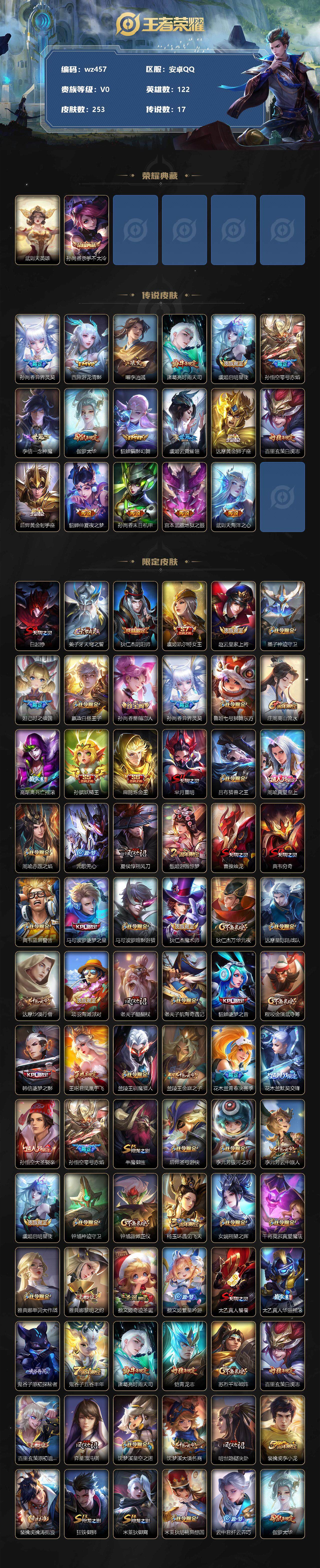 【账号佳】【王者荣耀】【编号:3339962】【可二次实名】【wz457】【商品标题】:安卓Q-V0-永恒钻石IV段位-122英雄-253皮肤-1典藏-0珍品无双-0无双-0珍品传说-17传说-76史诗 【荣耀典藏】:武则天英雄,孙尚香杀手不太冷 【传说皮肤】:孙尚香异界灵契,西施游龙清影,曜李逍遥 ,诸葛亮时雨天司,虞姬启明星使,孙悟空零号赤焰,李信一念神魔,伽罗太华,貂蝉猫影幻舞,虞姬云霓雀翎,达摩黄金狮子座,百里玄策白虎志,后羿黄金射手座,貂蝉仲夏夜之梦,孙尚香末日机甲,宫本武藏地狱之眼,武则天海洋之心 【限定皮肤】:白起狰,姜子牙天穹之誓,狄仁杰阴阳师,虞姬凯尔特女王,赵云皇家上将,墨子神迹守卫,妲己时之彼端,嬴政白昼王子,孙尚香蔷薇恋人,孙尚香异界灵契,鲁班七号狮舞东方,庄周高山流水,高渐离死亡摇滚,孙膑妖精王,扁鹊炼金王,芈月重明,吕布猎兽之王,周瑜真爱至上,周瑜赤莲之焰,元歌无心,夏侯惇朔风刀,甄姬游园惊梦,曹操烛龙,典韦穷奇,典韦蓝屏警告,马可波罗逐梦之星,马可波罗暗影游猎,狄仁杰魔术师,狄仁杰万华元夜,达摩星际陆战队,达摩沙漠行僧,项羽海滩派对,老夫子醍醐杖,老夫子航海奇遇记,貂蝉逐梦之音,程咬金演武夺筹,韩信逐梦之影,王昭君凤凰于飞,兰陵王驯魔猎人,兰陵王金庭之子,花木兰青春决赛季,花木兰默契交锋,孙悟空大圣娶亲,孙悟空零号赤焰,牛魔御旌,后羿圣弓游侠,李元芳银河之约,李元芳云中旅人,虞姬启明星使,钟馗神迹守卫,钟馗驱傩正仪,杨玉环遇见飞天,女娲朔望之晖,干将莫邪真爱魔法,雅典娜单词大作战,雅典娜黎明之约,蔡文姬奇迹圣诞,蔡文姬繁星吟游,太乙真人饕餮,太乙真人华丽摇滚,鬼谷子原初探秘者,鬼谷子五谷丰年,诸葛亮时雨天司,铠青龙志,苏烈千军破阵,百里玄策白虎志,百里玄策原初追逐者,弈星混沌棋,沈梦溪星空之诺,沈梦溪大漠名商,明世隐疑决卦,裴擒虎李小龙,裴擒虎擒涛扼浪,狂铁御狮,米莱狄御霄,米莱狄胡桃异想国,云中君纤云弄巧,伽罗太华,盾山御銮,猪八戒西部大镖客,猪八戒猪悟能,上官婉儿梁祝,嫦娥暖冬兔眠,曜李逍遥 ,蒙犽狂想玩偶喵,鲁班大师探海日志,桑启海盐诗旅,暃星界游侠,艾琳女武神,阿古朵江河有灵,张良古海寻踪,鬼谷子天穹祈灯,沈梦溪龙舞盛年,刘邦剑破天穹,周瑜熔金海岸 【年限皮肤】:百里玄策白虎志,铠青龙志,王昭君凤凰于飞,诸葛亮时雨天司,伽罗太华 【赛季限定】:孙膑妖精王,扁鹊炼金王,白起狰,芈月重明,夏侯惇朔风刀,曹操烛龙,典韦穷奇,狄仁杰万华元夜,达摩沙漠行僧,老夫子醍醐杖,程咬金演武夺筹,兰陵王金庭之子,张良古海寻踪,牛魔御旌,李元芳云中旅人,虞姬凯尔特女王,钟馗驱傩正仪,雅典娜黎明之约,太乙真人饕餮,鬼谷子原初探秘者,苏烈千军破阵,百里玄策原初追逐者,弈星混沌棋,沈梦溪大漠名商,明世隐疑决卦,裴擒虎擒涛扼浪,狂铁御狮,米莱狄御霄,盾山御銮,鲁班大师探海日志,桑启海盐诗旅,鬼谷子天穹祈灯,刘邦剑破天穹,姜子牙天穹之誓 【战令限定】:墨子神迹守卫,嬴政白昼王子,鲁班七号狮舞东方,吕布猎兽之王,周瑜赤莲之焰,典韦蓝屏警告,马可波罗暗影游猎,达摩星际陆战队,老夫子航海奇遇记,兰陵王驯魔猎人,后羿圣弓游侠,李元芳银河之约,钟馗神迹守卫,女娲朔望之晖,干将莫邪真爱魔法,雅典娜单词大作战,沈梦溪星空之诺,米莱狄胡桃异想国,猪八戒西部大镖客,嫦娥暖冬兔眠,蒙犽狂想玩偶喵,暃星界游侠 【史诗皮肤】:鲁班七号电玩小子,露娜紫霞仙子,赵云皇家上将,貂蝉圣诞恋歌,甄姬冰雪圆舞曲,狄仁杰魔术师,廉颇地狱岩魂,宫本武藏鬼剑武藏,孙尚香蔷薇恋人,孙尚香水果甜心,嬴政暗夜贵公子,妲己魅力维加斯,妲己女仆咖啡,墨子金属风暴,吕布圣诞狂欢,周瑜真爱至上,曹操幽灵船长,吕布末日机甲,韩信白龙吟,貂蝉逐梦之音,王昭君凤凰于飞,花木兰水晶猎龙者,刘邦德古拉伯爵,韩信逐梦之影,夏侯惇乘风破浪,小乔缤纷独角兽,兰陵王暗隐猎兽者,诸葛亮黄金分割率,甄姬游园惊梦,马可波罗逐梦之星,亚瑟心灵战警,雅典娜冰冠公主,安琪拉心灵骇客,花木兰青春决赛季,百里守约特工魅影,刘禅天才门将,李元芳逐浪之夏,程咬金功夫厨神,白起星夜王子,阿轲节奏热浪,杨玉环遇见飞天,蔡文姬奇迹圣诞,嬴政白昼王子,孙策猫狗日记,铠青龙志,孙悟空大圣娶亲,典韦蓝屏警告,伽罗箭羽风息,鲁班七号狮舞东方,狄仁杰鹰眼统帅,公孙离无限星赏官,兰陵王驯魔猎人,上官婉儿梁祝,蔡文姬繁星吟游,李元芳银河之约,娜可露露晚萤,妲己时之彼端,橘右京修罗,孙尚香时之恋人,马可波罗暗影游猎,蒙犽狂想玩偶喵,百里玄策原初追逐者,裴擒虎李小龙,云中君纤云弄巧,花木兰默契交锋,米莱狄胡桃异想国,老夫子航海奇遇记,干将莫邪真爱魔法,猪八戒猪悟能,庄周高山流水,雅典娜黎明之约,鬼谷子五谷丰年,元歌无心,暃星界游侠,刘禅电玩爆裂旋风,阿古朵江河有灵 【其他皮肤】:项羽海滩派对