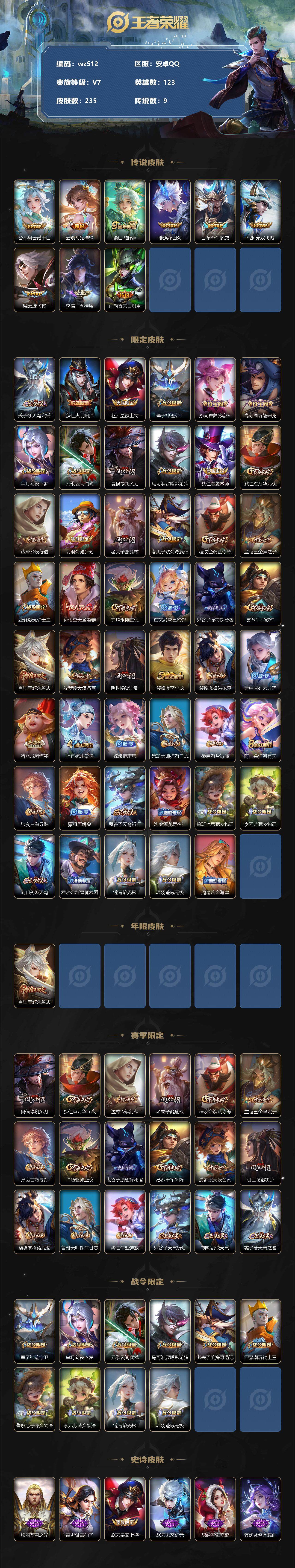 【账号佳】【王者荣耀】【编号:3339963】【可二次实名】【wz512】【商品标题】:安卓Q-V7-最强王者段位-123英雄-235皮肤-0典藏-0珍品无双-0无双-0珍品传说-9传说-58史诗 【传说皮肤】:公孙离云诺千山,云缨幻光神枪,桑启鸣野蒿,澜逐花归海,吕布怒海麟威,马超无双飞将,曜云鹰飞将,李信一念神魔,孙尚香末日机甲 【限定皮肤】:姜子牙天穹之誓,狄仁杰阴阳师,赵云皇家上将,墨子神迹守卫,孙尚香蔷薇恋人,高渐离玩趣恶龙,芈月幻夜卜梦,元歌云间偶戏,夏侯惇朔风刀,马可波罗暗影游猎,狄仁杰魔术师,狄仁杰万华元夜,达摩沙漠行僧,项羽海滩派对,老夫子醍醐杖,老夫子航海奇遇记,程咬金演武夺筹,兰陵王金庭之子,亚瑟潮玩骑士王,孙悟空大圣娶亲,钟馗驱傩正仪,蔡文姬繁星吟游,鬼谷子原初探秘者,苏烈千军破阵,百里守约朱雀志,沈梦溪大漠名商,明世隐疑决卦,裴擒虎李小龙,裴擒虎擒涛扼浪,云中君纤云弄巧,猪八戒猪悟能,上官婉儿梁祝,嫦娥拒霜思,鲁班大师探海日志,桑启海盐诗旅,阿古朵江河有灵,张良古海寻踪,蒙犽百解令,鬼谷子天穹祈灯,沈梦溪龙舞盛年,鲁班七号蔬乡物语,李元芳蔬乡物语,刘邦剑破天穹,程咬金群星魔术团,镜青焰无极,项羽苍威无极,周瑜熔金海岸 【年限皮肤】:百里守约朱雀志 【赛季限定】:夏侯惇朔风刀,狄仁杰万华元夜,达摩沙漠行僧,老夫子醍醐杖,程咬金演武夺筹,兰陵王金庭之子,张良古海寻踪,钟馗驱傩正仪,鬼谷子原初探秘者,苏烈千军破阵,沈梦溪大漠名商,明世隐疑决卦,裴擒虎擒涛扼浪,鲁班大师探海日志,桑启海盐诗旅,鬼谷子天穹祈灯,刘邦剑破天穹,姜子牙天穹之誓 【战令限定】:墨子神迹守卫,芈月幻夜卜梦,元歌云间偶戏,马可波罗暗影游猎,老夫子航海奇遇记,亚瑟潮玩骑士王,鲁班七号蔬乡物语,李元芳蔬乡物语,镜青焰无极,项羽苍威无极 【史诗皮肤】:项羽苍穹之光,露娜紫霞仙子,赵云皇家上将,赵云未来纪元,貂蝉圣诞恋歌,甄姬冰雪圆舞曲,王昭君偶像歌手,狄仁杰魔术师,廉颇地狱岩魂,宫本武藏鬼剑武藏,孙尚香蔷薇恋人,孙尚香水果甜心,嬴政暗夜贵公子,嬴政摇滚巨星,妲己魅力维加斯,妲己女仆咖啡,墨子金属风暴,吕布圣诞狂欢,曹操幽灵船长,李白千年之狐,韩信白龙吟,花木兰水晶猎龙者,刘邦德古拉伯爵,夏侯惇乘风破浪,小乔缤纷独角兽,兰陵王暗隐猎兽者,雅典娜冰冠公主,安琪拉心灵骇客,李元芳逐浪之夏,程咬金功夫厨神,阿轲节奏热浪,孙策猫狗日记,大乔猫狗日记,百里守约朱雀志,孙悟空大圣娶亲,狄仁杰鹰眼统帅,上官婉儿梁祝,蔡文姬繁星吟游,小乔青蛇,马可波罗暗影游猎,裴擒虎李小龙,云中君纤云弄巧,元歌云间偶戏,老夫子航海奇遇记,沈梦溪月团寄思,猪八戒猪悟能,嫦娥拒霜思,阿古朵江河有灵,蒙犽百解令,鲁班七号蔬乡物语,镜青焰无极,亚连破空之剑,百里守约百相守梦,牛魔星界战将,孙膑茶境仙,阿轲化蝶舞,狂铁龙之律动,扁鹊灵蛊蚀心 【其他皮肤】:项羽海滩派对,韩信教廷特使,韩信街头霸王,露娜哥特玫瑰,达摩大发明家,赵云白执事,赵云忍炎影,芈月红桃皇后,程咬金星际陆战队,白起白色死神,牛魔西部大镖客,扁鹊化身博士,扁鹊救世之瞳,宫本武藏未来纪元,安琪拉玩偶对对碰,孙膑天使之翼,妲己少女阿狸,典韦黄金武士,亚瑟死亡骑士,达摩拳王,花木兰兔女郎,张飞五福同心,甄姬花好人间,宫本武藏万象初新,后羿阿尔法小队,狄仁杰阴阳师,刘备汉昭烈帝,李元芳黑猫爱糖果,钟无艳海滩丽影,宫本武藏霸王丸,狂铁命运角斗场,老夫子功夫老勺,孙尚香沉稳之力,诸葛亮掌控之力,李白敏锐之力,鬼谷子幻乐之宴,苏烈坚韧之力,项羽科学大爆炸,明世隐虹云星官,庄周奇妙博物学,吕布野性能量,孙膑归虚梦演,高渐离玩趣恶龙,沈梦溪鲨炮海盗猫,姜子牙炽热元素使,夏侯惇朔风刀,哪吒次元突破,明世隐疑决卦,老夫子醍醐杖,狂铁特工战影,鬼谷子原初探秘者,狄仁杰万华元夜,亚瑟潮玩骑士王,刘禅秘密基地,杨戬次元傲视,露娜瓷语鉴心,程咬金演武夺筹,张良缤纷绘卷,钟馗驱傩正仪,墨子神迹守卫,鲁班大师乓乓大师,苏烈千军破阵,典韦铁甲之心,达摩沙漠行僧,芈月幻夜卜梦,程咬金无双福将,兰陵王金庭之子,米莱狄契约魔法,沈梦溪大漠名商,蒙犽胡桃狂想曲,蒙恬蔚蓝守将,刘备潮玩造梦师,桑启海盐诗旅,猪八戒潮玩探月行,裴擒虎擒涛扼浪,太乙真人劲辣红锅,鲁班大师探海日志,姬小满零食大作战,哪吒热血海滩,张良古海寻踪,亚连破局者,曹操决胜大满贯,后羿完美运算,程咬金暖冬絮语,鬼谷子天穹祈灯,海诺时空谍影,朵莉亚金色潮汐,廉颇功夫炙烤,亚瑟鸿运当头,沈梦溪龙舞盛年,钟无艳春野之旅,李元芳蔬乡物语,刘邦剑破天穹,程咬金群星魔术团,项羽苍威无极,大司命暗都幽影,姜子牙天穹之誓,周瑜熔金海岸,孙悟空神迹守卫,盘古敬我三分,东皇太一噬灭天穹,老夫子百相守梦,干将莫邪雾都夜雨,苍苍林狼骑,太乙真人谧流熔炉,典韦铁骨偃魂,马超访茗客