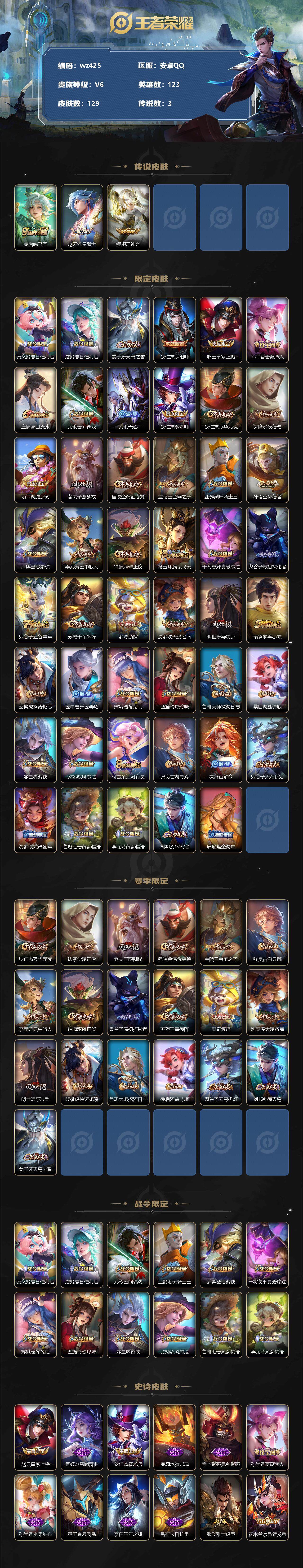 【账号佳】【王者荣耀】【编号:3339975】【可二次实名】【wz425】【商品标题】:安卓Q-V6-永恒钻石I段位-123英雄-129皮肤-0典藏-0珍品无双-0无双-0珍品传说-3传说-41史诗 【传说皮肤】:桑启鸣野蒿,赵云淬星耀世,镜炽阳神光 【限定皮肤】:蔡文姬夏日便利店,虞姬夏日便利店,姜子牙天穹之誓,狄仁杰阴阳师,赵云皇家上将,孙尚香蔷薇恋人,庄周高山流水,元歌云间偶戏,元歌无心,狄仁杰魔术师,狄仁杰万华元夜,达摩沙漠行僧,项羽海滩派对,老夫子醍醐杖,程咬金演武夺筹,兰陵王金庭之子,亚瑟潮玩骑士王,孙悟空孙行者,后羿圣弓游侠,李元芳云中旅人,钟馗驱傩正仪,杨玉环遇见飞天,干将莫邪真爱魔法,鬼谷子原初探秘者,鬼谷子五谷丰年,苏烈千军破阵,梦奇顽趣,沈梦溪大漠名商,明世隐疑决卦,裴擒虎李小龙,裴擒虎擒涛扼浪,云中君纤云弄巧,嫦娥暖冬兔眠,西施玲珑珍味,鲁班大师探海日志,桑启海盐诗旅,暃星界游侠,戈娅驭风魔法,阿古朵江河有灵,张良古海寻踪,蒙犽百解令,鬼谷子天穹祈灯,沈梦溪龙舞盛年,鲁班七号蔬乡物语,李元芳蔬乡物语,刘邦剑破天穹,周瑜熔金海岸 【赛季限定】:狄仁杰万华元夜,达摩沙漠行僧,老夫子醍醐杖,程咬金演武夺筹,兰陵王金庭之子,张良古海寻踪,李元芳云中旅人,钟馗驱傩正仪,鬼谷子原初探秘者,苏烈千军破阵,梦奇顽趣,沈梦溪大漠名商,明世隐疑决卦,裴擒虎擒涛扼浪,鲁班大师探海日志,桑启海盐诗旅,鬼谷子天穹祈灯,刘邦剑破天穹,姜子牙天穹之誓 【战令限定】:蔡文姬夏日便利店,虞姬夏日便利店,元歌云间偶戏,亚瑟潮玩骑士王,后羿圣弓游侠,干将莫邪真爱魔法,嫦娥暖冬兔眠,西施玲珑珍味,暃星界游侠,戈娅驭风魔法,鲁班七号蔬乡物语,李元芳蔬乡物语 【史诗皮肤】:赵云皇家上将,甄姬冰雪圆舞曲,狄仁杰魔术师,廉颇地狱岩魂,宫本武藏鬼剑武藏,孙尚香蔷薇恋人,孙尚香水果甜心,墨子金属风暴,李白千年之狐,吕布末日机甲,张飞乱世虎臣,花木兰水晶猎龙者,刘邦德古拉伯爵,夏侯惇乘风破浪,小乔缤纷独角兽,兰陵王暗隐猎兽者,程咬金功夫厨神,白起星夜王子,阿轲节奏热浪,杨玉环遇见飞天,孙策猫狗日记,狄仁杰鹰眼统帅,橘右京修罗,裴擒虎李小龙,云中君纤云弄巧,元歌云间偶戏,干将莫邪真爱魔法,孙悟空孙行者,庄周高山流水,鬼谷子五谷丰年,元歌无心,梦奇顽趣,暃星界游侠,戈娅驭风魔法,莱西奥末日机甲,阿古朵江河有灵,蒙犽百解令,周瑜雪夜绮愿,鲁班七号蔬乡物语,蔡文姬夏日便利店,大司命东方月初 【其他皮肤】:项羽海滩派对,韩信街头霸王,露娜哥特玫瑰,扁鹊化身博士,亚瑟死亡骑士,花木兰兔女郎,甄姬花好人间,狄仁杰阴阳师,刘备纽约教父,狂铁命运角斗场,孙尚香沉稳之力,李白敏锐之力,小乔丁香结,吕布野性能量,姜子牙炽热元素使,哪吒次元突破,明世隐疑决卦,盾山圆桌骑士,老夫子醍醐杖,鬼谷子原初探秘者,狄仁杰万华元夜,亚瑟潮玩骑士王,程咬金演武夺筹,钟馗驱傩正仪,鲁班大师乓乓大师,苏烈千军破阵,后羿圣弓游侠,达摩沙漠行僧,兰陵王金庭之子,刘禅唤灵魔甲,沈梦溪大漠名商,蒙恬蔚蓝守将,李元芳云中旅人,桑启海盐诗旅,嫦娥暖冬兔眠,海月幻泉雾影,牛魔牛运亨通,裴擒虎擒涛扼浪,太乙真人劲辣红锅,鲁班大师探海日志,西施玲珑珍味,李元芳妄想特派,张良古海寻踪,亚连破局者,曹操决胜大满贯,后羿完美运算,鬼谷子天穹祈灯,海诺时空谍影,朵莉亚金色潮汐,沈梦溪龙舞盛年,钟无艳春野之旅,李元芳蔬乡物语,扁鹊无尽旅途,刘邦剑破天穹,大司命暗都幽影,姜子牙天穹之誓,周瑜熔金海岸,虞姬夏日便利店,张良灵野札记,王昭君精灵公主,小乔万圣前夜,孙悟空西部大镖客,兰陵王隐刃,刘邦圣殿之光,马可波罗激情绿茵,杨戬埃及法老,哪吒三太子,黄忠芝加哥教父,百里守约绝影神枪,百里玄策威尼斯狂欢,裴擒虎街头旋风,弈星踏雪寻梅,元歌午夜歌剧院,孙策海之征途,伽罗花见巫女,李信灼热之刃,猪八戒年年有余,云中君荷鲁斯之眼,曜归虚梦演,马超幸存者,蒙犽归虚梦演,镜冰刃幻境,蒙恬秩序猎龙将,司空震启蛰,暃碧珀绯影 【内测皮肤】:孙尚香蔷薇恋人 【营地ID】:1863902096