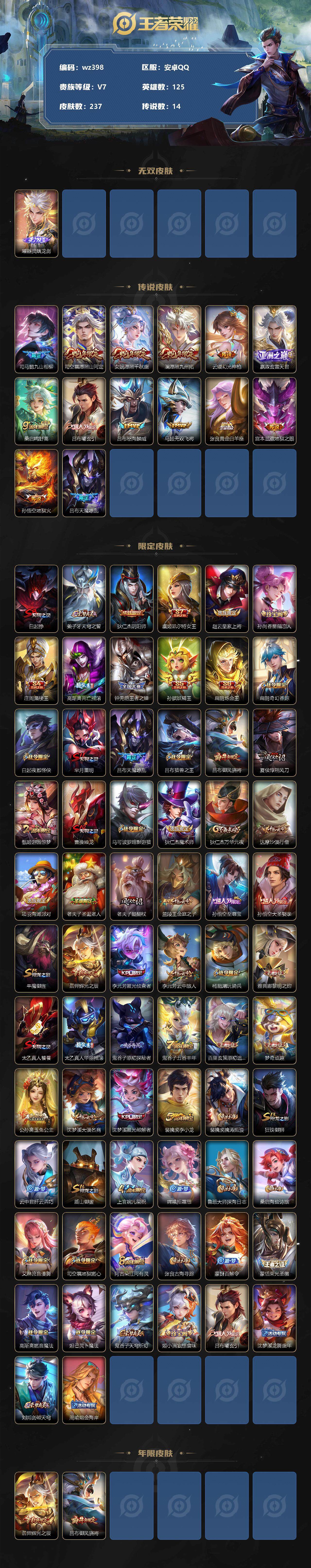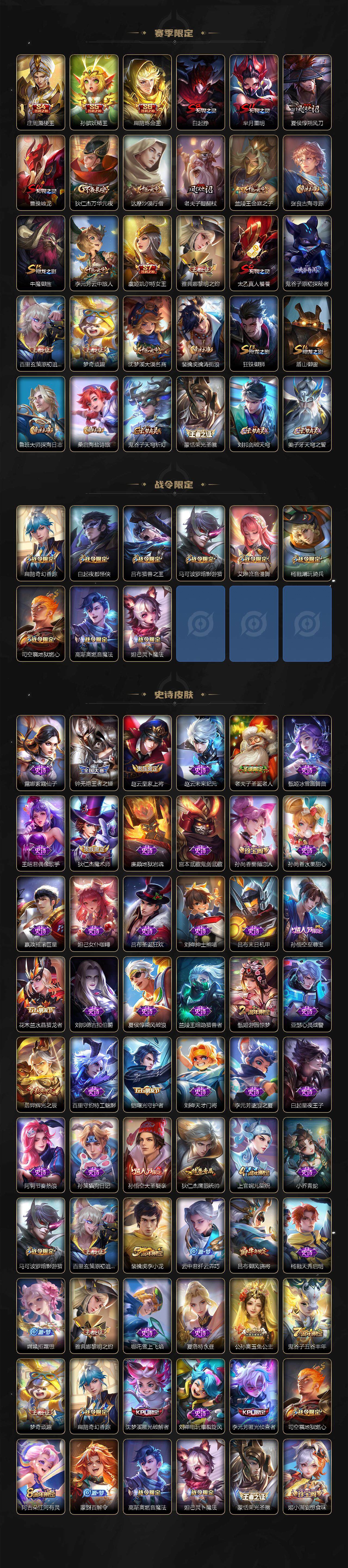 【账号佳】【王者荣耀】【编号:3339988】【可二次实名】【wz398】【商品标题】:安卓Q-V7-最强王者段位-125英雄-237皮肤-0典藏-0珍品无双-1无双-0珍品传说-14传说-68史诗 【无双皮肤】:曜器灵螭龙剑 【传说皮肤】:司马懿九山相柳,司空震愿照山河定,女娲愿照千秋盛,澜愿照九州拓,云缨幻光神枪,嬴政玄雷天君,桑启鸣野蒿,吕布曦玄引,吕布怒海麟威,马超无双飞将,张良黄金白羊座,宫本武藏地狱之眼,孙悟空地狱火,吕布天魔缭乱 【限定皮肤】:白起狰,姜子牙天穹之誓,狄仁杰阴阳师,虞姬凯尔特女王,赵云皇家上将,孙尚香蔷薇恋人,庄周蜃楼王,高渐离死亡摇滚,钟无艳王者之锤,孙膑妖精王,扁鹊炼金王,扁鹊奇幻香踪,白起夜都怪侠,芈月重明,吕布天魔缭乱,吕布猎兽之王,吕布御风骁将,夏侯惇朔风刀,甄姬游园惊梦,曹操烛龙,马可波罗暗影游猎,狄仁杰魔术师,狄仁杰万华元夜,达摩沙漠行僧,项羽海滩派对,老夫子圣诞老人,老夫子醍醐杖,兰陵王金庭之子,孙悟空至尊宝,孙悟空大圣娶亲,牛魔御旌,后羿辉光之辰,李元芳匿光侦查者,李元芳云中旅人,杨戬潮玩骑兵,雅典娜黎明之约,太乙真人饕餮,太乙真人华丽摇滚,鬼谷子原初探秘者,鬼谷子五谷丰年,百里玄策原初追逐者,梦奇顽趣,公孙离玉兔公主,沈梦溪大漠名商,沈梦溪匿光破解者,裴擒虎李小龙,裴擒虎擒涛扼浪,狂铁御狮,云中君纤云弄巧,盾山御銮,上官婉儿梁祝,嫦娥拒霜思,鲁班大师探海日志,桑启海盐诗旅,艾琳流音漫舞,司空震地狱燃心,阿古朵江河有灵,张良古海寻踪,蒙犽百解令,蒙恬荣光圣徽,高渐离燃音魔法,妲己灵卜魔法,鬼谷子天穹祈灯,姬小满妄想食味,吕布曦玄引,沈梦溪龙舞盛年,刘邦剑破天穹,周瑜熔金海岸 【年限皮肤】:后羿辉光之辰,吕布御风骁将 【赛季限定】:庄周蜃楼王,孙膑妖精王,扁鹊炼金王,白起狰,芈月重明,夏侯惇朔风刀,曹操烛龙,狄仁杰万华元夜,达摩沙漠行僧,老夫子醍醐杖,兰陵王金庭之子,张良古海寻踪,牛魔御旌,李元芳云中旅人,虞姬凯尔特女王,雅典娜黎明之约,太乙真人饕餮,鬼谷子原初探秘者,百里玄策原初追逐者,梦奇顽趣,沈梦溪大漠名商,裴擒虎擒涛扼浪,狂铁御狮,盾山御銮,鲁班大师探海日志,桑启海盐诗旅,鬼谷子天穹祈灯,蒙恬荣光圣徽,刘邦剑破天穹,姜子牙天穹之誓 【战令限定】:扁鹊奇幻香踪,白起夜都怪侠,吕布猎兽之王,马可波罗暗影游猎,艾琳流音漫舞,杨戬潮玩骑兵,司空震地狱燃心,高渐离燃音魔法,妲己灵卜魔法 【史诗皮肤】:露娜紫霞仙子,钟无艳王者之锤,赵云皇家上将,赵云未来纪元,老夫子圣诞老人,甄姬冰雪圆舞曲,王昭君偶像歌手,狄仁杰魔术师,廉颇地狱岩魂,宫本武藏鬼剑武藏,孙尚香蔷薇恋人,孙尚香水果甜心,嬴政摇滚巨星,妲己女仆咖啡,吕布圣诞狂欢,刘禅绅士熊喵,吕布末日机甲,孙悟空至尊宝,花木兰水晶猎龙者,刘邦德古拉伯爵,夏侯惇乘风破浪,兰陵王暗隐猎兽者,甄姬游园惊梦,亚瑟心灵战警,后羿辉光之辰,百里守约特工魅影,铠曙光守护者,刘禅天才门将,李元芳逐浪之夏,白起星夜王子,阿轲节奏热浪,孙策猫狗日记,孙悟空大圣娶亲,狄仁杰鹰眼统帅,上官婉儿梁祝,小乔青蛇,马可波罗暗影游猎,百里玄策原初追逐者,裴擒虎李小龙,云中君纤云弄巧,吕布御风骁将,杨戬天秀启明,嫦娥拒霜思,雅典娜黎明之约,哪吒雪上飞焰,夏洛特永昼,公孙离玉兔公主,鬼谷子五谷丰年,梦奇顽趣,扁鹊奇幻香踪,沈梦溪匿光破解者,刘禅电玩爆裂旋风,李元芳匿光侦查者,司空震地狱燃心,阿古朵江河有灵,蒙犽百解令,妲己灵卜魔法,高渐离燃音魔法,蒙恬荣光圣徽,姬小满妄想食味,亚连破空之剑,百里守约百相守梦,牛魔星界战将,孙膑茶境仙,赵怀真器灵浮梦炉,阿轲化蝶舞,狂铁龙之律动,黄忠百相守梦,朵莉亚幻珠鲛人 【其他皮肤】:项羽海滩派对,韩信教廷特使,韩信街头霸王,露娜哥特玫瑰,阿轲致命风华,赵云忍炎影,芈月红桃皇后,白起白色死神,牛魔西部大镖客,扁鹊化身博士,宫本武藏未来纪元,孙膑天使之翼,妲己少女阿狸,典韦黄金武士,亚瑟死亡骑士,达摩拳王,花木兰兔女郎,张飞五福同心,甄姬花好人间,宫本武藏万象初新,后羿阿尔法小队,狄仁杰阴阳师,庄周蜃楼王,刘备纽约教父,高渐离死亡摇滚,孙膑妖精王,扁鹊炼金王,关羽龙腾万里,虞姬凯尔特女王,白起狰,钟无艳海滩丽影,太乙真人饕餮,宫本武藏霸王丸,曹操烛龙,王昭君幻想奇妙夜,芈月重明,狂铁命运角斗场,老夫子功夫老勺,孙尚香沉稳之力,李白敏锐之力,鬼谷子幻乐之宴,狂铁御狮,太乙真人华丽摇滚,吕布猎兽之王,明世隐虹云星官,牛魔御旌,吕布野性能量,盾山御銮,孙膑归虚梦演,沈梦溪鲨炮海盗猫,姜子牙炽热元素使,夏侯惇朔风刀,哪吒次元突破,盾山圆桌骑士,老夫子醍醐杖,狂铁特工战影,鬼谷子原初探秘者,狄仁杰万华元夜,刘禅秘密基地,露娜瓷语鉴心,鲁班大师乓乓大师,达摩沙漠行僧,程咬金无双福将,白起夜都怪侠,兰陵王金庭之