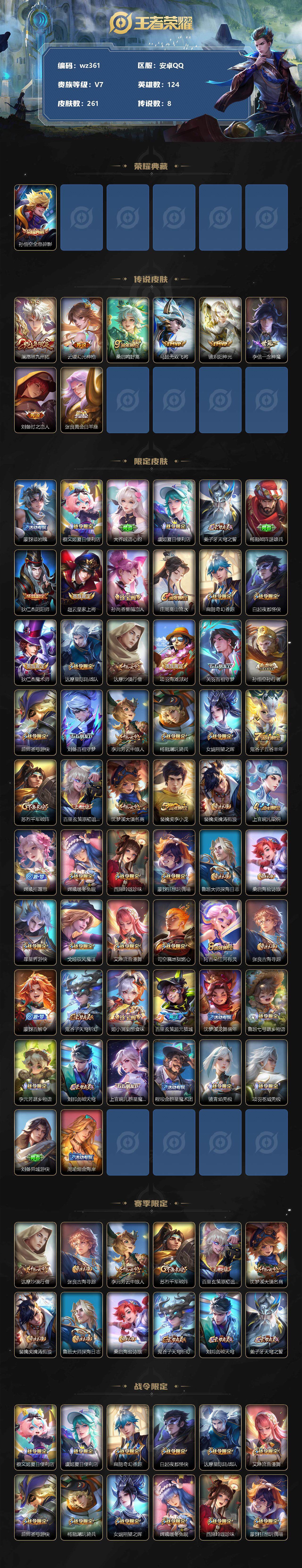 【账号佳】【王者荣耀】【编号:3339997】【可二次实名】【wz361】【商品标题】:安卓Q-V7-最强王者段位-124英雄-261皮肤-1典藏-0珍品无双-0无双-0珍品传说-8传说-65史诗 【荣耀典藏】:孙悟空全息碎影 【传说皮肤】:澜愿照九州拓,云缨幻光神枪,桑启鸣野蒿,马超无双飞将,镜炽阳神光,李信一念神魔,刘备时之恋人,张良黄金白羊座 【限定皮肤】:蒙犽顽岩魄,蔡文姬夏日便利店,大乔绒语心约,虞姬夏日便利店,姜子牙天穹之誓,杨戬破阵退雄兵,狄仁杰阴阳师,赵云皇家上将,孙尚香蔷薇恋人,庄周高山流水,扁鹊奇幻香踪,白起夜都怪侠,狄仁杰魔术师,达摩星际陆战队,达摩沙漠行僧,项羽海滩派对,关羽百相守梦,孙悟空孙行者,后羿圣弓游侠,刘备百相守梦,李元芳云中旅人,杨戬潮玩骑兵,女娲朔望之晖,鬼谷子五谷丰年,苏烈千军破阵,百里玄策原初追逐者,沈梦溪大漠名商,裴擒虎李小龙,裴擒虎擒涛扼浪,上官婉儿梁祝,嫦娥拒霜思,嫦娥暖冬兔眠,西施玲珑珍味,蒙犽狂想玩偶喵,鲁班大师探海日志,桑启海盐诗旅,暃星界游侠,戈娅驭风魔法,艾琳流音漫舞,司空震地狱燃心,阿古朵江河有灵,张良古海寻踪,蒙犽百解令,鬼谷子天穹祈灯,姬小满妄想食味,百里玄策超元猎域,沈梦溪龙舞盛年,鲁班七号蔬乡物语,李元芳蔬乡物语,刘邦剑破天穹,上官婉儿群星魔术团,程咬金群星魔术团,镜青焰无极,项羽苍威无极,刘备异域游侠,周瑜熔金海岸 【赛季限定】:达摩沙漠行僧,张良古海寻踪,李元芳云中旅人,苏烈千军破阵,百里玄策原初追逐者,沈梦溪大漠名商,裴擒虎擒涛扼浪,鲁班大师探海日志,桑启海盐诗旅,鬼谷子天穹祈灯,刘邦剑破天穹,姜子牙天穹之誓 【战令限定】:蔡文姬夏日便利店,虞姬夏日便利店,扁鹊奇幻香踪,白起夜都怪侠,达摩星际陆战队,艾琳流音漫舞,后羿圣弓游侠,杨戬潮玩骑兵,女娲朔望之晖,嫦娥暖冬兔眠,西施玲珑珍味,蒙犽狂想玩偶喵,司空震地狱燃心,暃星界游侠,戈娅驭风魔法,鲁班七号蔬乡物语,李元芳蔬乡物语,镜青焰无极,项羽苍威无极 【史诗皮肤】:露娜紫霞仙子,赵云皇家上将,赵云未来纪元,甄姬冰雪圆舞曲,王昭君偶像歌手,狄仁杰魔术师,廉颇地狱岩魂,宫本武藏鬼剑武藏,孙尚香蔷薇恋人,孙尚香水果甜心,墨子金属风暴,吕布圣诞狂欢,刘禅绅士熊喵,李白千年之狐,吕布末日机甲,张飞乱世虎臣,花木兰水晶猎龙者,夏侯惇乘风破浪,兰陵王暗隐猎兽者,诸葛亮黄金分割率,亚瑟心灵战警,安琪拉心灵骇客,铠曙光守护者,蔡文姬舞动绿茵,白起星夜王子,阿轲节奏热浪,孙策猫狗日记,狄仁杰鹰眼统帅,上官婉儿梁祝,蒙犽狂想玩偶喵,百里玄策原初追逐者,裴擒虎李小龙,钟馗乐园奇幻夜,孙悟空孙行者,庄周高山流水,司马懿暗渊魔法,嫦娥拒霜思,夏洛特永昼,澜赏金猎手,鬼谷子五谷丰年,暃星界游侠,扁鹊奇幻香踪,刘备百相守梦,关羽百相守梦,戈娅驭风魔法,镜真我赫兹,司空震地狱燃心,阿古朵江河有灵,蒙犽百解令,周瑜雪夜绮愿,姬小满妄想食味,百里玄策超元猎域,鲁班七号蔬乡物语,上官婉儿群星魔术团,镜青焰无极,黄忠怒海争锋,蔡文姬夏日便利店,蒙犽顽岩魄,姬小满战舞者,牛魔星界战将,孙膑茶境仙,赵怀真器灵浮梦炉,阿轲化蝶舞,刘禅鸭鸭历险记,狂铁龙之律动 【其他皮肤】:项羽海滩派对,韩信教廷特使,韩信街头霸王,露娜哥特玫瑰,阿轲爱心护理,达摩大发明家,赵云白执事,赵云忍炎影,芈月红桃皇后,白起白色死神,武则天东方不败,扁鹊化身博士,宫本武藏未来纪元,安琪拉玩偶对对碰,孙膑天使之翼,妲己少女阿狸,典韦黄金武士,亚瑟死亡骑士,达摩拳王,花木兰兔女郎,张飞五福同心,甄姬花好人间,刘备万事如意,宫本武藏万象初新,后羿阿尔法小队,狄仁杰阴阳师,刘备纽约教父,刘备汉昭烈帝,关羽龙腾万里,钟无艳海滩丽影,王昭君幻想奇妙夜,狂铁命运角斗场,老夫子功夫老勺,孙尚香沉稳之力,诸葛亮掌控之力,李白敏锐之力,鬼谷子幻乐之宴,大乔守护之力,明世隐虹云星官,张良幽兰居士,女娲朔望之晖,小乔丁香结,吕布野性能量,孙膑归虚梦演,沈梦溪鲨炮海盗猫,姜子牙炽热元素使,哪吒次元突破,鲁班七号黑桃队长,盾山圆桌骑士,狂铁特工战影,刘禅秘密基地,杨戬次元傲视,达摩星际陆战队,张良缤纷绘卷,鲁班大师乓乓大师,苏烈千军破阵,后羿圣弓游侠,达摩沙漠行僧,程咬金无双福将,刘邦虎啸剑宗,白起夜都怪侠,米莱狄契约魔法,沈梦溪大漠名商,蒙恬蔚蓝守将,李元芳云中旅人,戈娅危途狂花,刘备潮玩造梦师,桑启海盐诗旅,嫦娥暖冬兔眠,海月幻泉雾影,猪八戒潮玩探月行,白起乐园追猎者,赵怀真太极少年,裴擒虎擒涛扼浪,杨戬潮玩骑兵,太乙真人劲辣红锅,莱西奥西部游侠,鲁班大师探海日志,西施玲珑珍味,姬小满零食大作战,李元芳妄想特派,艾琳流音漫舞,张良古海寻踪,钟无艳聚星闪耀,海月王牌新星,亚连破局者,后羿完美运算,程咬金暖冬絮语,鬼谷子天穹祈灯,嫦娥漠中幻影,朵莉亚金色潮汐,廉颇