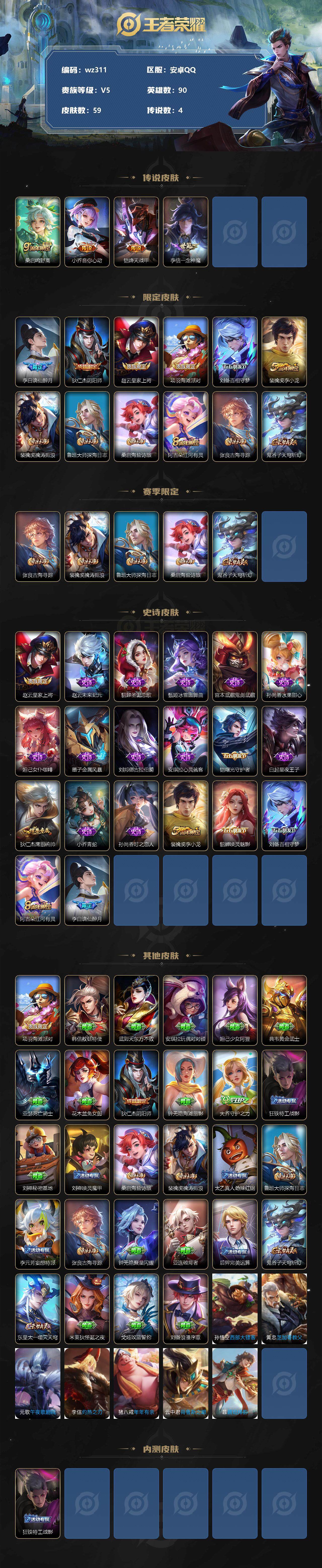 【账号佳】【王者荣耀】【编号:3339999】【可二次实名】【wz311】【商品标题】:安卓Q-V5-永恒钻石II段位-90英雄-59皮肤-0典藏-0珍品无双-0无双-0珍品传说-4传说-20史诗 【传说皮肤】:桑启鸣野蒿,小乔音你心动,铠绛天战甲,李信一念神魔 【限定皮肤】:李白谪仙醉月,狄仁杰阴阳师,赵云皇家上将,项羽海滩派对,刘备百相守梦,裴擒虎李小龙,裴擒虎擒涛扼浪,鲁班大师探海日志,桑启海盐诗旅,阿古朵江河有灵,张良古海寻踪,鬼谷子天穹祈灯 【赛季限定】:张良古海寻踪,裴擒虎擒涛扼浪,鲁班大师探海日志,桑启海盐诗旅,鬼谷子天穹祈灯 【史诗皮肤】:赵云皇家上将,赵云未来纪元,貂蝉圣诞恋歌,甄姬冰雪圆舞曲,宫本武藏鬼剑武藏,孙尚香水果甜心,妲己女仆咖啡,墨子金属风暴,刘邦德古拉伯爵,安琪拉心灵骇客,铠曙光守护者,白起星夜王子,狄仁杰鹰眼统帅,小乔青蛇,孙尚香时之恋人,裴擒虎李小龙,貂蝉唤灵魅影,刘备百相守梦,阿古朵江河有灵,李白谪仙醉月 【其他皮肤】:项羽海滩派对,韩信教廷特使,武则天东方不败,安琪拉玩偶对对碰,妲己少女阿狸,典韦黄金武士,亚瑟死亡骑士,花木兰兔女郎,狄仁杰阴阳师,钟无艳海滩丽影,大乔守护之力,狂铁特工战影,刘禅秘密基地,刘禅唤灵魔甲,桑启海盐诗旅,裴擒虎擒涛扼浪,太乙真人劲辣红锅,鲁班大师探海日志,李元芳妄想特派,张良古海寻踪,钟无艳聚星闪耀,亚连破局者,后羿完美运算,鬼谷子天穹祈灯,东皇太一噬灭天穹,米莱狄怪诞之夜,戈娅玫蓝誓约,刘备浪漫序章,孙悟空西部大镖客,黄忠芝加哥教父,元歌午夜歌剧院,李信灼热之刃,猪八戒年年有余,云中君荷鲁斯之眼,暃碧珀绯影 【内测皮肤】:狂铁特工战影 【营地ID】:1799617235