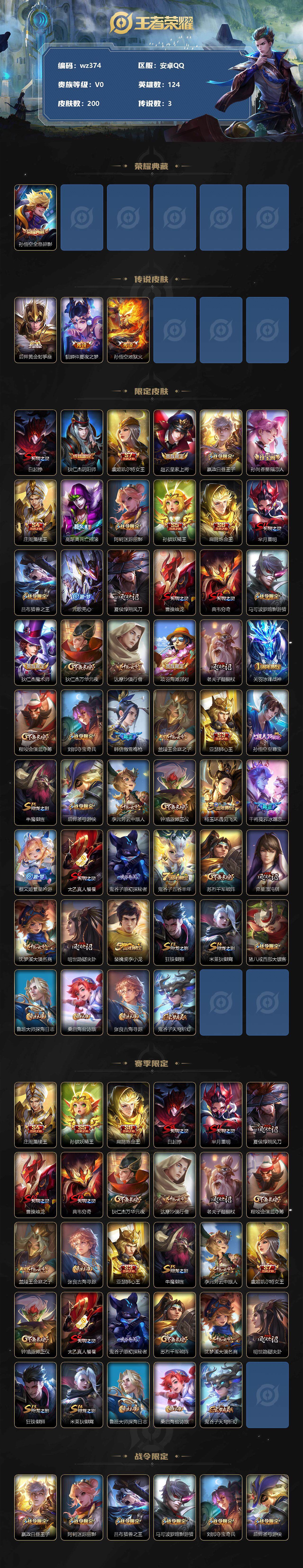 【账号佳】【王者荣耀】【编号:3340000】【可二次实名】【wz374】【商品标题】:安卓Q-V0-最强王者段位-124英雄-200皮肤-1典藏-0珍品无双-0无双-0珍品传说-3传说-44史诗 【荣耀典藏】:孙悟空全息碎影 【传说皮肤】:后羿黄金射手座,貂蝉仲夏夜之梦,孙悟空地狱火 【限定皮肤】:白起狰,狄仁杰阴阳师,虞姬凯尔特女王,赵云皇家上将,嬴政白昼王子,孙尚香蔷薇恋人,庄周蜃楼王,高渐离死亡摇滚,阿轲迷踪丽影,孙膑妖精王,扁鹊炼金王,芈月重明,吕布猎兽之王,元歌无心,夏侯惇朔风刀,曹操烛龙,典韦穷奇,马可波罗暗影游猎,狄仁杰魔术师,狄仁杰万华元夜,达摩沙漠行僧,项羽海滩派对,老夫子醍醐杖,关羽冰锋战神,程咬金演武夺筹,刘邦夺宝奇兵,韩信傲雪梅枪,兰陵王金庭之子,亚瑟狮心王,孙悟空至尊宝,牛魔御旌,后羿圣弓游侠,李元芳云中旅人,钟馗驱傩正仪,杨玉环遇见飞天,干将莫邪冰霜恋舞曲,蔡文姬繁星吟游,太乙真人饕餮,鬼谷子原初探秘者,鬼谷子五谷丰年,苏烈千军破阵,弈星混沌棋,沈梦溪大漠名商,明世隐疑决卦,裴擒虎李小龙,狂铁御狮,米莱狄御霄,猪八戒西部大镖客,鲁班大师探海日志,桑启海盐诗旅,张良古海寻踪,鬼谷子天穹祈灯 【赛季限定】:庄周蜃楼王,孙膑妖精王,扁鹊炼金王,白起狰,芈月重明,夏侯惇朔风刀,曹操烛龙,典韦穷奇,狄仁杰万华元夜,达摩沙漠行僧,老夫子醍醐杖,程咬金演武夺筹,兰陵王金庭之子,张良古海寻踪,亚瑟狮心王,牛魔御旌,李元芳云中旅人,虞姬凯尔特女王,钟馗驱傩正仪,太乙真人饕餮,鬼谷子原初探秘者,苏烈千军破阵,弈星混沌棋,沈梦溪大漠名商,明世隐疑决卦,狂铁御狮,米莱狄御霄,鲁班大师探海日志,桑启海盐诗旅,鬼谷子天穹祈灯 【战令限定】:嬴政白昼王子,阿轲迷踪丽影,吕布猎兽之王,马可波罗暗影游猎,刘邦夺宝奇兵,后羿圣弓游侠,猪八戒西部大镖客 【史诗皮肤】:露娜紫霞仙子,赵云皇家上将,貂蝉圣诞恋歌,甄姬冰雪圆舞曲,王昭君偶像歌手,狄仁杰魔术师,宫本武藏鬼剑武藏,孙尚香蔷薇恋人,孙尚香水果甜心,嬴政暗夜贵公子,嬴政摇滚巨星,妲己魅力维加斯,妲己女仆咖啡,墨子龙骑士,墨子金属风暴,吕布圣诞狂欢,曹操幽灵船长,吕布末日机甲,张飞乱世虎臣,韩信白龙吟,关羽冰锋战神,孙悟空至尊宝,花木兰水晶猎龙者,刘邦德古拉伯爵,夏侯惇乘风破浪,兰陵王暗隐猎兽者,诸葛亮黄金分割率,亚瑟心灵战警,雅典娜冰冠公主,阿轲节奏热浪,杨玉环遇见飞天,嬴政白昼王子,干将莫邪冰霜恋舞曲,狄仁杰鹰眼统帅,蔡文姬繁星吟游,不知火舞魅语,阿轲迷踪丽影,马可波罗暗影游猎,裴擒虎李小龙,韩信傲雪梅枪,鬼谷子五谷丰年,元歌无心,黄忠百相守梦,公孙离涂山容容 【其他皮肤】:项羽海滩派对,韩信教廷特使,韩信街头霸王,露娜哥特玫瑰,阿轲致命风华,阿轲爱心护理,达摩大发明家,赵云忍炎影,程咬金星际陆战队,程咬金爱与正义,白起白色死神,牛魔西部大镖客,扁鹊化身博士,宫本武藏未来纪元,安琪拉玩偶对对碰,姜子牙时尚教父,妲己少女阿狸,典韦黄金武士,亚瑟死亡骑士,达摩拳王,花木兰兔女郎,甄姬花好人间,宫本武藏万象初新,亚瑟狮心王,狄仁杰阴阳师,庄周蜃楼王,刘备纽约教父,高渐离死亡摇滚,孙膑妖精王,刘备汉昭烈帝,李元芳黑猫爱糖果,扁鹊炼金王,关羽龙腾万里,虞姬凯尔特女王,墨子进击墨子号,白起狰,钟无艳海滩丽影,太乙真人饕餮,宫本武藏霸王丸,曹操烛龙,王昭君幻想奇妙夜,芈月重明,狂铁命运角斗场,老夫子功夫老勺,孙尚香沉稳之力,典韦穷奇,李白敏锐之力,鬼谷子幻乐之宴,狂铁御狮,安琪拉如懿,大乔守护之力,米莱狄御霄,吕布猎兽之王,明世隐虹云星官,张良幽兰居士,牛魔御旌,吕布野性能量,沈梦溪鲨炮海盗猫,姜子牙炽热元素使,夏侯惇朔风刀,弈星混沌棋,哪吒次元突破,明世隐疑决卦,刘邦夺宝奇兵,盾山圆桌骑士,老夫子醍醐杖,猪八戒西部大镖客,廉颇无尽征程,鬼谷子原初探秘者,狄仁杰万华元夜,刘禅秘密基地,程咬金演武夺筹,张良缤纷绘卷,钟馗驱傩正仪,鲁班大师乓乓大师,苏烈千军破阵,后羿圣弓游侠,达摩沙漠行僧,程咬金无双福将,兰陵王金庭之子,沈梦溪大漠名商,李元芳云中旅人,桑启海盐诗旅,海月幻泉雾影,猪八戒潮玩探月行,鲁班大师探海日志,李元芳妄想特派,张良古海寻踪,鬼谷子天穹祈灯,海诺时空谍影,廉颇功夫炙烤,姜子牙星梦巡礼,钟馗虚灵犬护,阿古朵布丁狗之约,白起死霸装,甄姬逆浪荇歌,庄周锦麟游梦,莱西奥踏浪烽翎,鬼谷子克喵,鲁班七号福禄兄弟,高渐离金属狂潮,貂蝉异域舞娘,花木兰剑舞者,狄仁杰锦衣卫,曹操超能战警,张良一千零一夜,小乔万圣前夜,孙悟空西部大镖客,周瑜海军大将,后羿精灵王,兰陵王隐刃,李白范海辛,钟馗地府判官,李元芳特种部队,刘邦圣殿之光,虞姬加勒比小姐,关羽天启骑士,夏侯惇战争骑士,雅典娜战争女神,马可波罗激情绿茵,苍维京掠夺者,杨戬埃及法老,太乙真人圆桌骑士