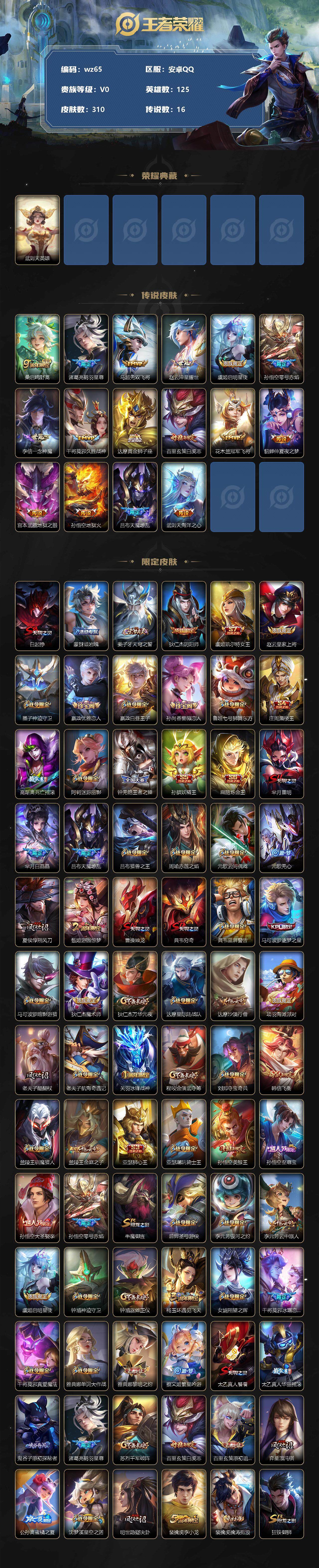 【账号佳】【王者荣耀】【编号:3340094】【可二次实名】【wz65】【商品标题】:安卓Q-V0-尊贵铂金II段位-125英雄-310皮肤-0典藏-0珍品无双-0无双-0珍品传说-16传说-84史诗 【荣耀典藏】:武则天英雄 【传说皮肤】:桑启鸣野蒿,诸葛亮鹤羽星尊,马超无双飞将,赵云淬星耀世,虞姬启明星使,孙悟空零号赤焰,李信一念神魔,干将莫邪久胜战神,达摩黄金狮子座,百里玄策白虎志,花木兰冠军飞将,貂蝉仲夏夜之梦,宫本武藏地狱之眼,孙悟空地狱火,吕布天魔缭乱,武则天海洋之心 【限定皮肤】:白起狰,蒙犽顽岩魄,姜子牙天穹之誓,狄仁杰阴阳师,虞姬凯尔特女王,赵云皇家上将,墨子神迹守卫,嬴政优雅恋人,嬴政白昼王子,孙尚香蔷薇恋人,鲁班七号狮舞东方,庄周蜃楼王,高渐离死亡摇滚,阿轲迷踪丽影,钟无艳王者之锤,孙膑妖精王,扁鹊炼金王,芈月重明,芈月白晶晶,吕布天魔缭乱,吕布猎兽之王,周瑜赤莲之焰,元歌云间偶戏,元歌无心,夏侯惇朔风刀,甄姬游园惊梦,曹操烛龙,典韦穷奇,典韦蓝屏警告,马可波罗逐梦之星,马可波罗暗影游猎,狄仁杰魔术师,狄仁杰万华元夜,达摩星际陆战队,达摩沙漠行僧,项羽海滩派对,老夫子醍醐杖,老夫子航海奇遇记,关羽冰锋战神,程咬金演武夺筹,刘邦夺宝奇兵,韩信飞衡,兰陵王驯魔猎人,兰陵王金庭之子,亚瑟狮心王,亚瑟潮玩骑士王,孙悟空美猴王,孙悟空至尊宝,孙悟空大圣娶亲,孙悟空零号赤焰,牛魔御旌,后羿圣弓游侠,李元芳银河之约,李元芳云中旅人,虞姬启明星使,钟馗神迹守卫,钟馗驱傩正仪,杨玉环遇见飞天,女娲朔望之晖,干将莫邪冰霜恋舞曲,干将莫邪真爱魔法,雅典娜单词大作战,雅典娜黎明之约,蔡文姬繁星吟游,太乙真人饕餮,太乙真人华丽摇滚,鬼谷子原初探秘者,诸葛亮鹤羽星尊,苏烈千军破阵,百里玄策白虎志,百里玄策原初追逐者,弈星混沌棋,公孙离蜜橘之夏,沈梦溪星空之诺,明世隐疑决卦,裴擒虎李小龙,裴擒虎擒涛扼浪,狂铁御狮,米莱狄御霄,米莱狄胡桃异想国,云中君纤云弄巧,伽罗天狼溯光者,盾山御銮,猪八戒西部大镖客,猪八戒猪悟能,上官婉儿梁祝,嫦娥拒霜思,蒙犽狂想玩偶喵,鲁班大师探海日志,桑启海盐诗旅,阿古朵江河有灵,张良古海寻踪,鬼谷子天穹祈灯,刘邦剑破天穹,周瑜熔金海岸 【年限皮肤】:百里玄策白虎志,孙悟空美猴王,韩信飞衡 【赛季限定】:庄周蜃楼王,孙膑妖精王,扁鹊炼金王,白起狰,芈月重明,夏侯惇朔风刀,曹操烛龙,典韦穷奇,狄仁杰万华元夜,达摩沙漠行僧,老夫子醍醐杖,程咬金演武夺筹,兰陵王金庭之子,张良古海寻踪,亚瑟狮心王,牛魔御旌,李元芳云中旅人,虞姬凯尔特女王,钟馗驱傩正仪,雅典娜黎明之约,太乙真人饕餮,鬼谷子原初探秘者,苏烈千军破阵,百里玄策原初追逐者,弈星混沌棋,明世隐疑决卦,裴擒虎擒涛扼浪,狂铁御狮,米莱狄御霄,盾山御銮,鲁班大师探海日志,桑启海盐诗旅,鬼谷子天穹祈灯,刘邦剑破天穹,姜子牙天穹之誓 【战令限定】:墨子神迹守卫,嬴政白昼王子,鲁班七号狮舞东方,阿轲迷踪丽影,吕布猎兽之王,周瑜赤莲之焰,元歌云间偶戏,典韦蓝屏警告,马可波罗暗影游猎,达摩星际陆战队,老夫子航海奇遇记,刘邦夺宝奇兵,兰陵王驯魔猎人,亚瑟潮玩骑士王,后羿圣弓游侠,李元芳银河之约,钟馗神迹守卫,女娲朔望之晖,干将莫邪真爱魔法,雅典娜单词大作战,沈梦溪星空之诺,米莱狄胡桃异想国,猪八戒西部大镖客,蒙犽狂想玩偶喵 【史诗皮肤】:鲁班七号电玩小子,露娜紫霞仙子,钟无艳王者之锤,赵云皇家上将,赵云未来纪元,貂蝉圣诞恋歌,甄姬冰雪圆舞曲,王昭君偶像歌手,狄仁杰魔术师,廉颇地狱岩魂,宫本武藏鬼剑武藏,孙尚香蔷薇恋人,孙尚香水果甜心,嬴政优雅恋人,嬴政暗夜贵公子,嬴政摇滚巨星,妲己魅力维加斯,妲己女仆咖啡,墨子金属风暴,吕布圣诞狂欢,刘禅绅士熊喵,曹操幽灵船长,李白千年之狐,吕布末日机甲,张飞乱世虎臣,韩信白龙吟,关羽冰锋战神,孙悟空至尊宝,花木兰水晶猎龙者,刘邦德古拉伯爵,夏侯惇乘风破浪,小乔缤纷独角兽,兰陵王暗隐猎兽者,诸葛亮黄金分割率,甄姬游园惊梦,马可波罗逐梦之星,亚瑟心灵战警,雅典娜冰冠公主,安琪拉心灵骇客,百里守约特工魅影,铠曙光守护者,蔡文姬舞动绿茵,刘禅天才门将,公孙离蜜橘之夏,李元芳逐浪之夏,程咬金功夫厨神,白起星夜王子,阿轲节奏热浪,杨玉环遇见飞天,嬴政白昼王子,孙策猫狗日记,大乔猫狗日记,干将莫邪冰霜恋舞曲,孙悟空大圣娶亲,典韦蓝屏警告,伽罗箭羽风息,鲁班七号狮舞东方,狄仁杰鹰眼统帅,兰陵王驯魔猎人,上官婉儿梁祝,蔡文姬繁星吟游,李元芳银河之约,韩信飞衡,大乔白蛇,阿轲迷踪丽影,橘右京修罗,马可波罗暗影游猎,蒙犽狂想玩偶喵,百里玄策原初追逐者,裴擒虎李小龙,云中君纤云弄巧,元歌云间偶戏,芈月白晶晶,米莱狄胡桃异想国,老夫子航海奇遇记,伽罗天狼溯光者,干将莫邪真爱魔法,沈梦溪月团寄思,猪八戒猪悟能,嫦娥拒霜思,雅
